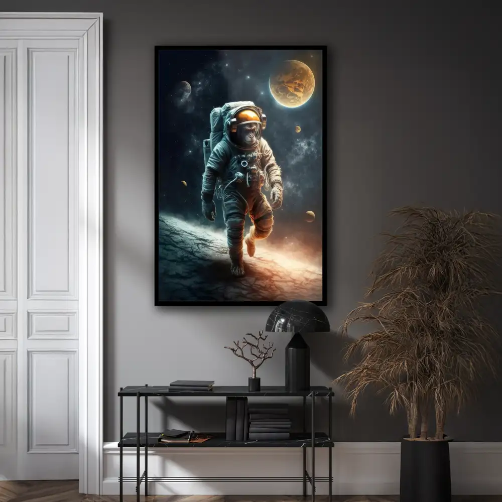 Det er ikke hver dag man ser en ape ta en spasertur på en annen planet. Dette motivet kombinerer science fiction, humor og fantasifull design i ett og samme uttrykk. Fullt utstyrt i romdrakt og omgitt av planeter og stjernestøv blir dette en plakat som både overrasker og underholder.