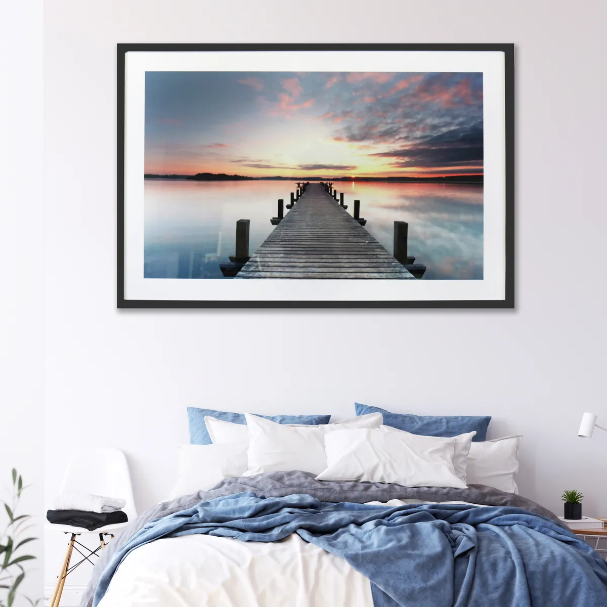 Vakkert maleri med motiv av en brygge i en herlig solnedgang som farger både himmel og hav. Høykvalitetstrykk på tykt papir med plexiglassark og en matt sort treramme.