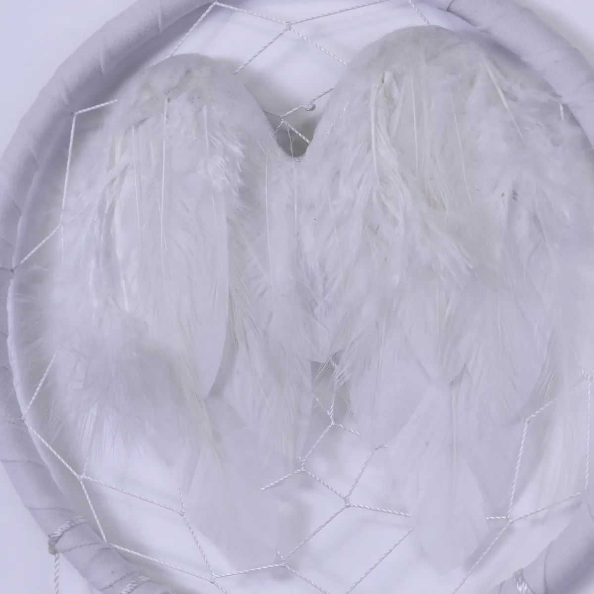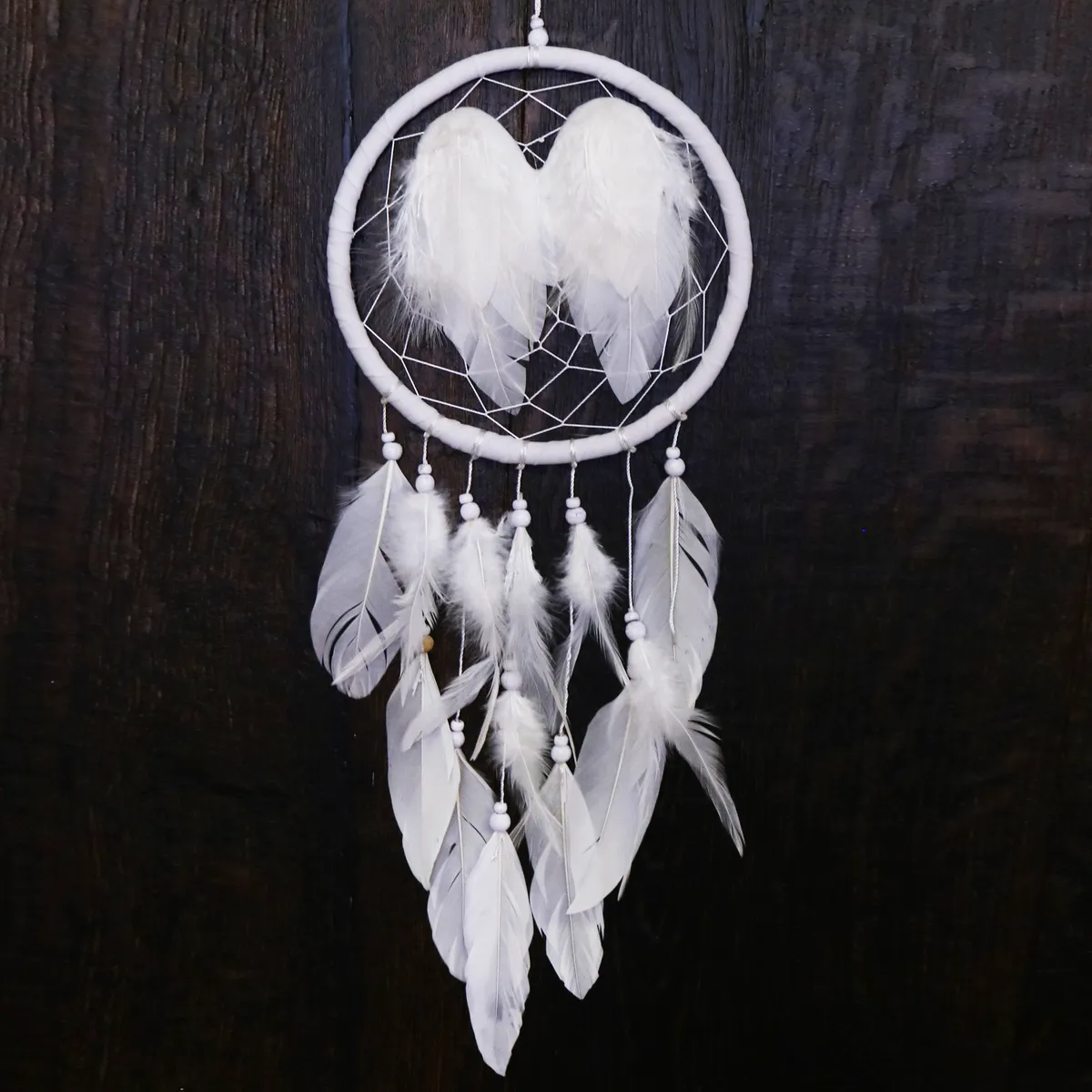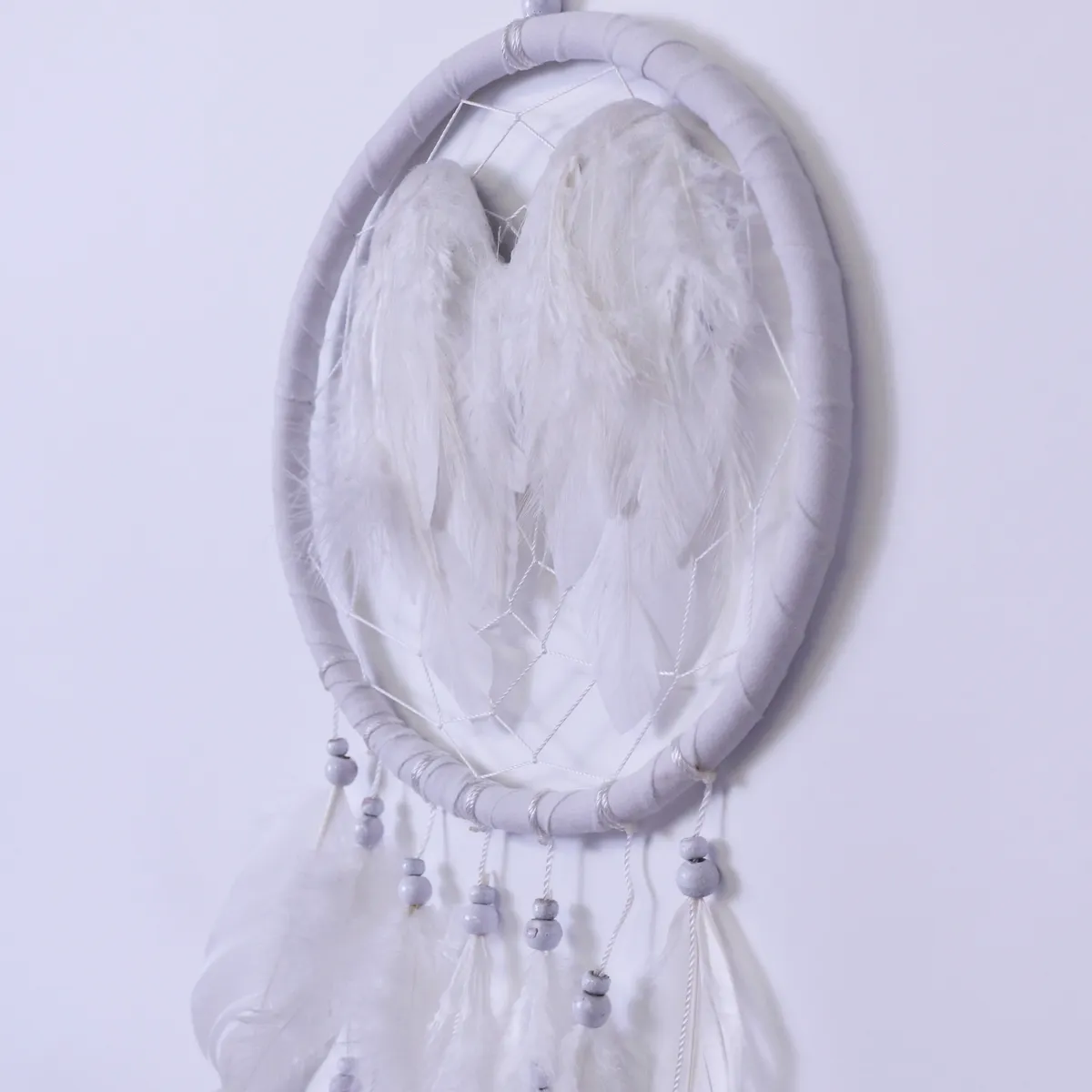 Fin håndlaget drømmefanger med fjær i midten som ser ut som englevinger. Laget av naturlige materialer med perler, stoff og fjær. Hver drømmefanger er håndlaget og unik, kan variere litt i størrelse.