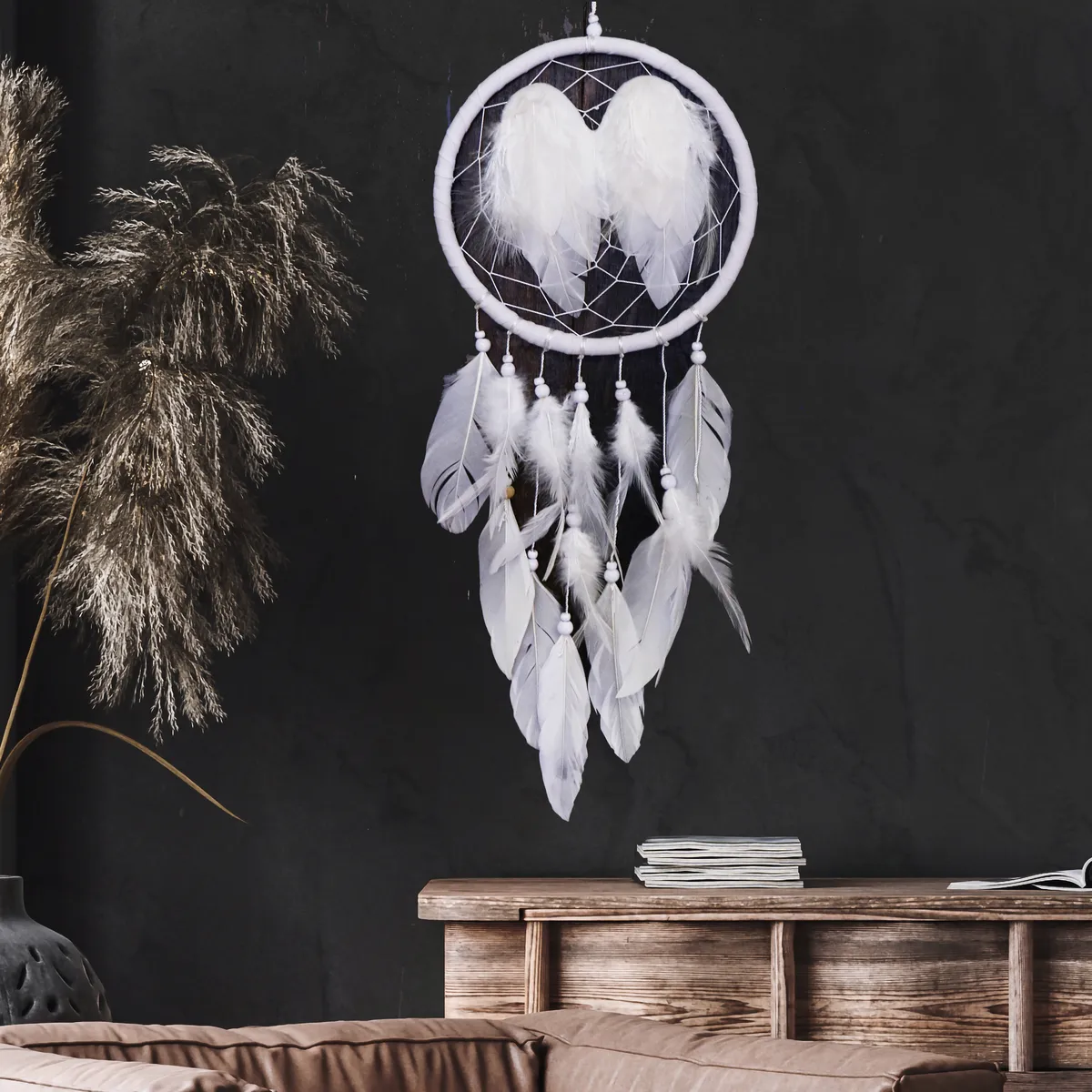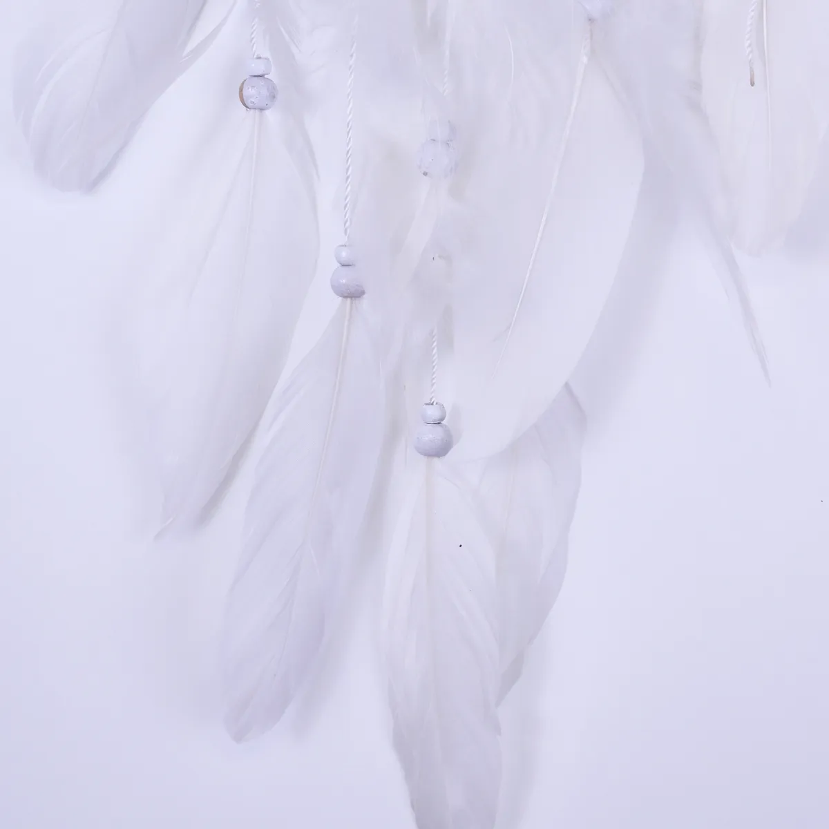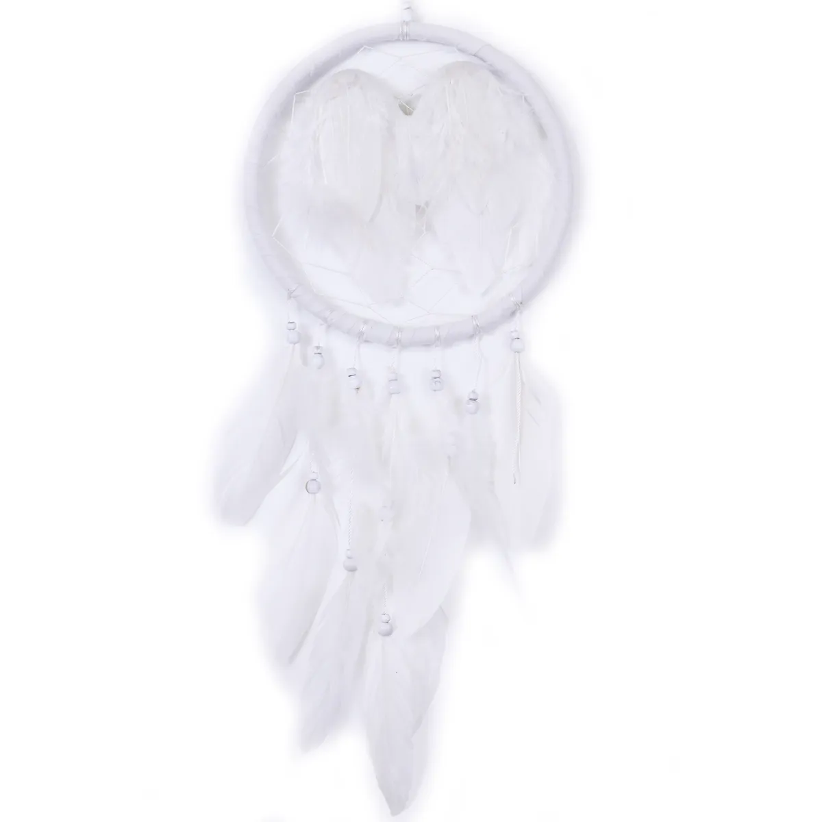 Fin håndlaget drømmefanger med fjær i midten som ser ut som englevinger. Laget av naturlige materialer med perler, stoff og fjær. Hver drømmefanger er håndlaget og unik, kan variere litt i størrelse.