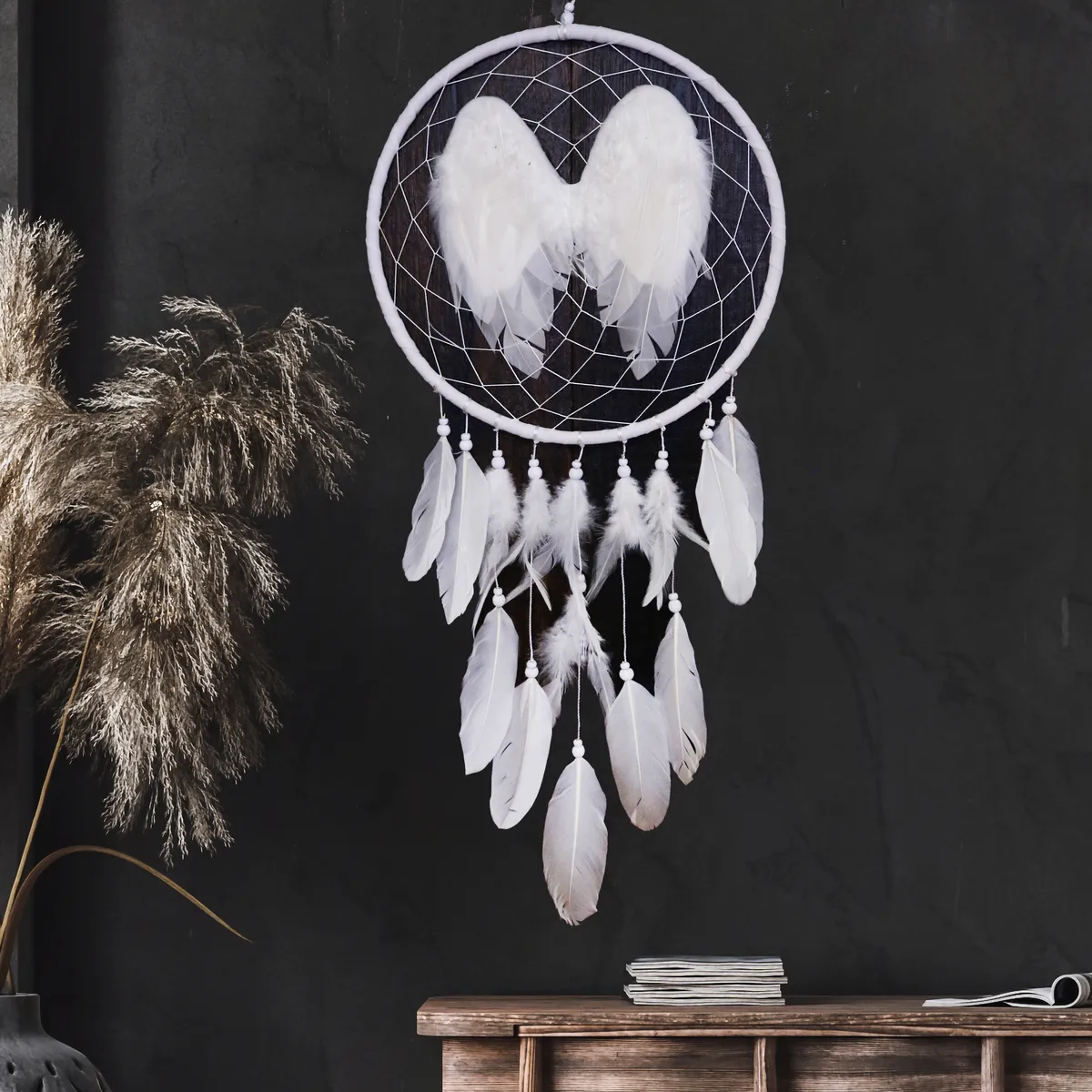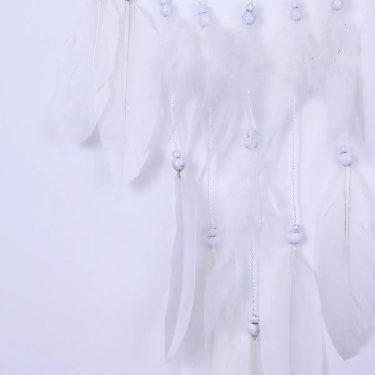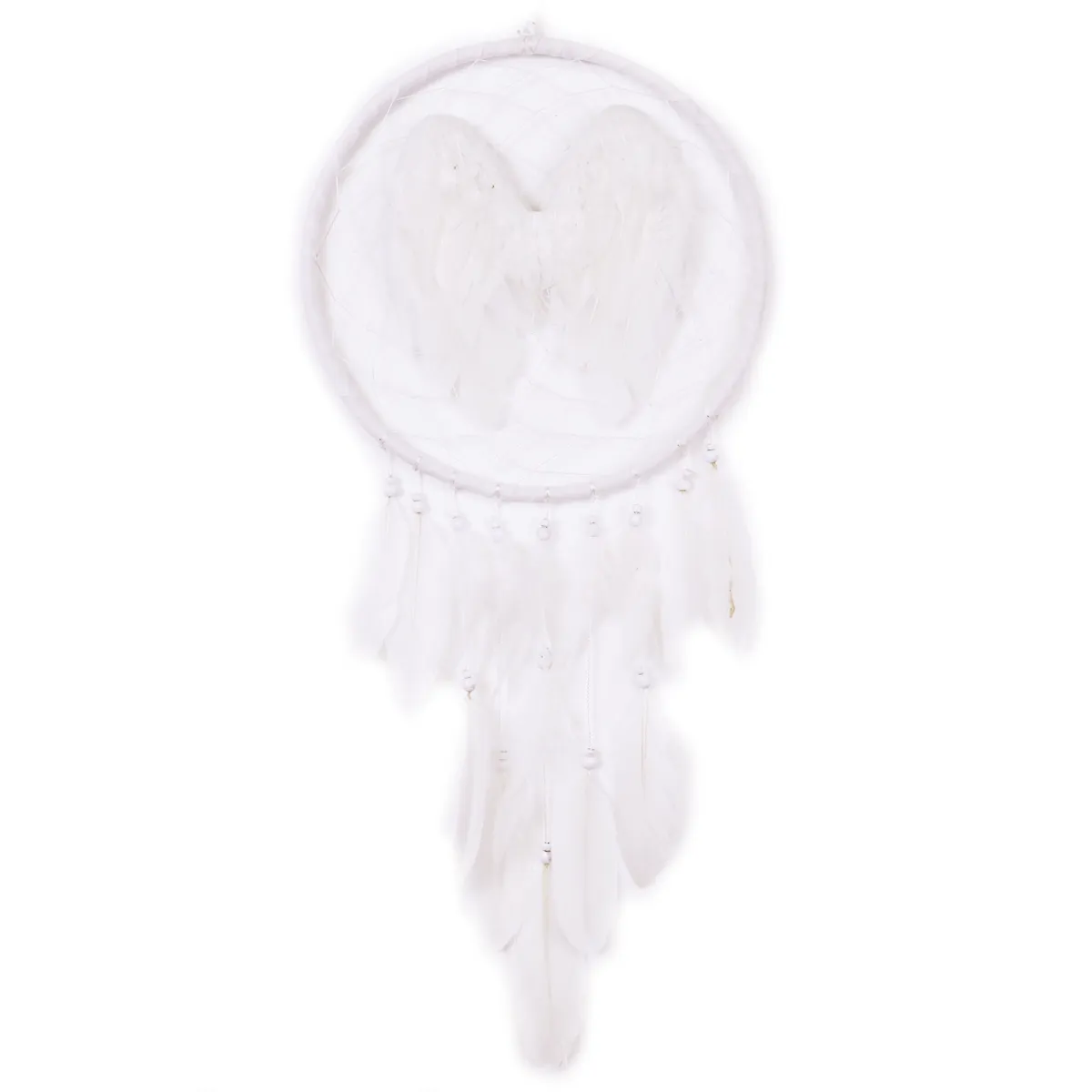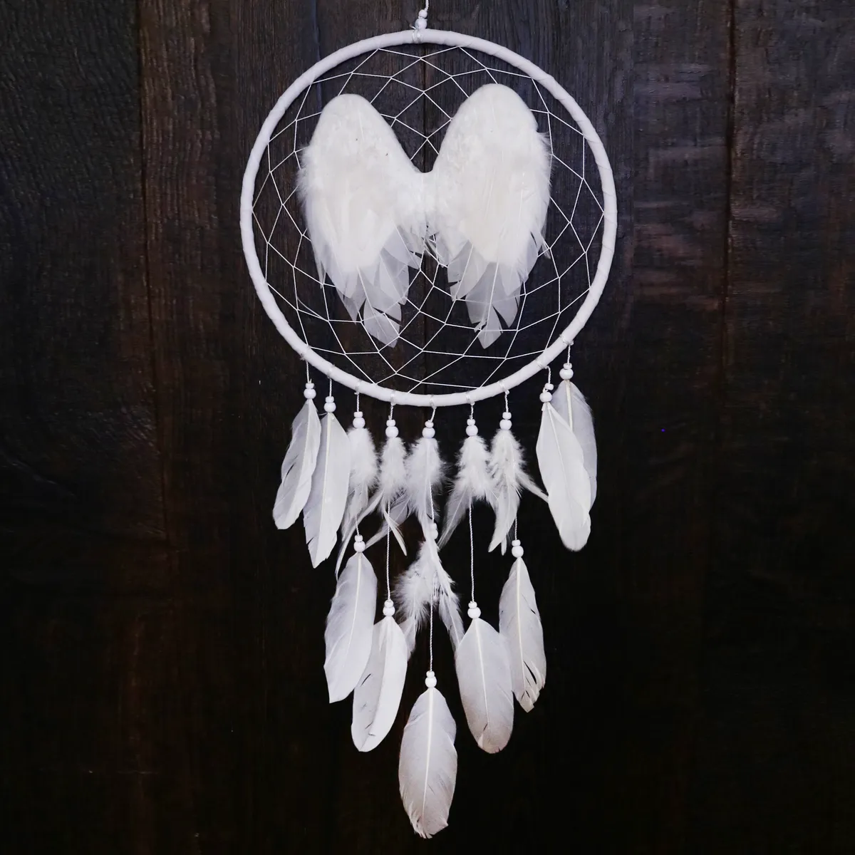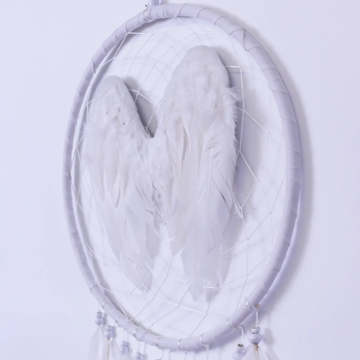 Fin håndlaget drømmefanger med fjær i midten som ser ut som englevinger. Laget av naturlige materialer med perler, stoff og fjær. Hver drømmefanger er håndlaget og unik, kan variere litt i størrelse.