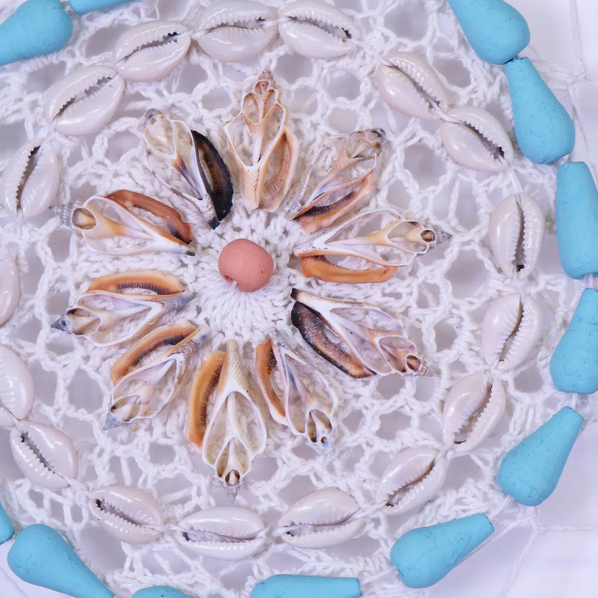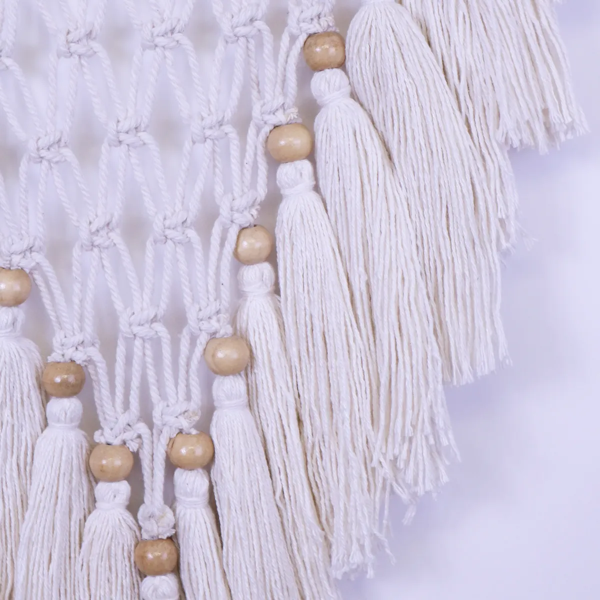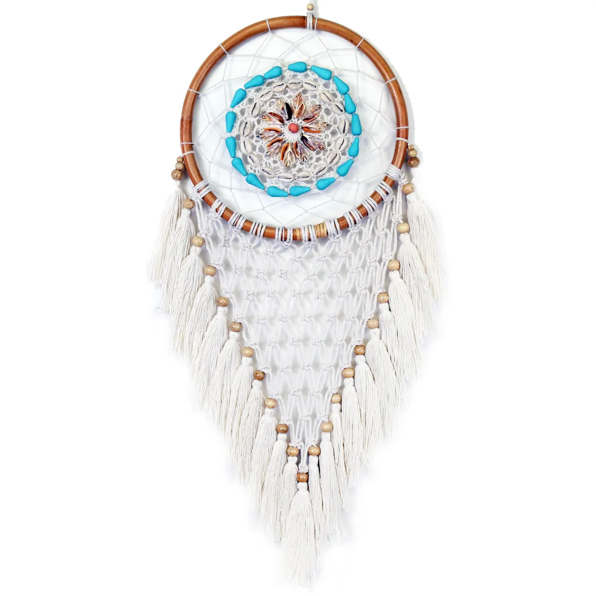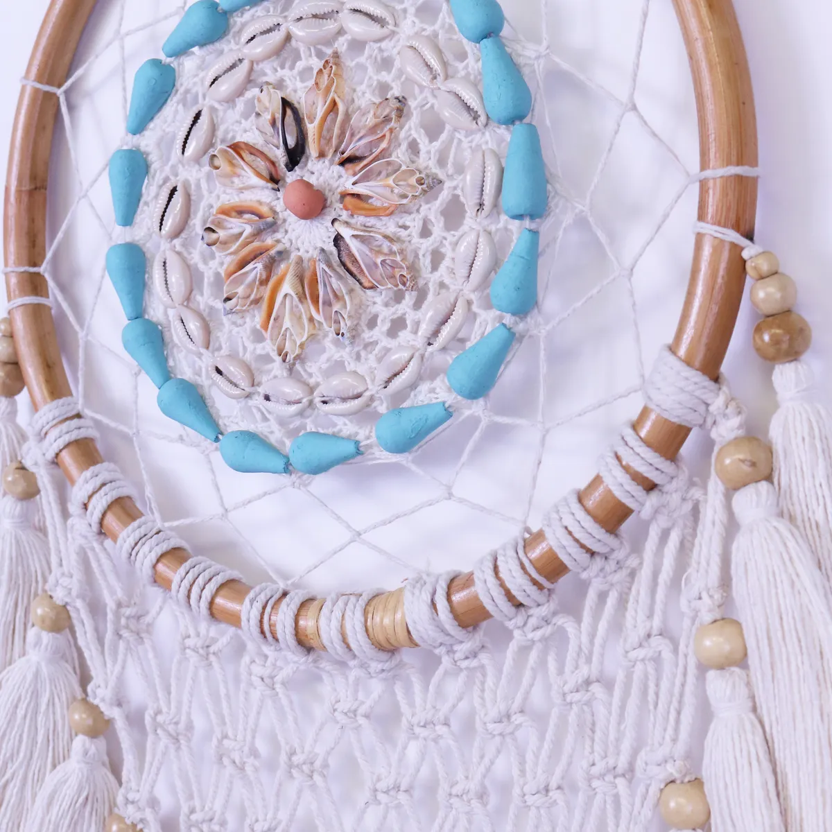 Fin håndlaget drømmefanger med vakker hekling i midten med perler og dusker hengende under i fin makramé. Laget av naturlige materialer med perler og stoff. Hver drømmefanger er håndlaget og unik, kan variere litt i størrelse.