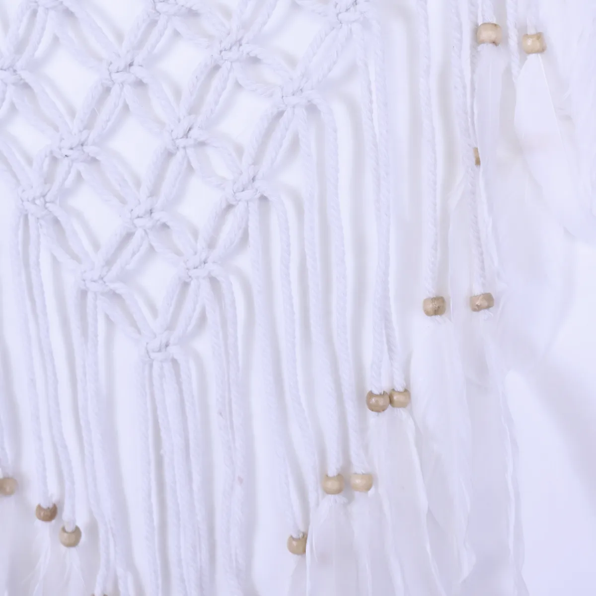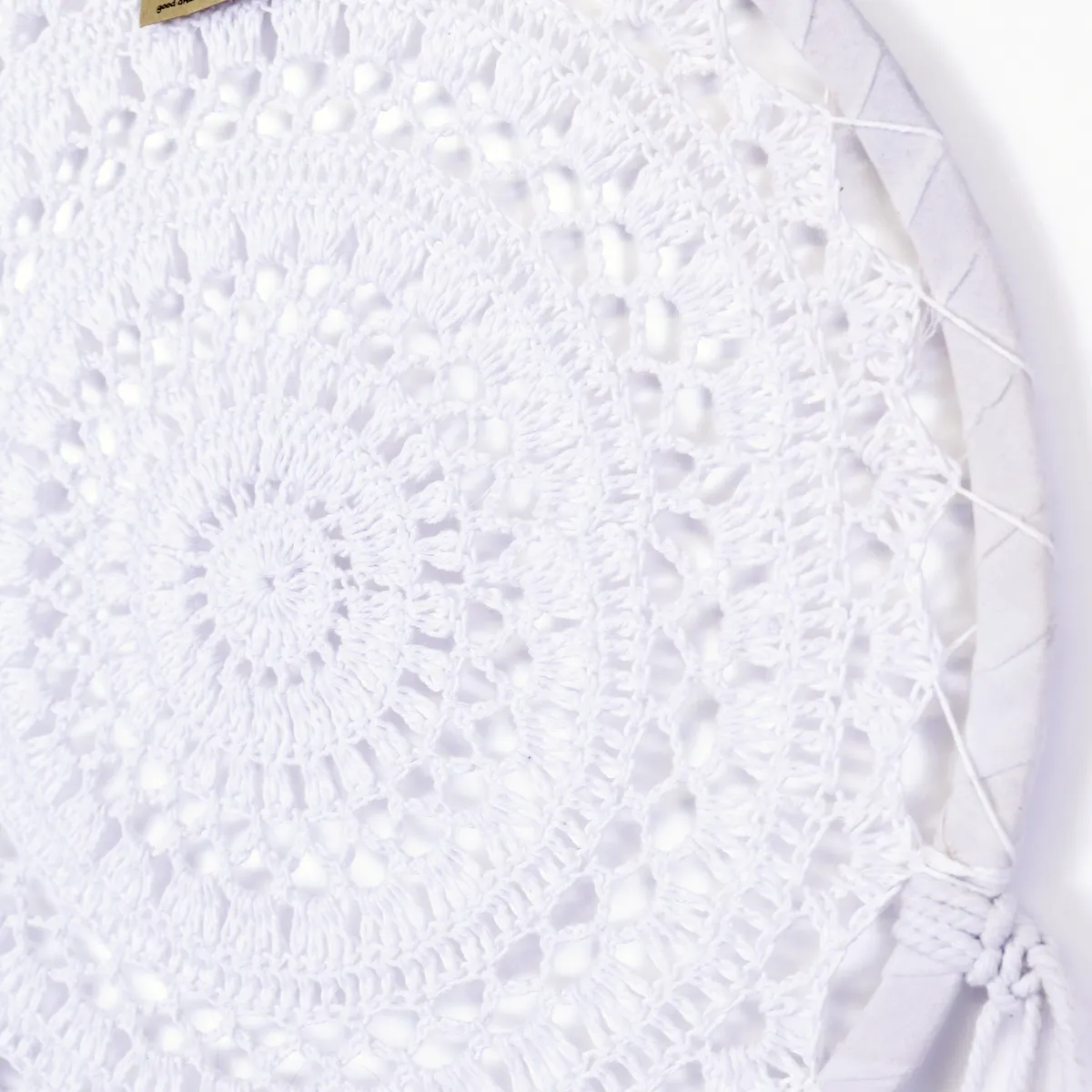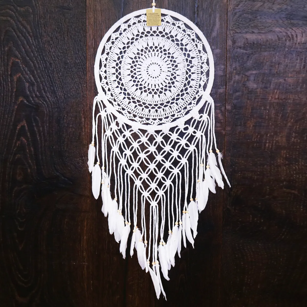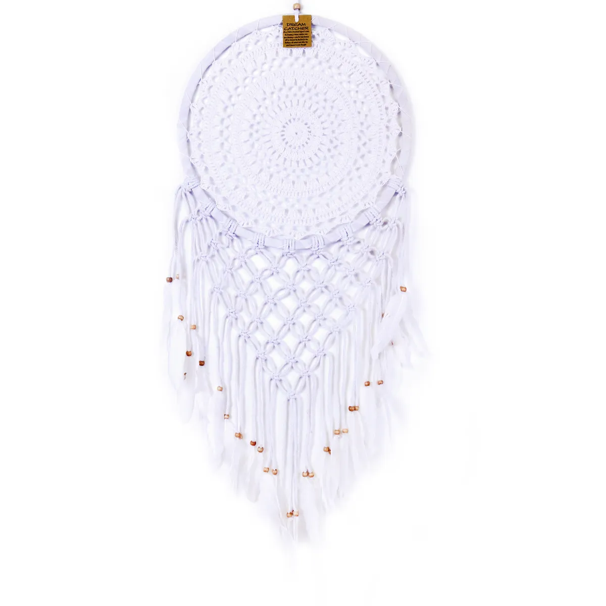 Fin håndlaget drømmefanger med vakker hekling i midten der perler og dusker henger under i fin makramé. Laget av naturlige materialer med perler og stoff. Hver drømmefanger er håndlaget og unik, kan variere litt i størrelse.