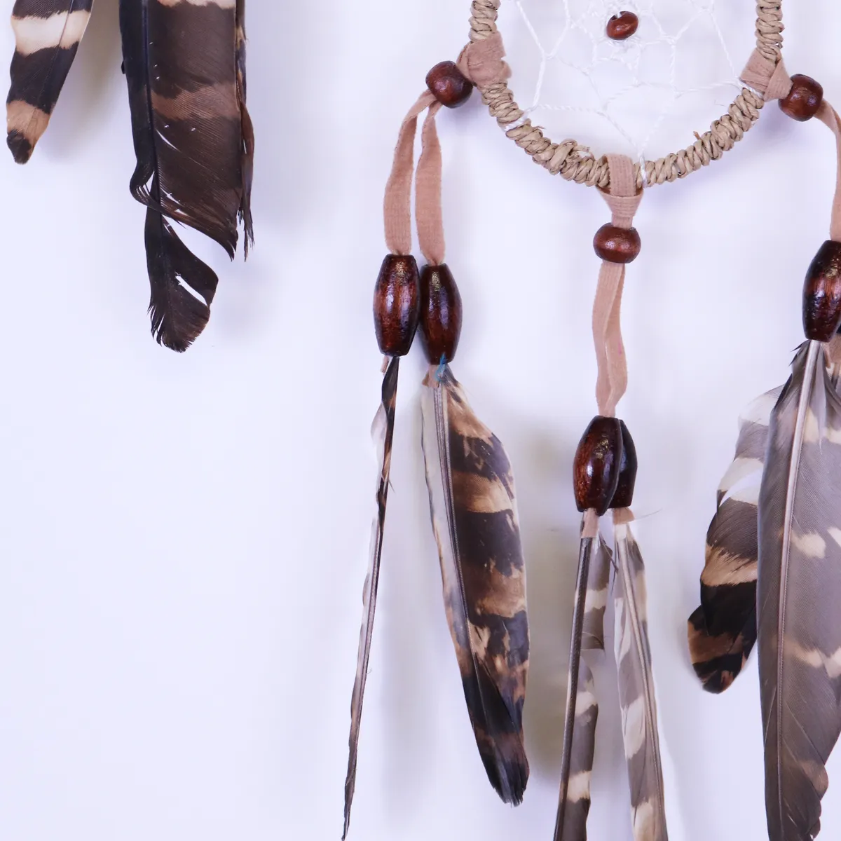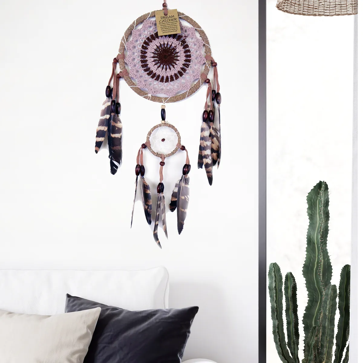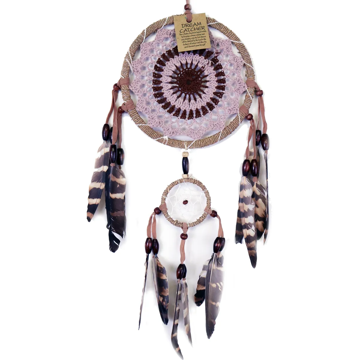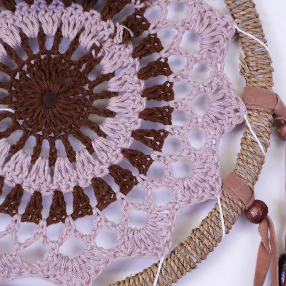 Fin håndlaget drømmefanger med vakker hekling i midten. Laget av naturlige materialer med perler, stoff og vakre tigerfjær. Hver drømmefanger er håndlaget og unik, kan variere litt i størrelse.