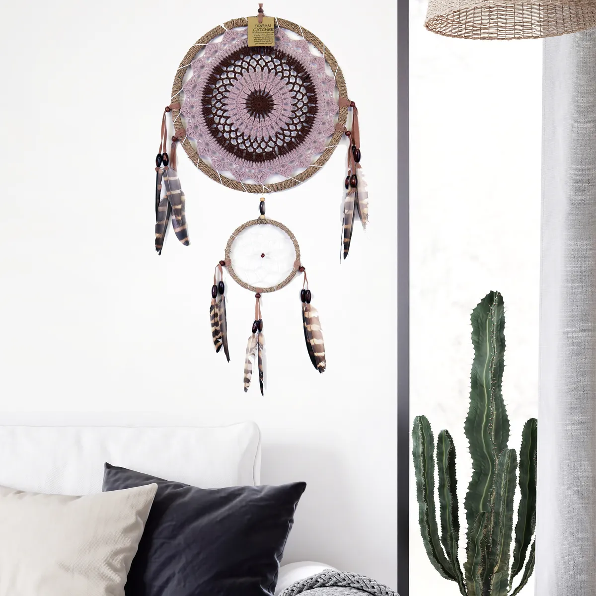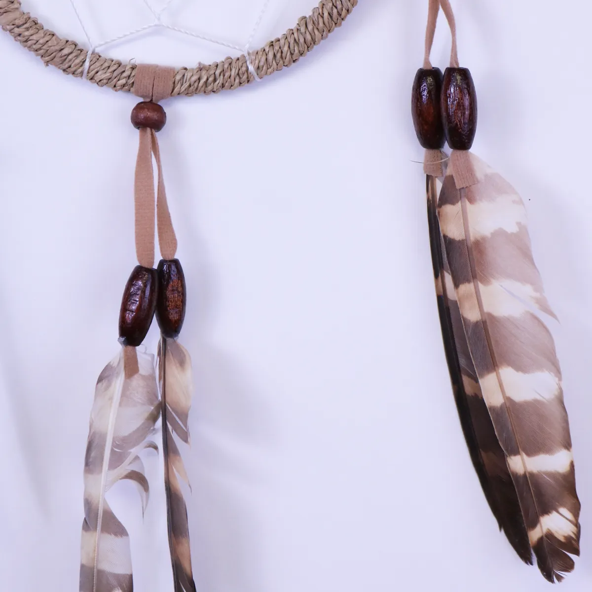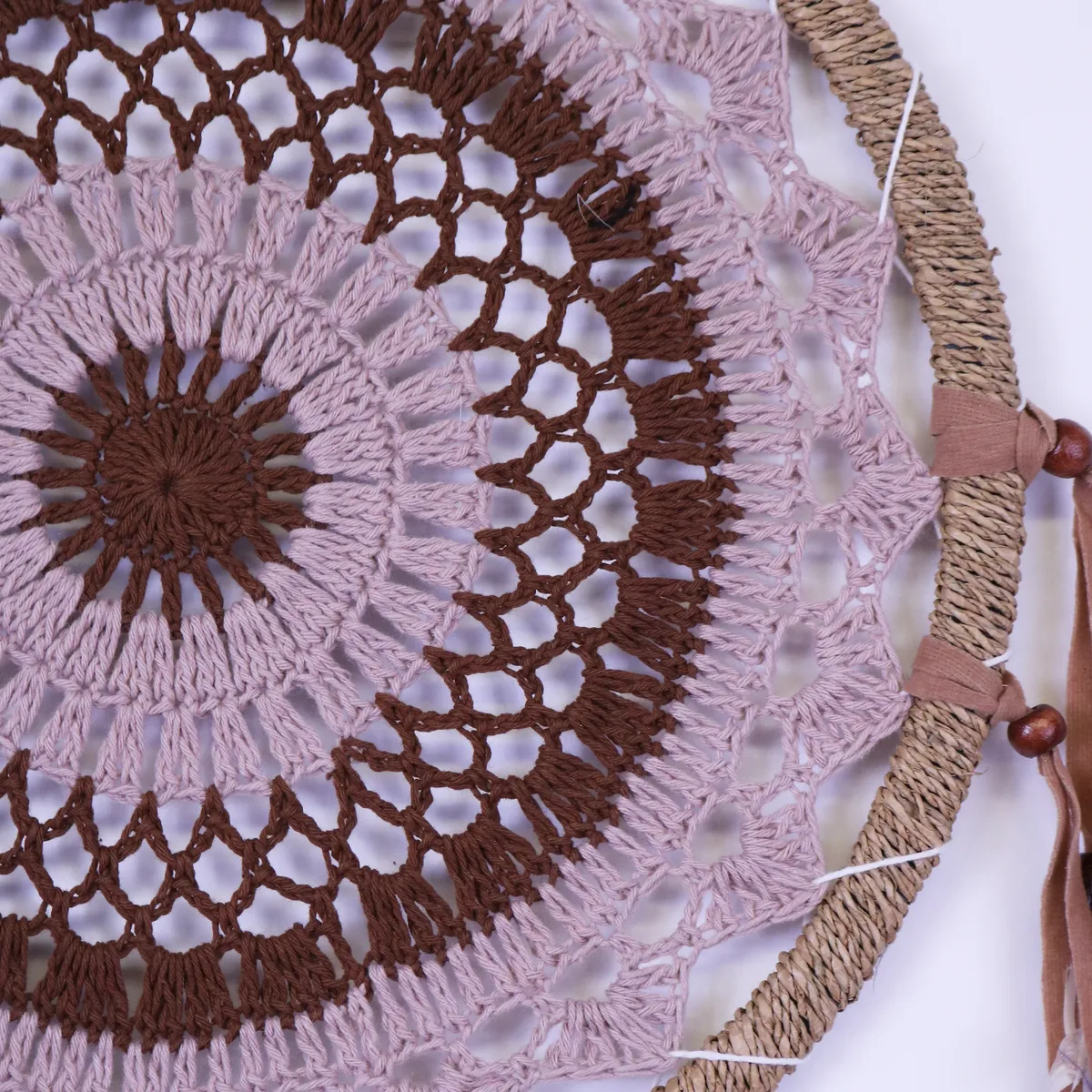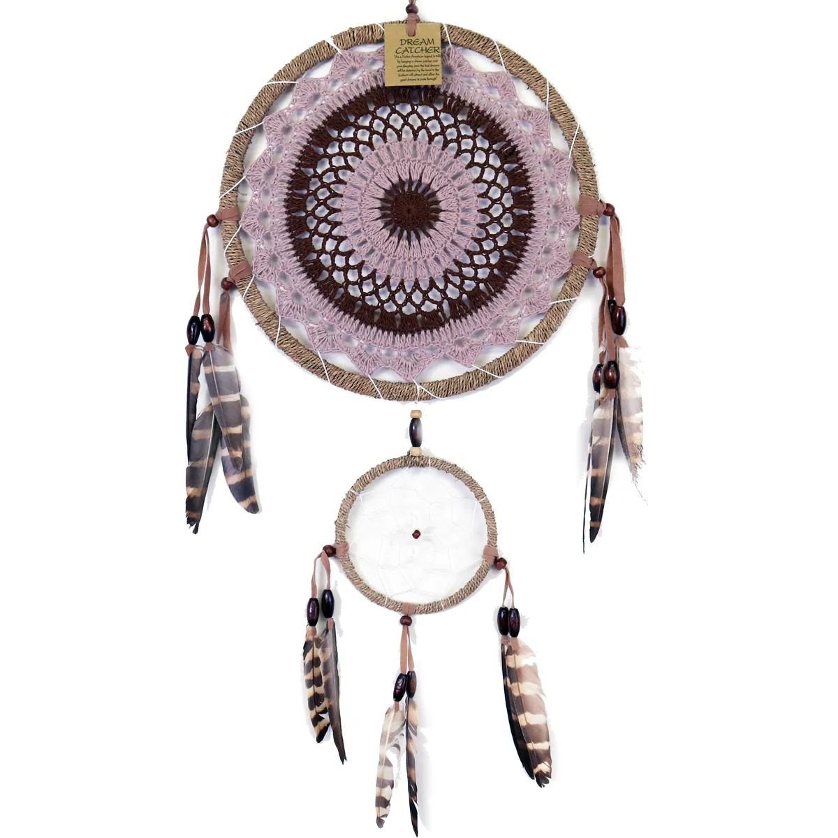 Fin håndlaget drømmefanger med vakker hekling i midten. Laget av naturlige materialer med perler, stoff og vakre tigerfjær. Hver drømmefanger er håndlaget og unik, kan variere litt i størrelse.