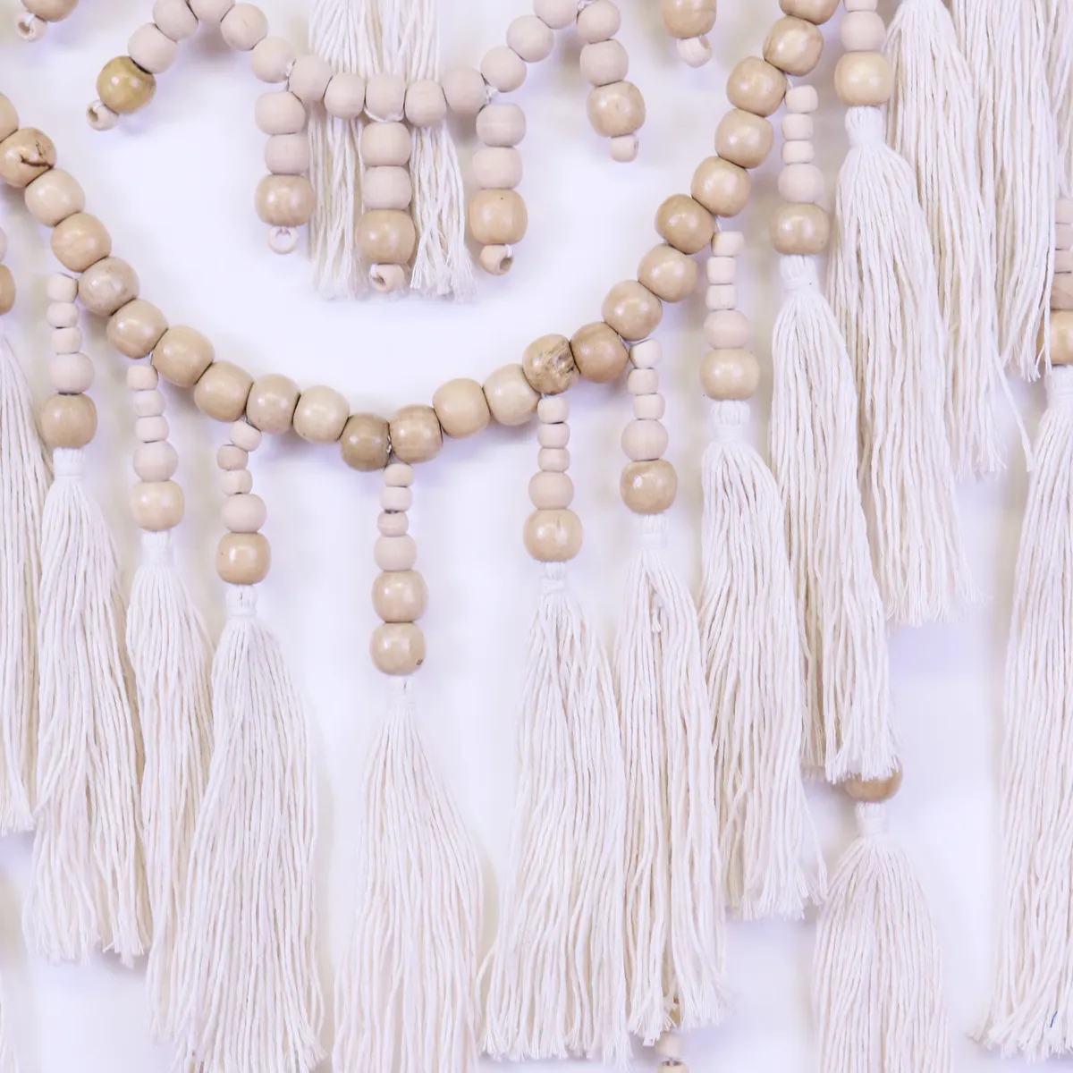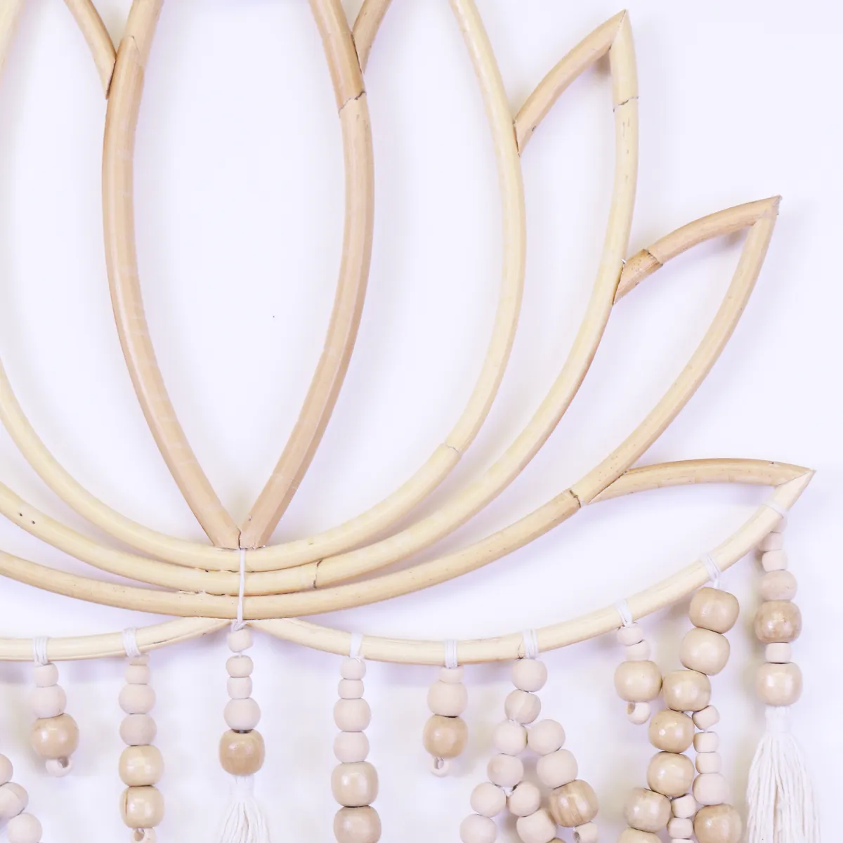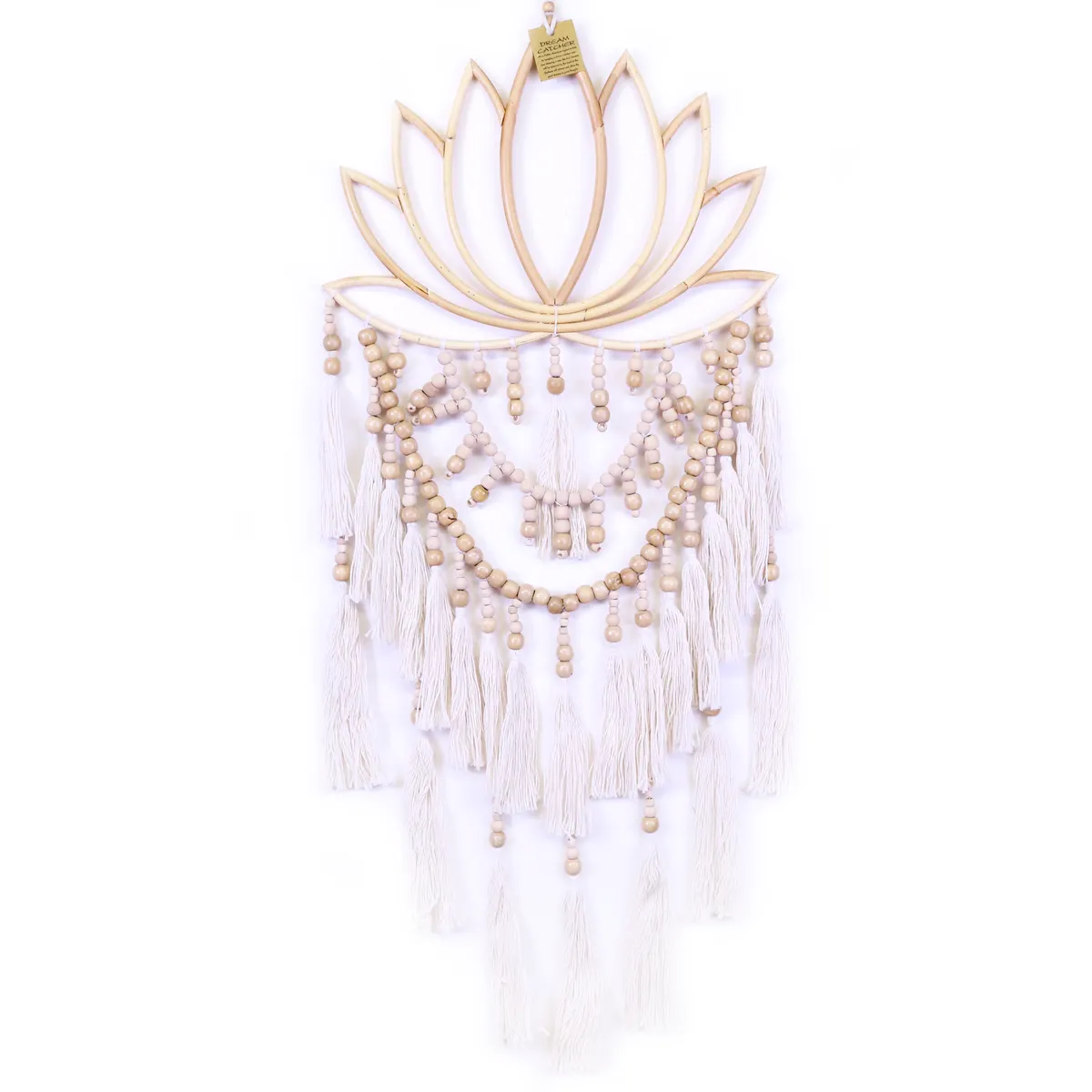 Fin håndlaget drømmefanger. Vakker tre lotusblomst på toppen med perler og dusker hengende nede. Laget av naturlige materialer med perler og stoff. Hver drømmefanger er håndlaget og unik, kan variere litt i størrelse.