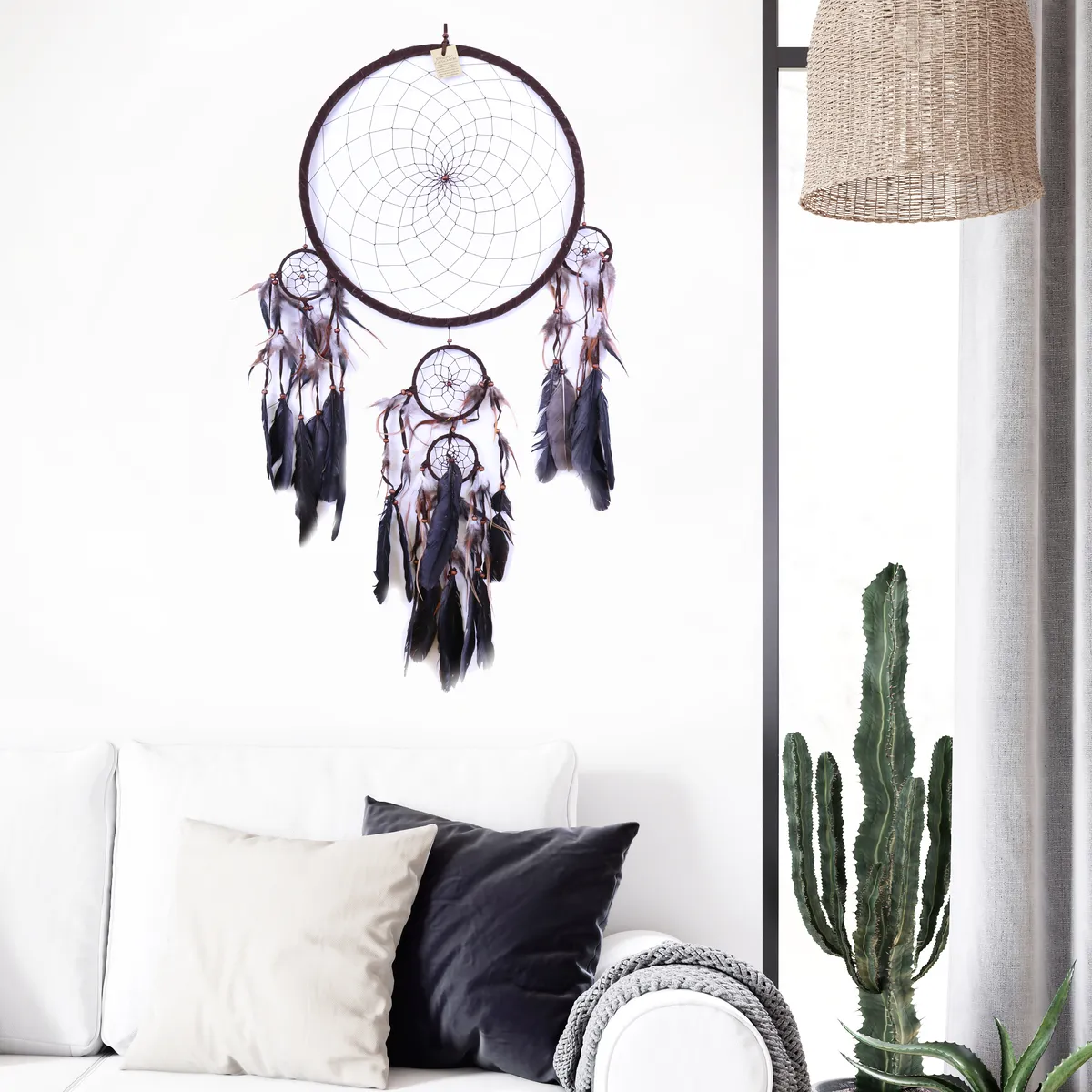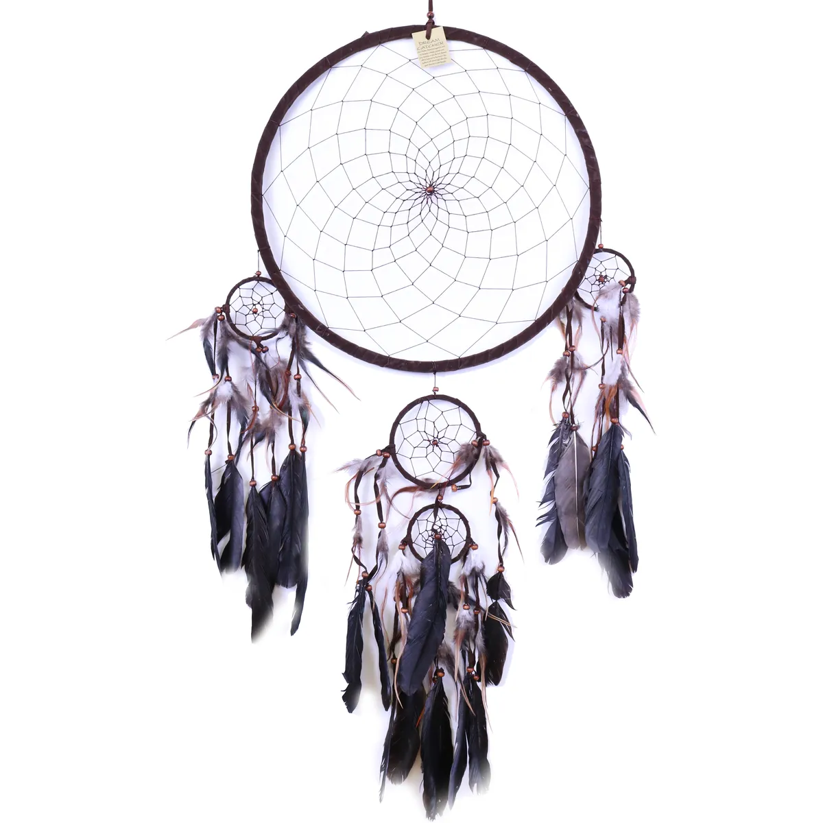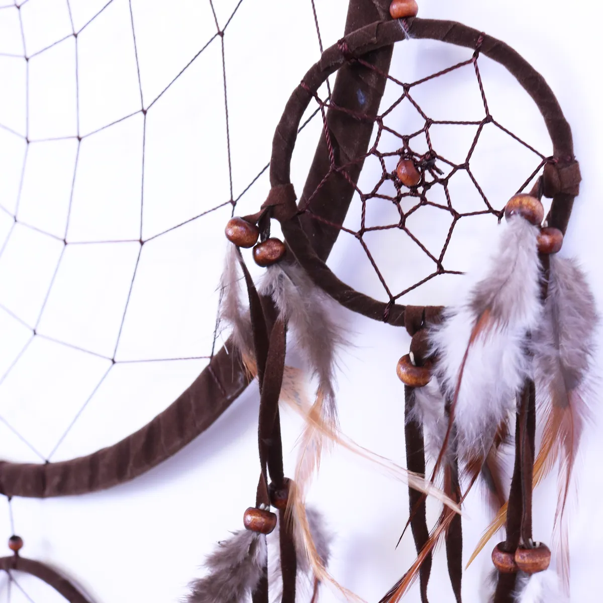 Fin håndlaget drømmefanger med tre sirkler på rad og en på hver side av den største. Laget av naturlige materialer med perler, stoff og vakre fjær. Hver drømmefanger er håndlaget og unik, kan variere litt i størrelse.