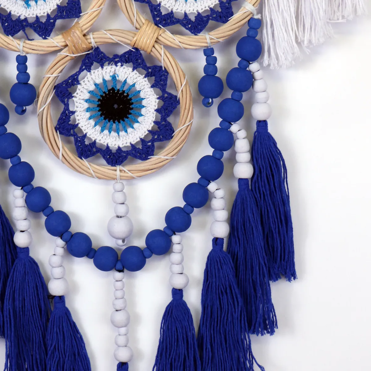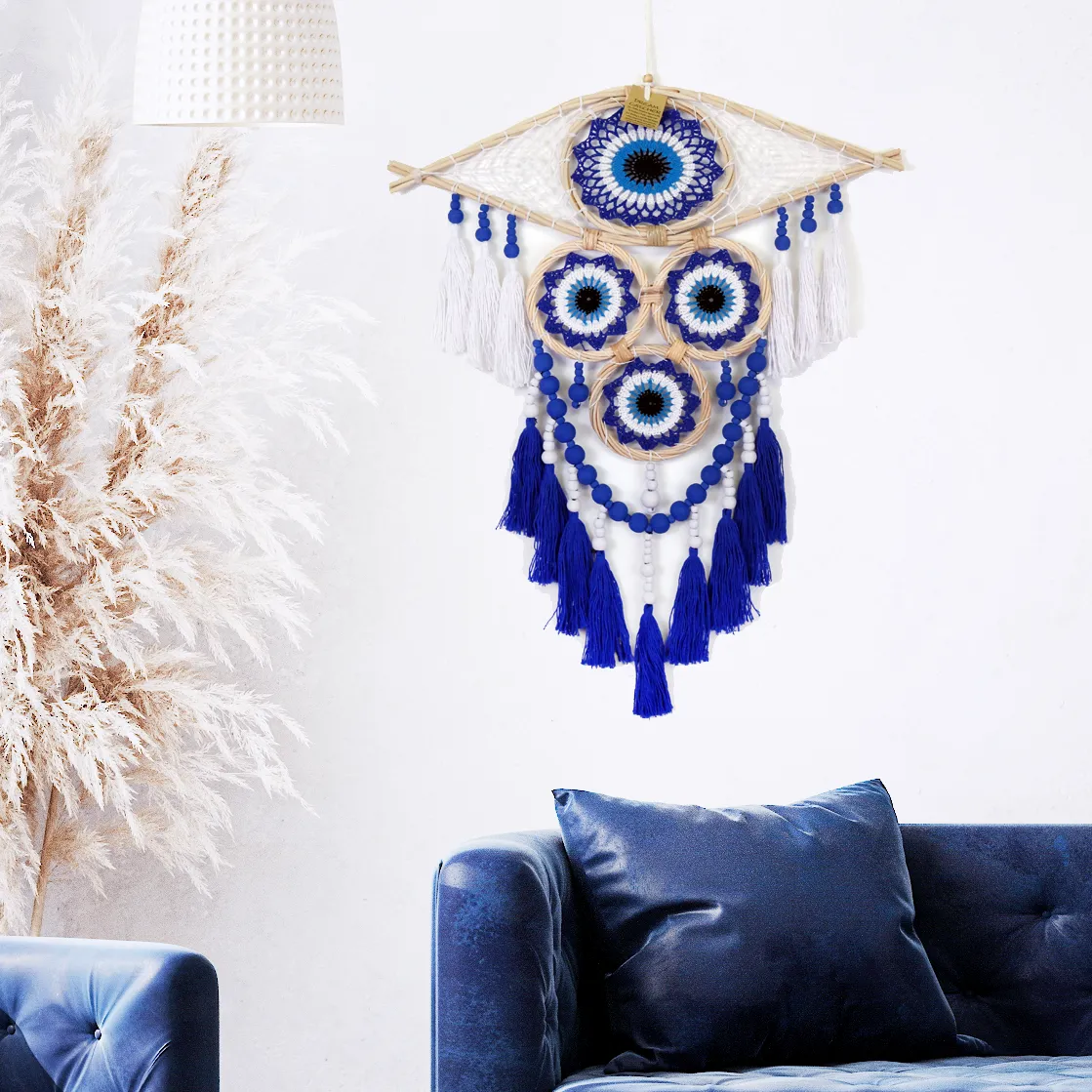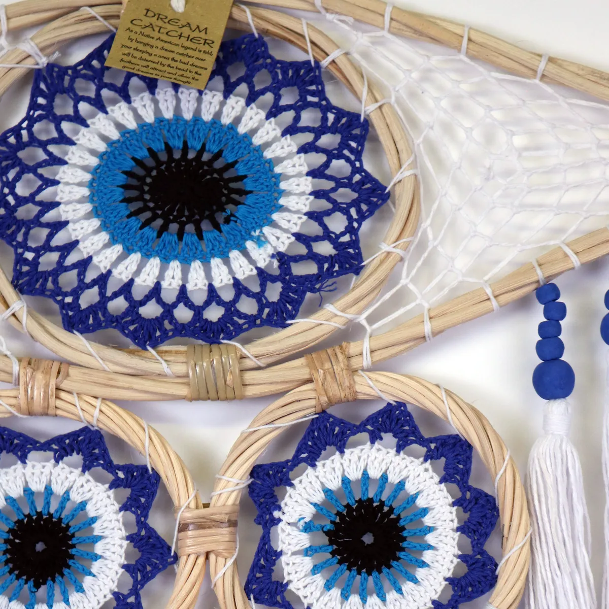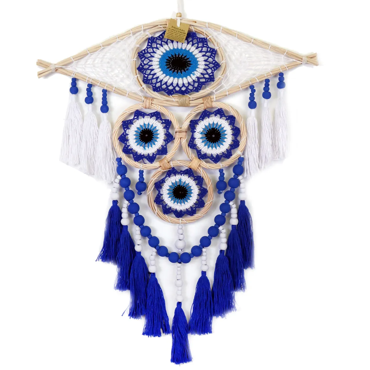 Fin håndlaget drømmefanger formet som et øye. Det onde øyet sies å beskytte deg mot demonisk påvirkning. Laget av naturmaterialer med perler og stoff med dusker hengende ned. Hver drømmefanger er håndlaget og unik, kan variere litt i størrelse.