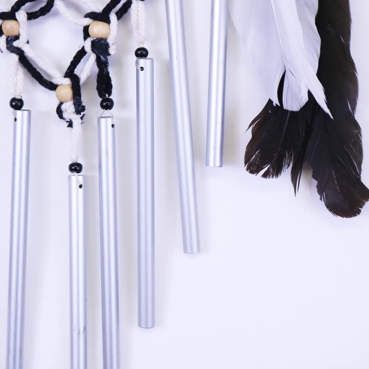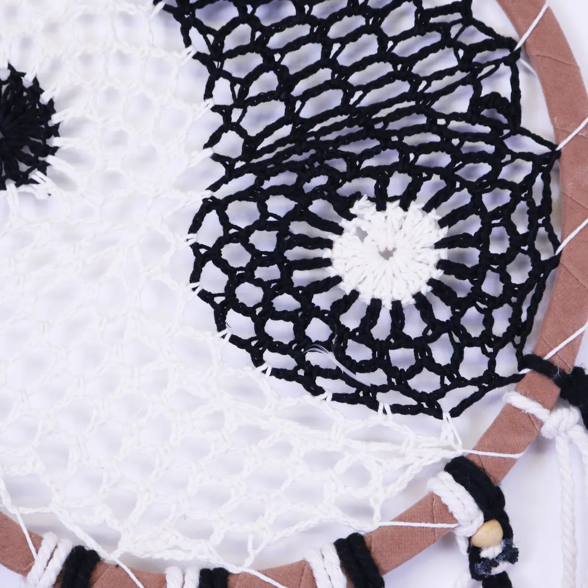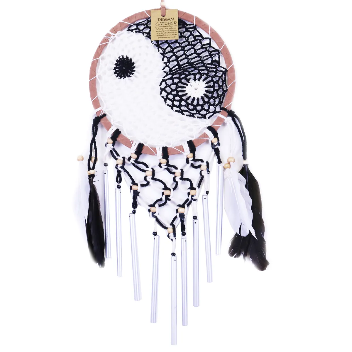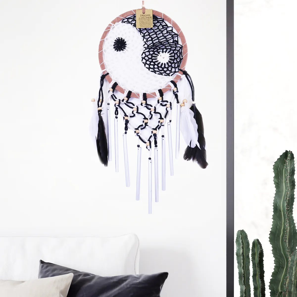 Fin håndlaget drømmefanger med vakker Yin & Yang hekling i midten og vindspill / uro hengende under. Laget av naturlige materialer med perler, stoff og fjær. Hver drømmefanger er håndlaget og unik, kan variere litt i størrelse.