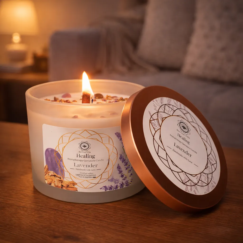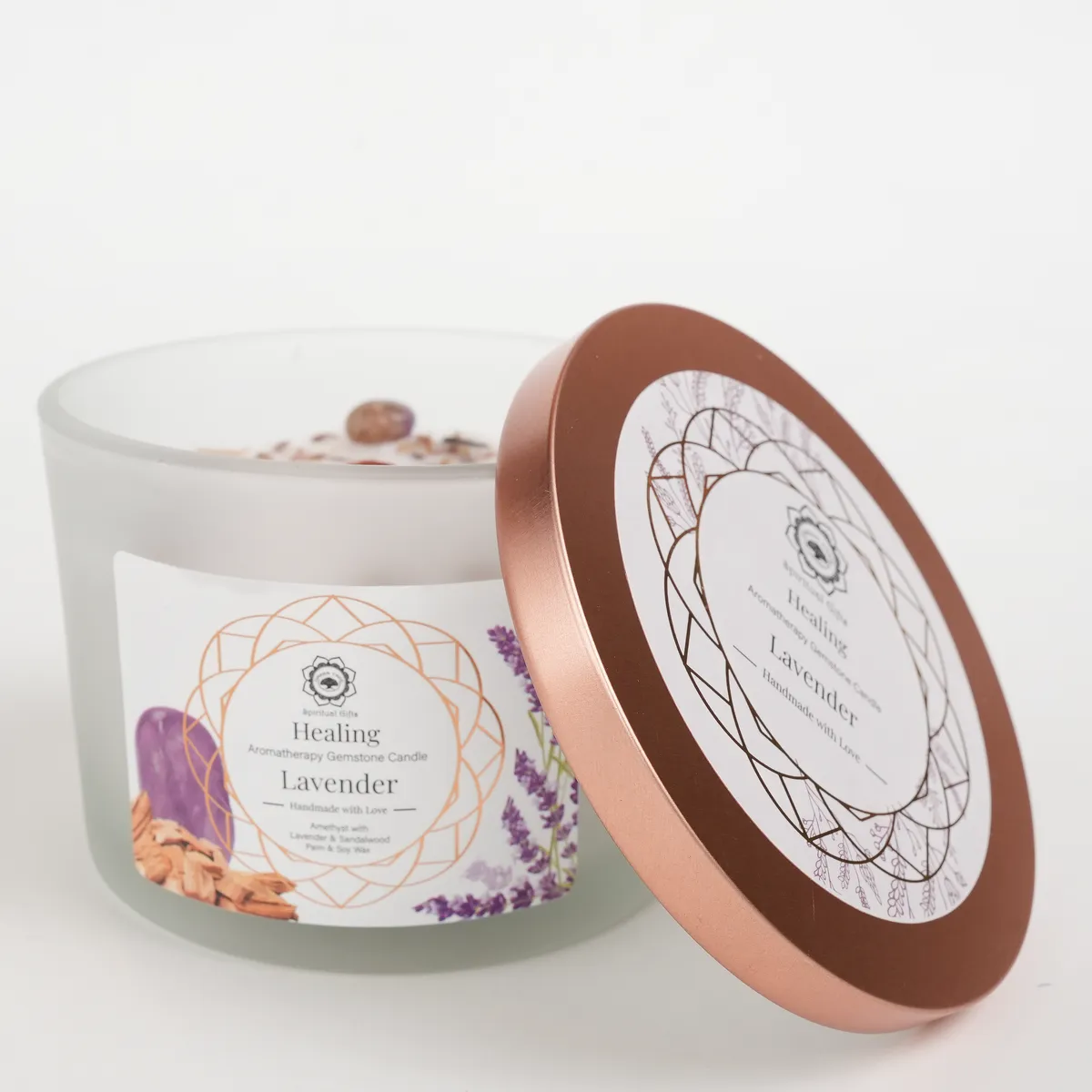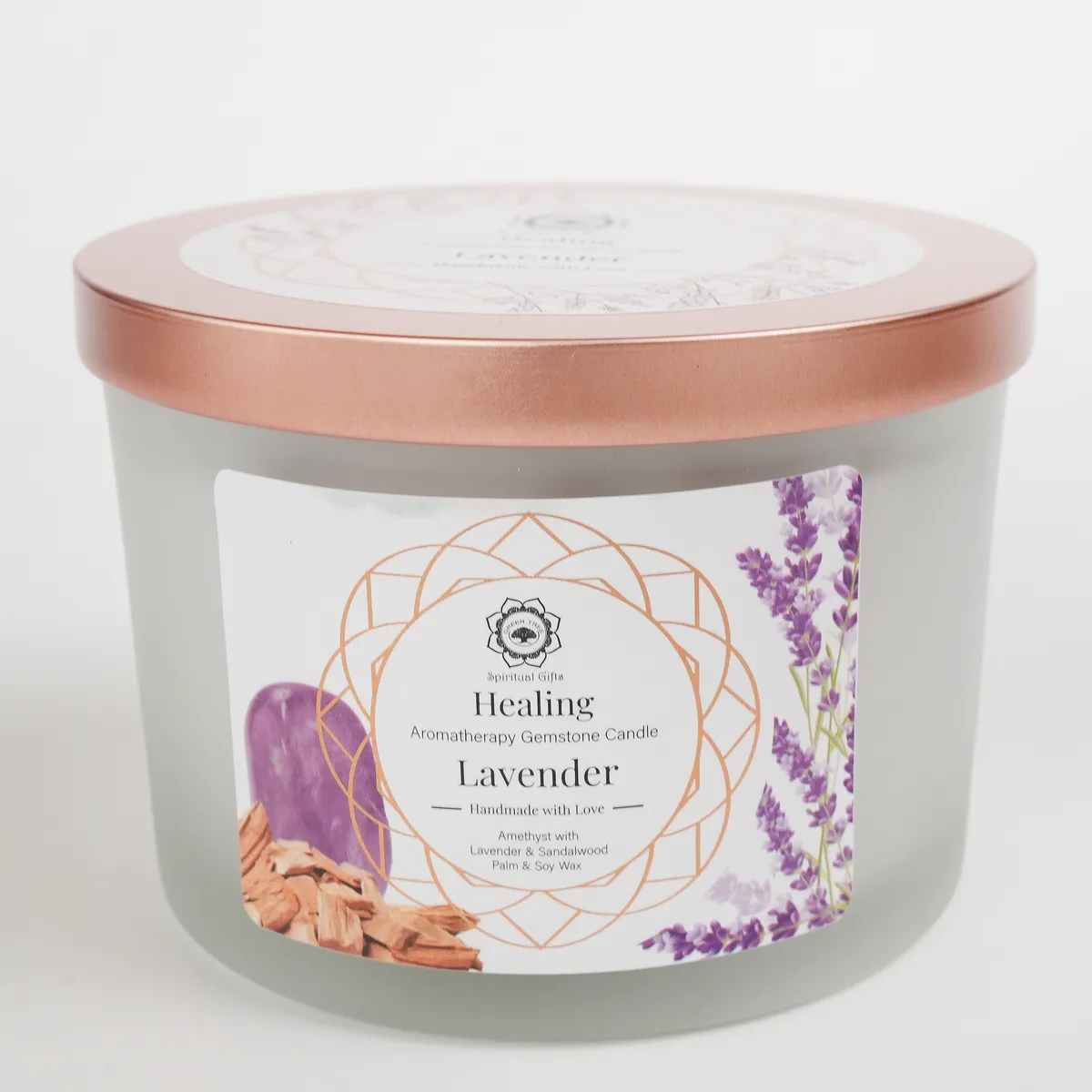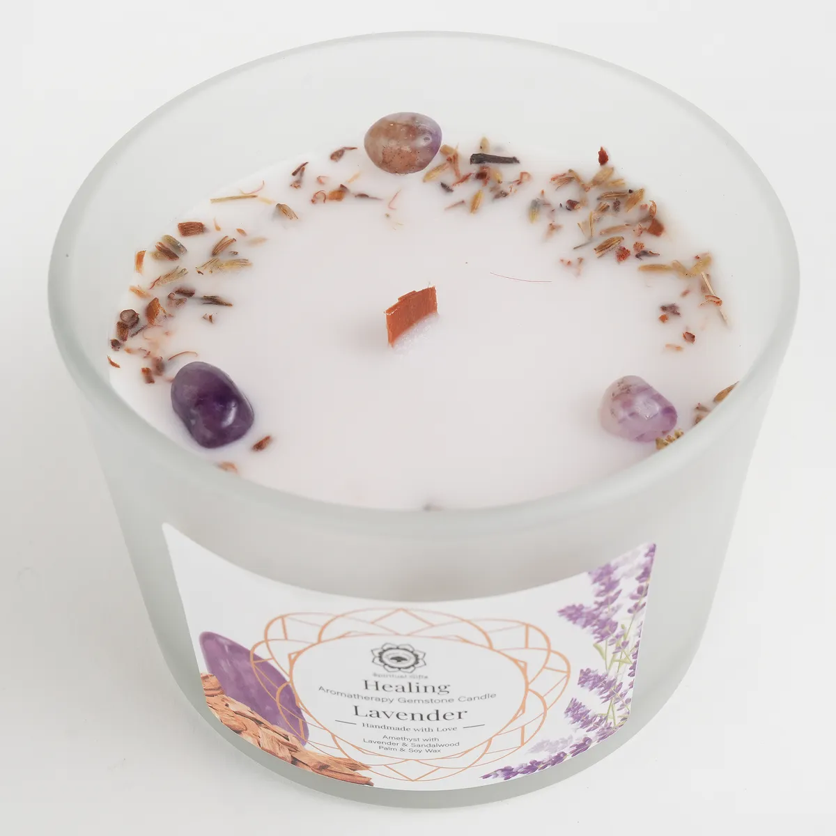 Healing er et duftlys laget av palme- og soyavoks, beriket med beroligende lavendel, varmt sandeltre og ametyst-krystaller. Duften er myk, balanserende og avslappende og skaper en følelse av dyp avslapning og indre harmoni. Ametyst forbindes med ro, klarhet og emosjonell balanse, noe som gjør dette lyset ideelt for meditasjon, restitusjon og stunder av stillhet.