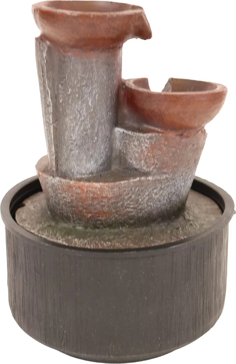 En fin moderne fontene med søyle hvor vannet renner fra urnene ned på en LED-lampe som lyser og gir et vakkert lysbilde. Et varmt og veldig dekorativt, effektivt lys.