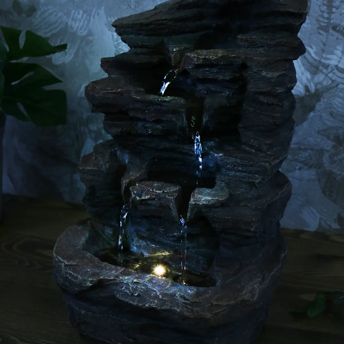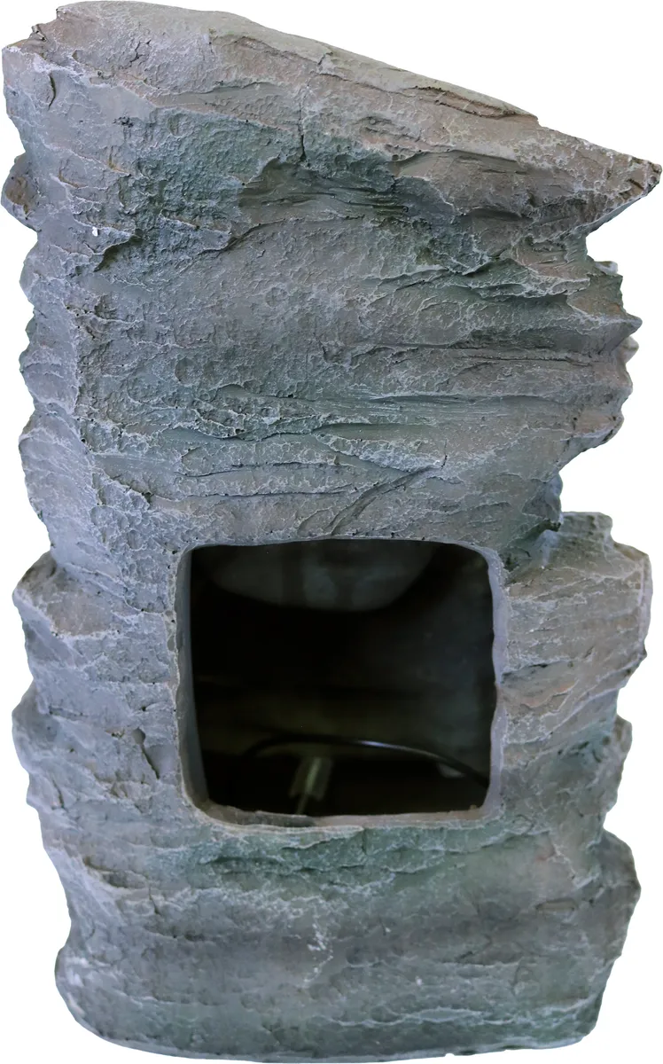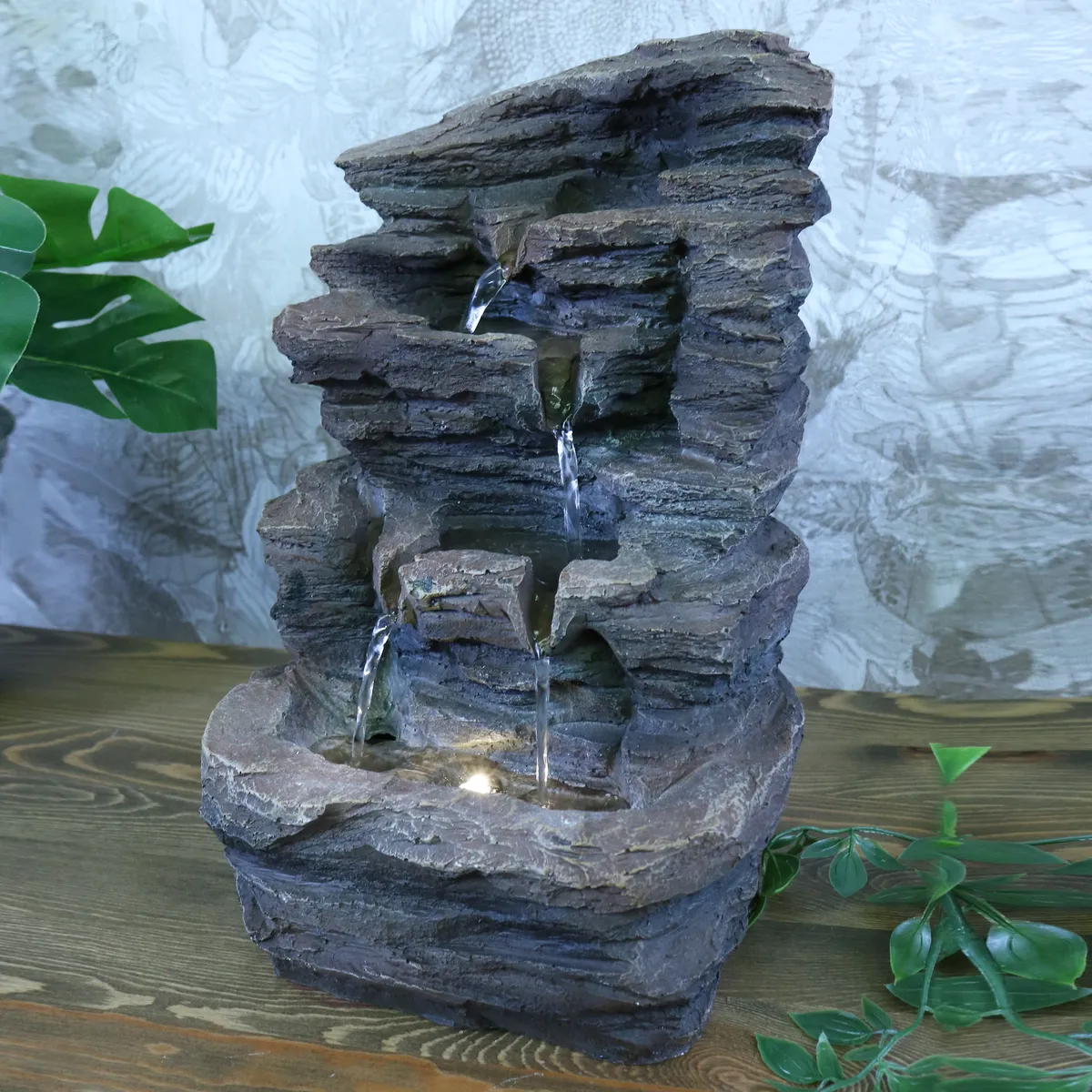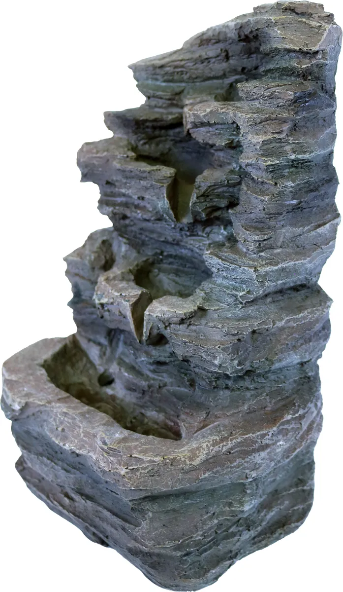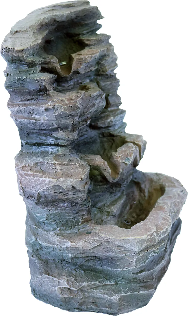 Denne fine fontenen som ser ut som et fjell har tre fosser, som lager en herlig avslappende lyd fra det rislende vannet. LED-lampen lyser og er et varmt og veldig dekorativt, effektivt lys