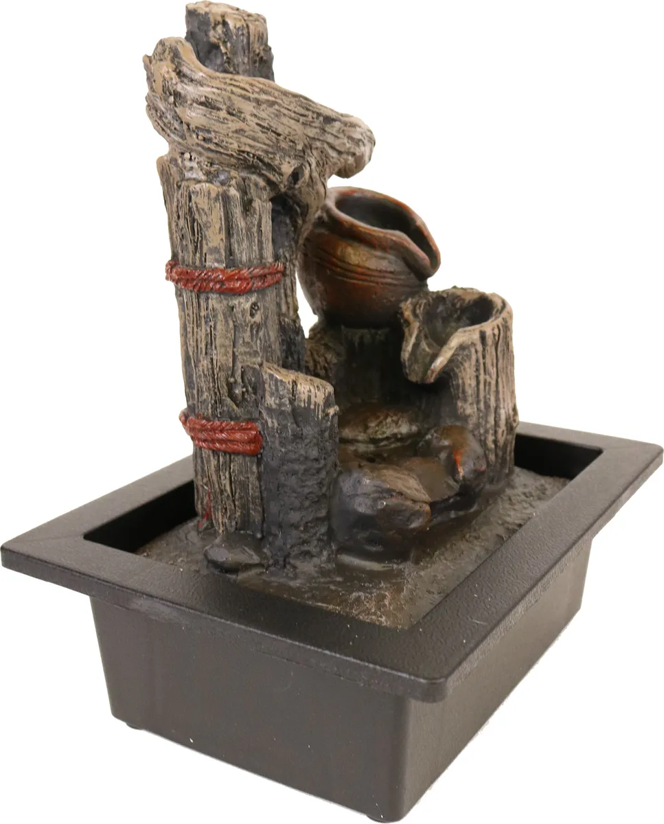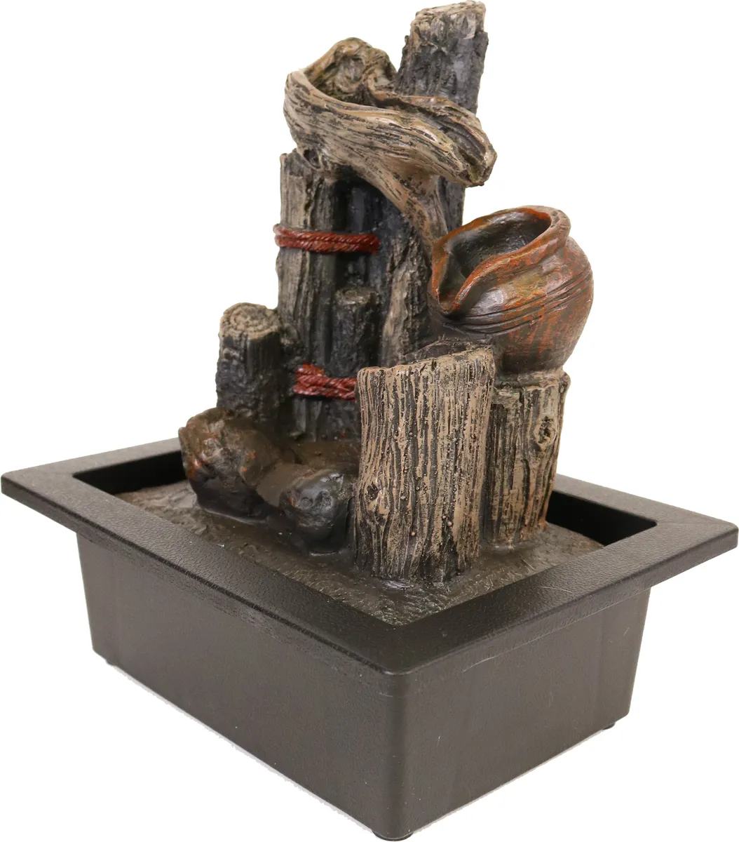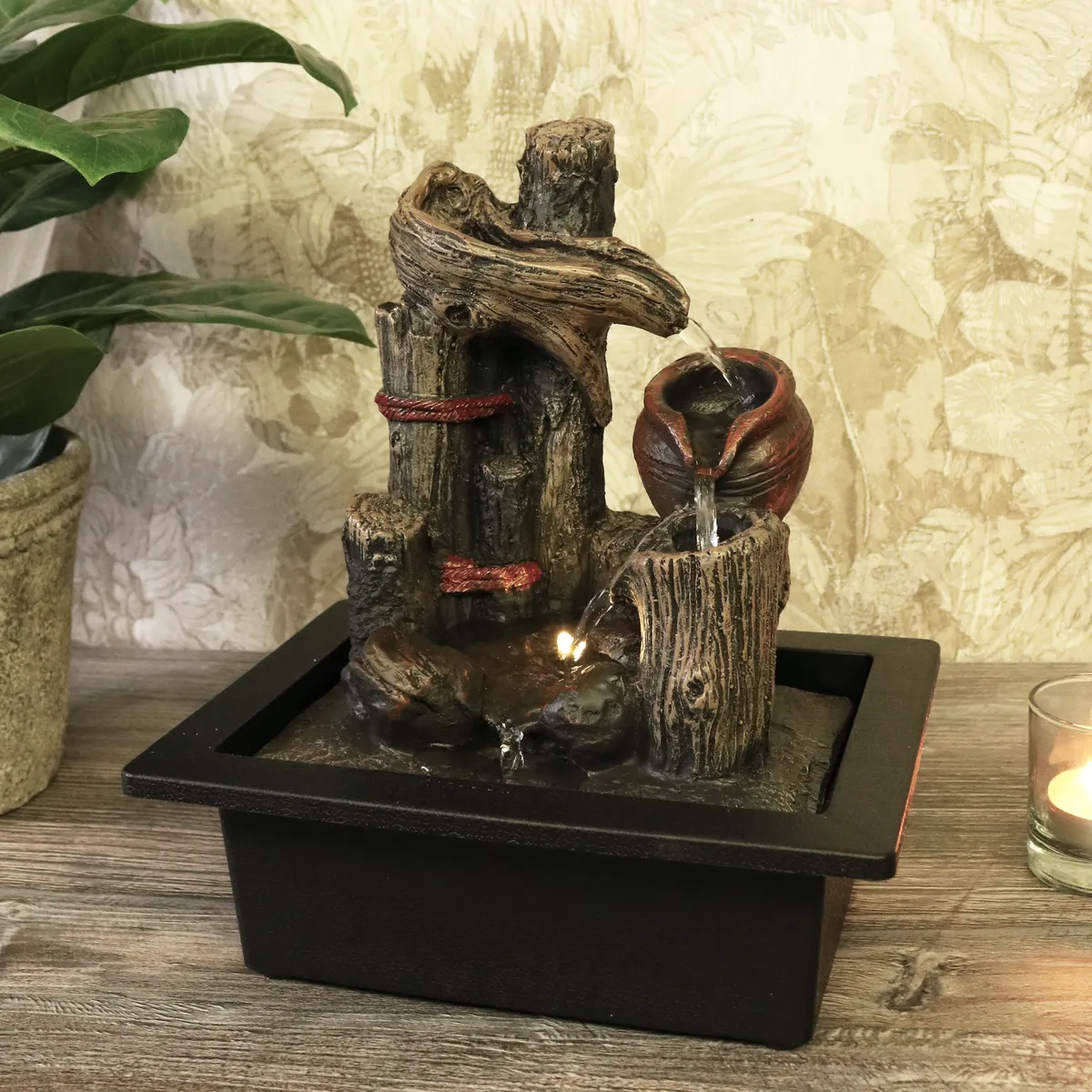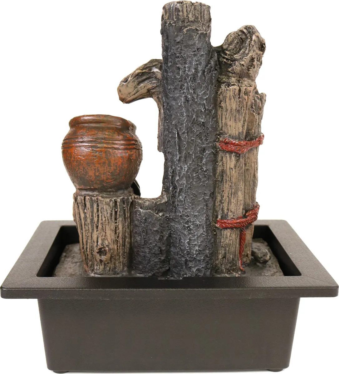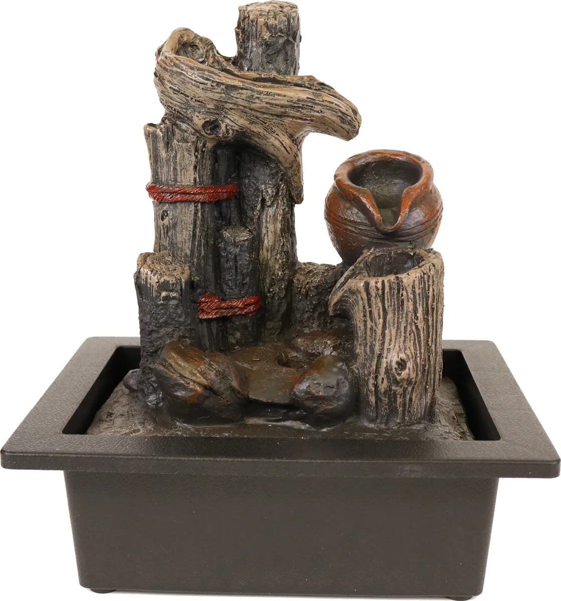 Denne fine fontenen i form av trestokker og en urne i naturlig farge, har tre fosser som gir en avslappende lyd fra det rislende vannet. LED-lampen som lyser gir et varmt og veldig dekorativt, effektivt lys.