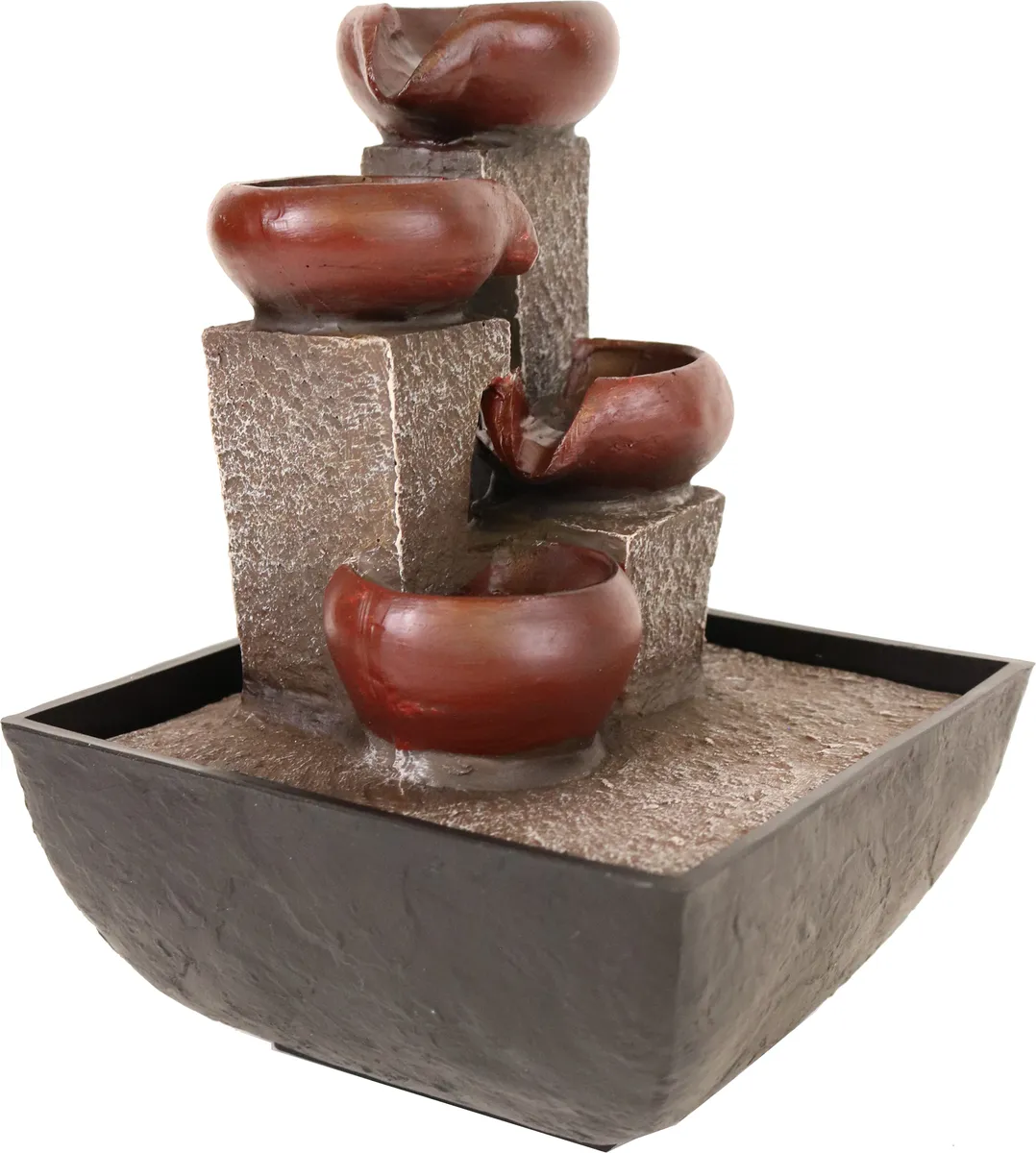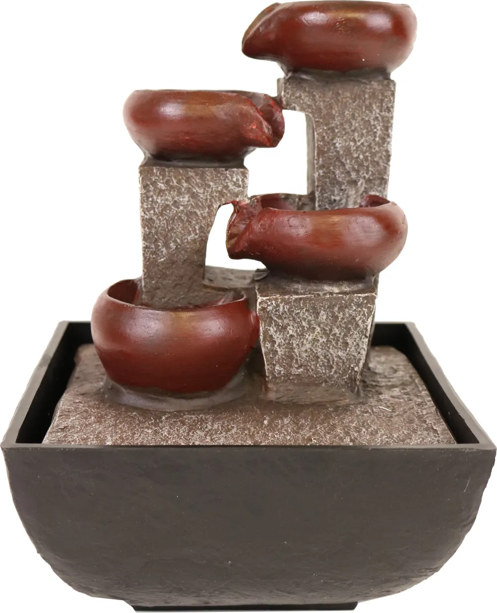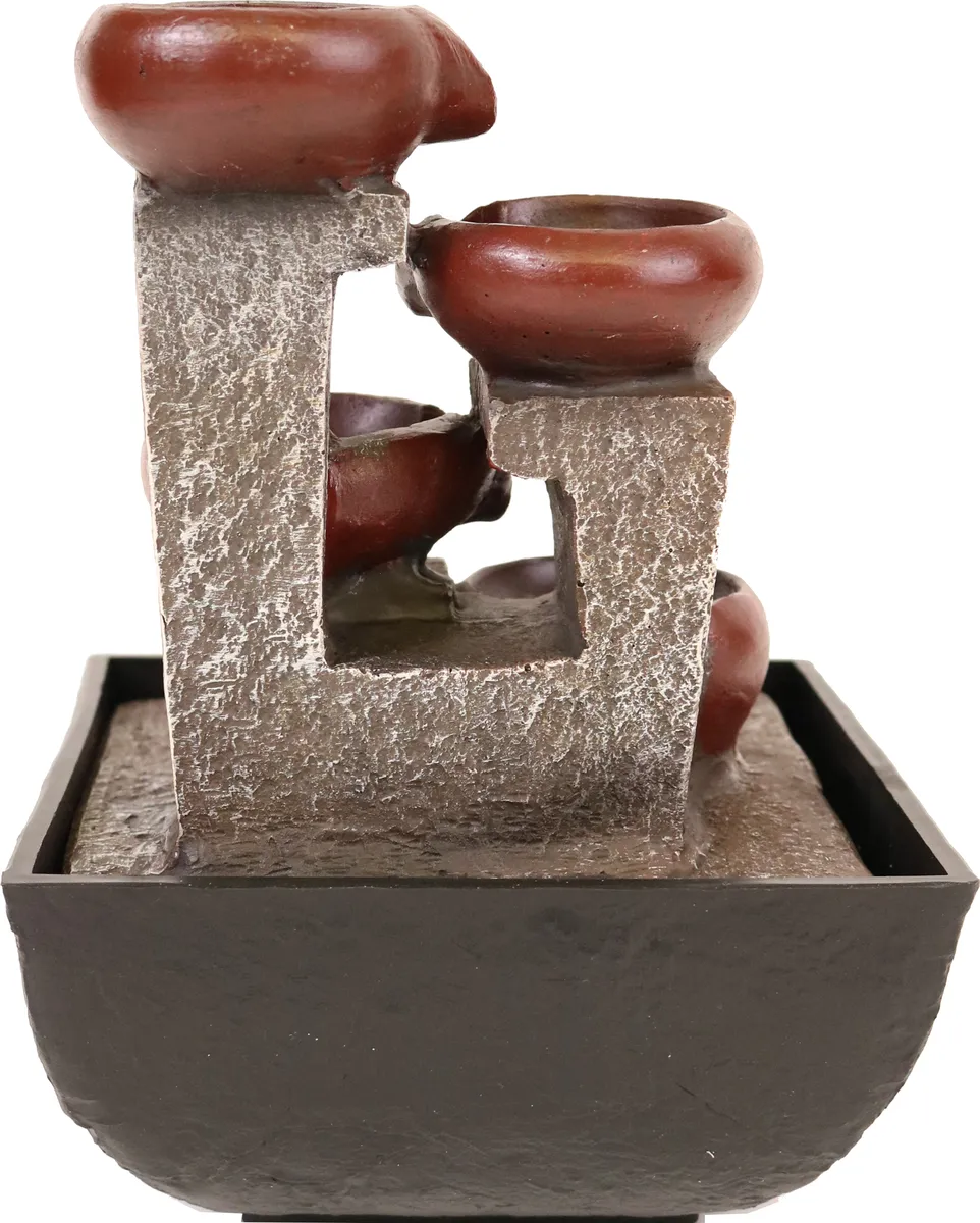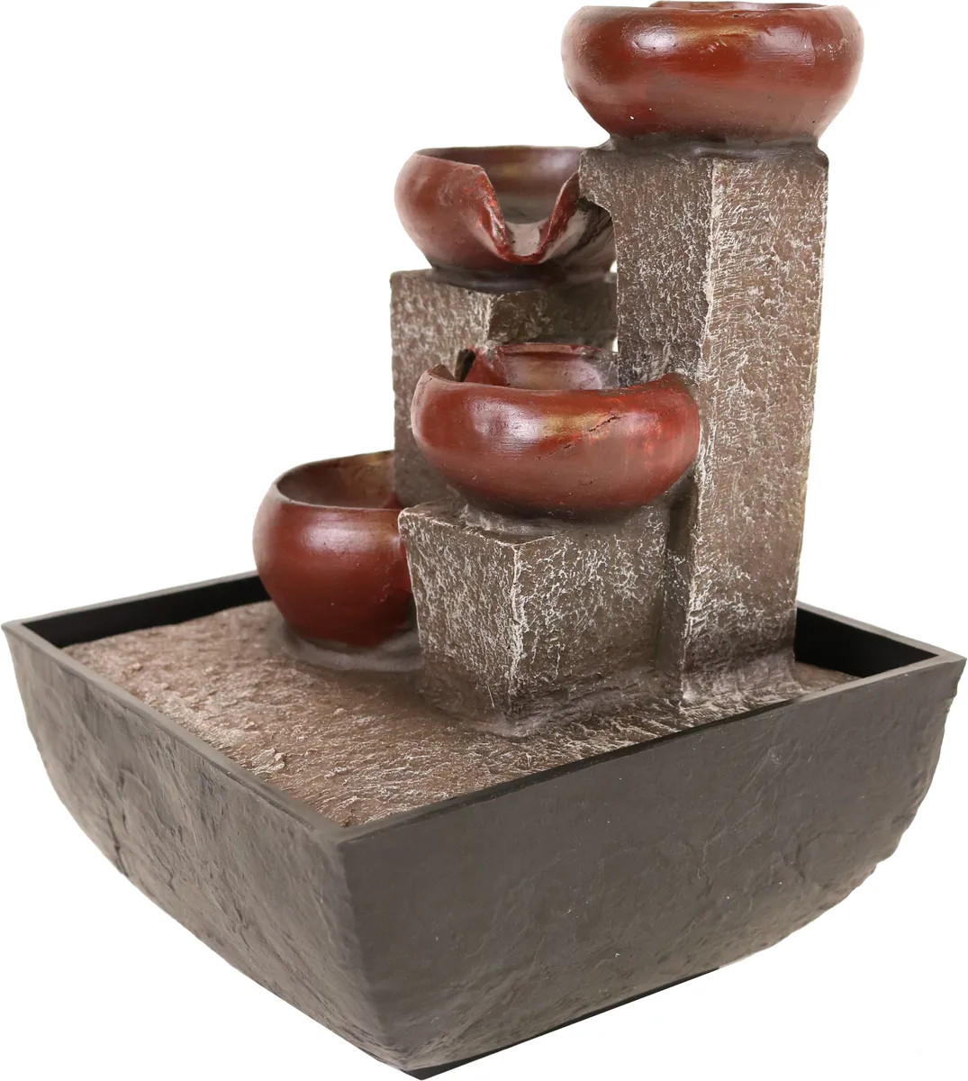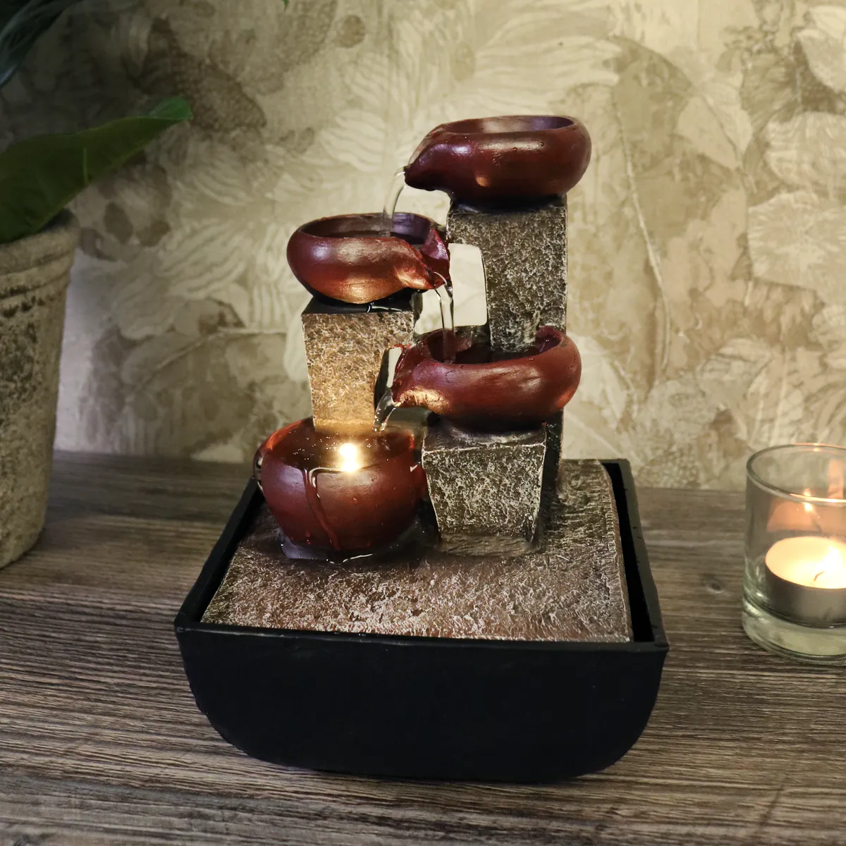 En fin moderne fontene med tre søyler hvor vannet renner fra urnene over på en LED-lampe som lyser og gir et vakkert lysbilde. Et varmt og veldig dekorativt, effektivt lys.