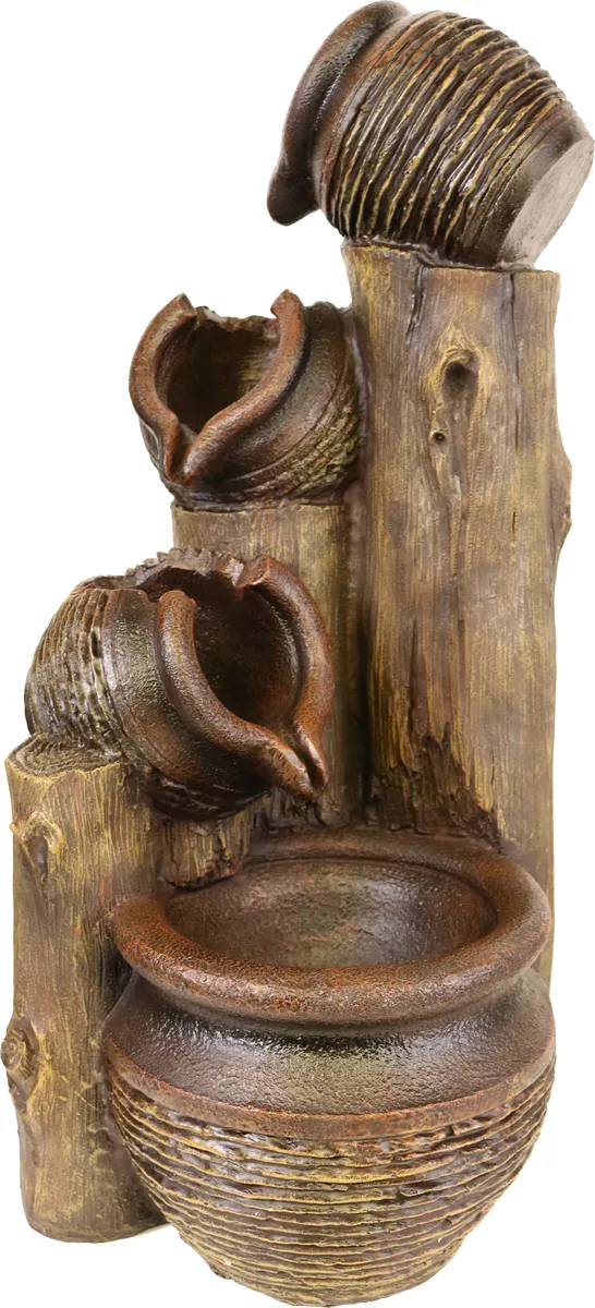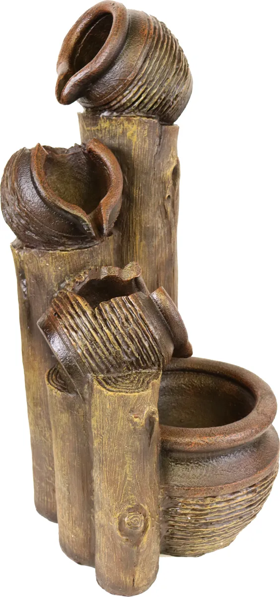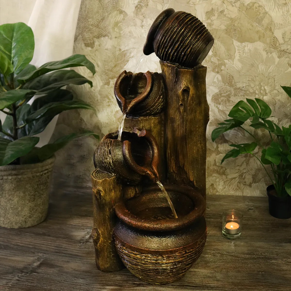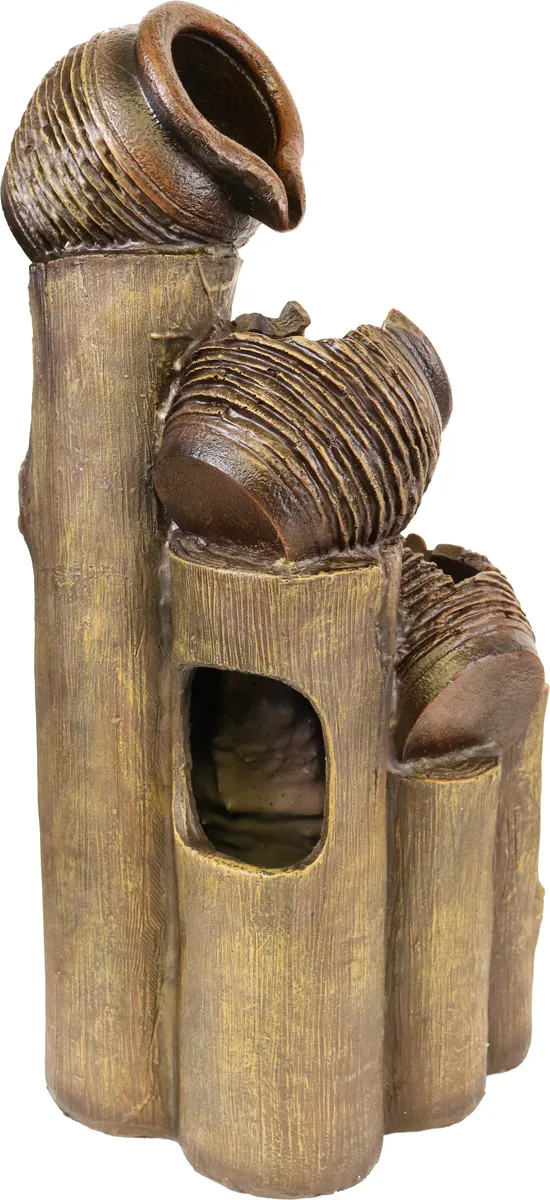 En fin fontene trelignende søyle hvor vannet renner fra urnene i tre tilfeller, ned på en LED-lampe som lyser og gir et vakkert lysbilde. Et varmt og veldig dekorativt, effektivt lys.