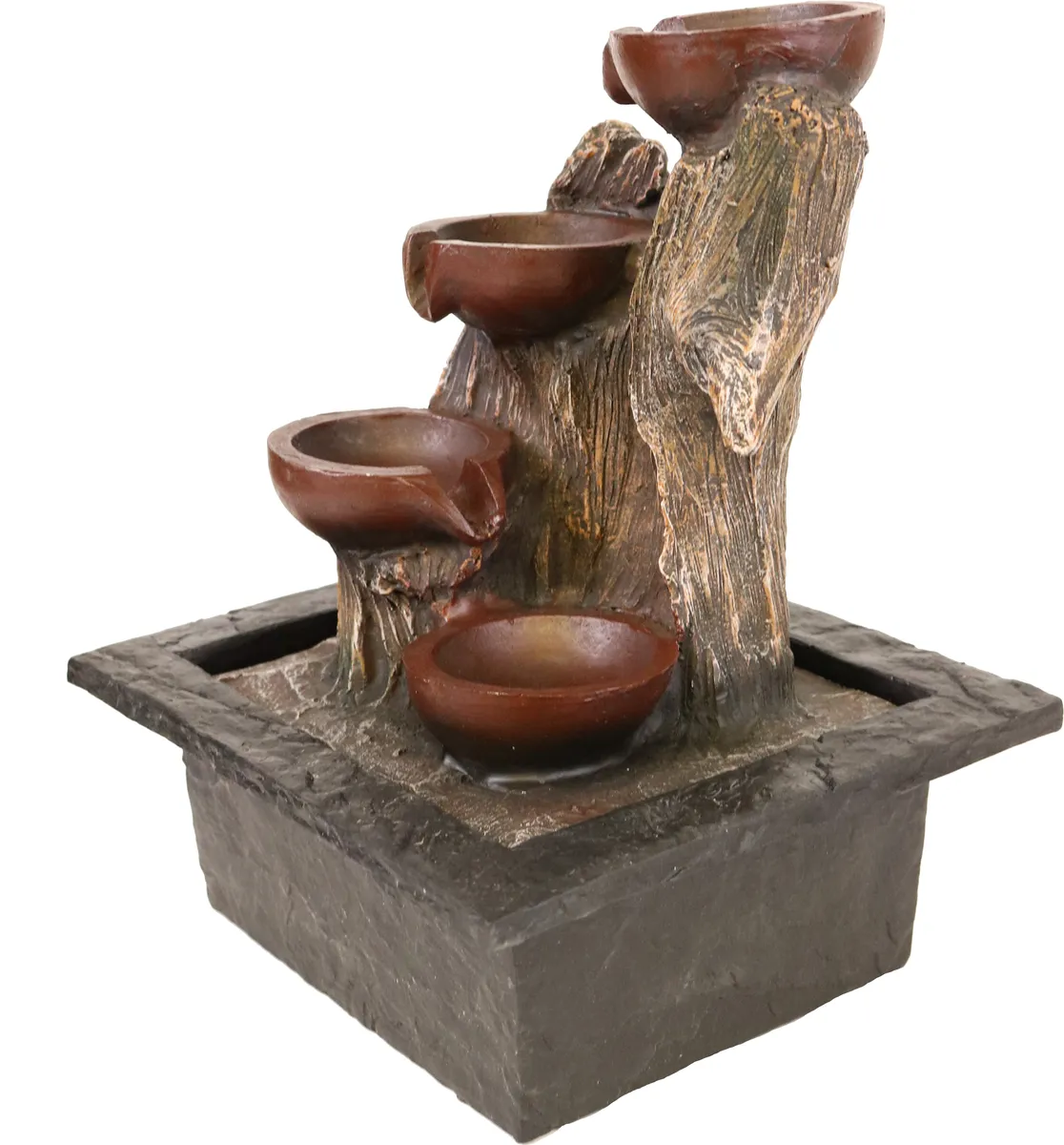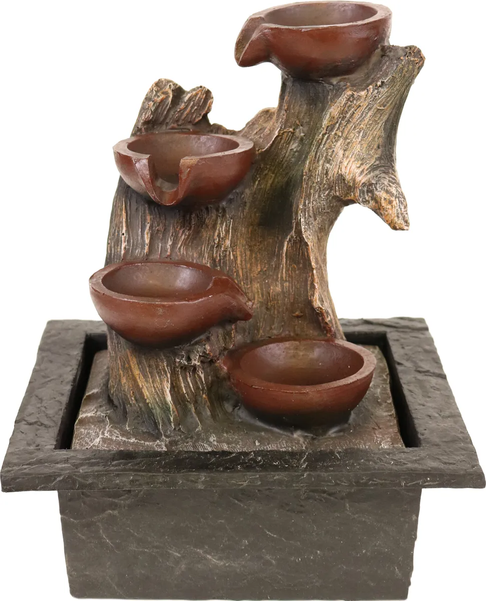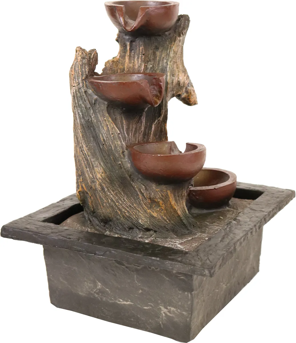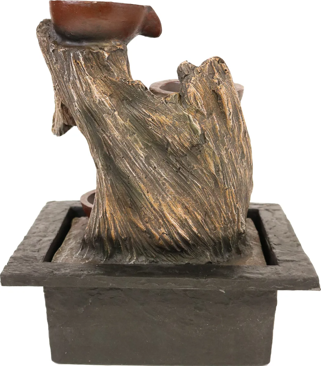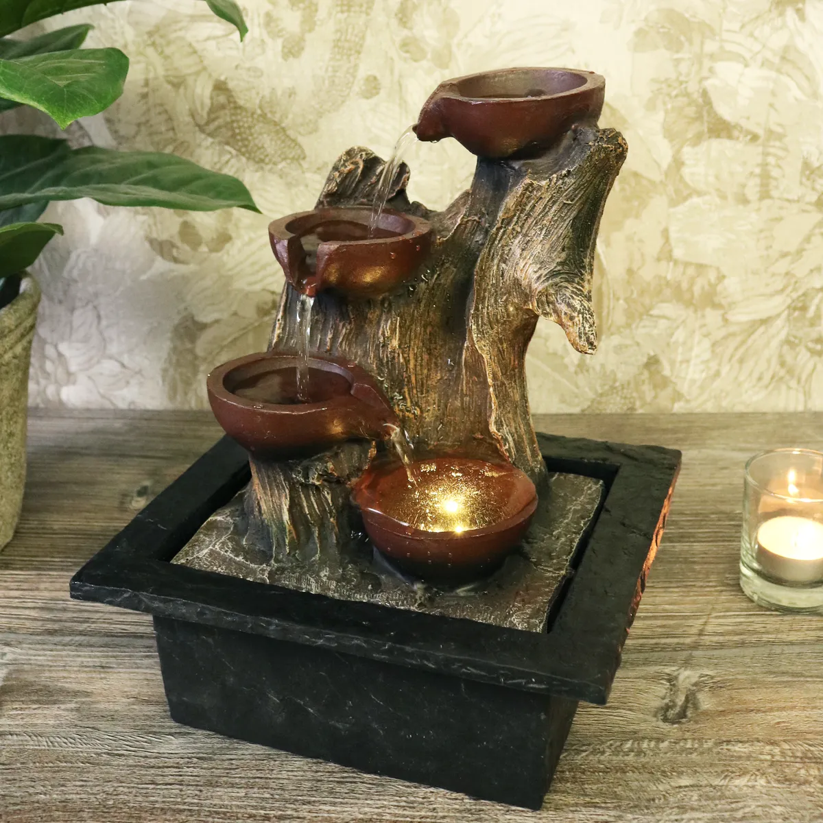 En fin fontene trelignende stamme hvor vannet renner fra urnene i tre tilfeller, ned på en LED-lampe som lyser og gir et vakkert lysbilde. Et varmt og veldig dekorativt, effektivt lys.
