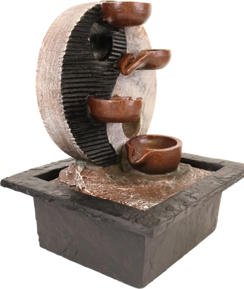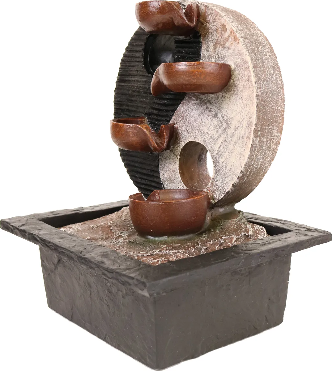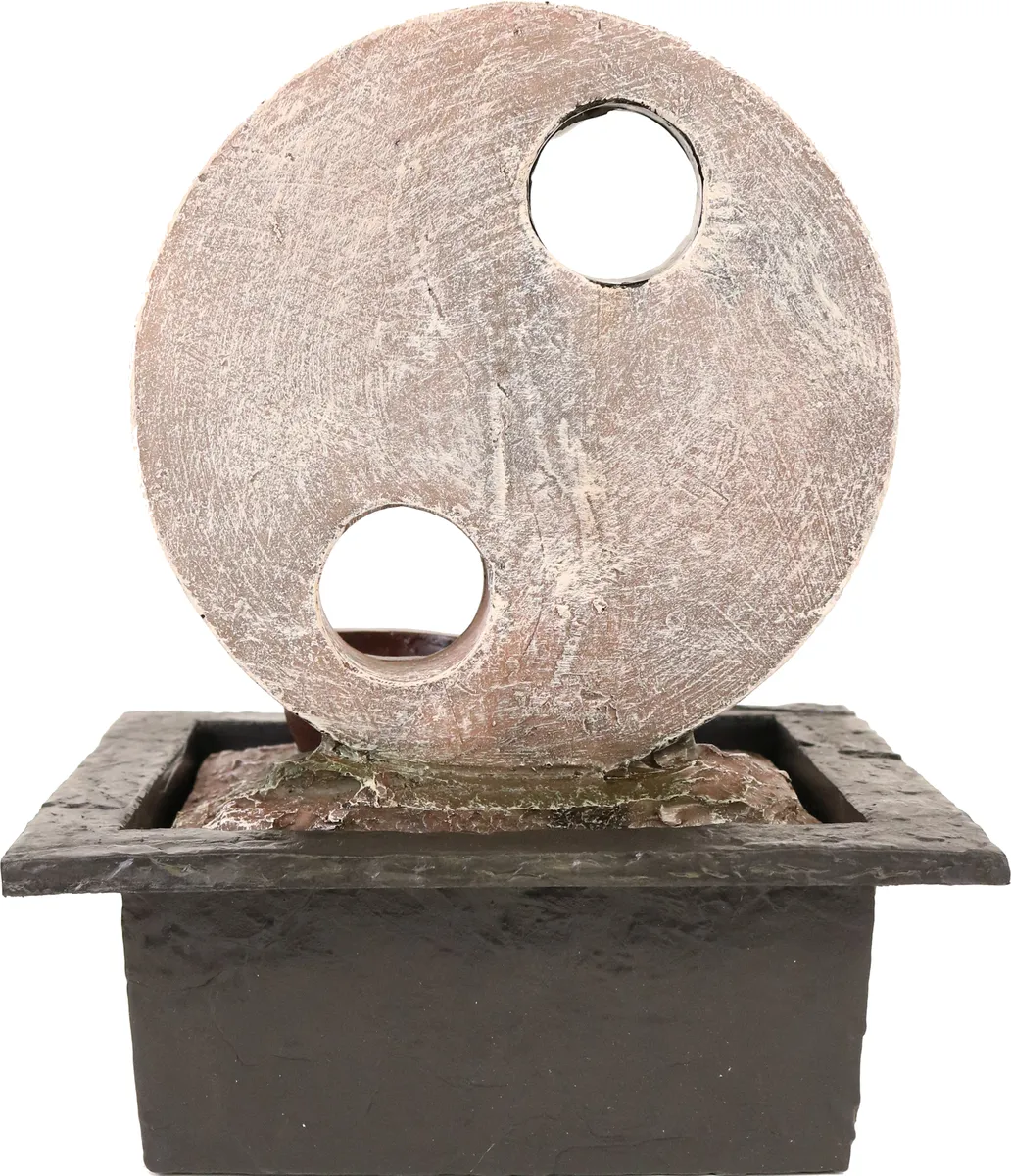 En fin fontene Yin Yang hvor vannet renner fra urnene i tre tilfeller, ned på en LED-lampe som lyser og gir et vakkert lysbilde. Et varmt og veldig dekorativt, effektivt lys.