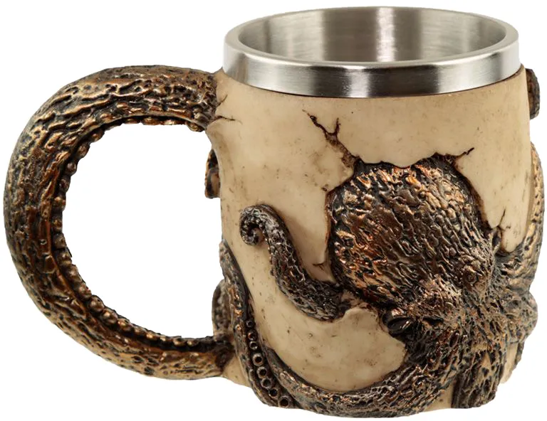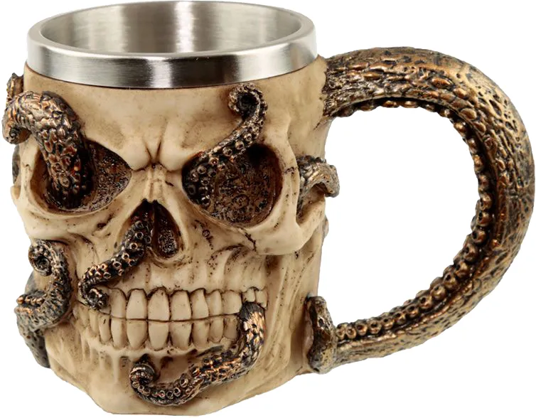 Hodeskallekrukke med hodeskalle hvor en bronsefarget blekksprut kryper rundt. Kult håndmalt med fine detaljer. Seildelen er laget av rustfritt stål. MERK! Vaskes for hånd, IKKE maskinvask! Perfekt for de som liker bleier og tøffe pyntegjenstander.