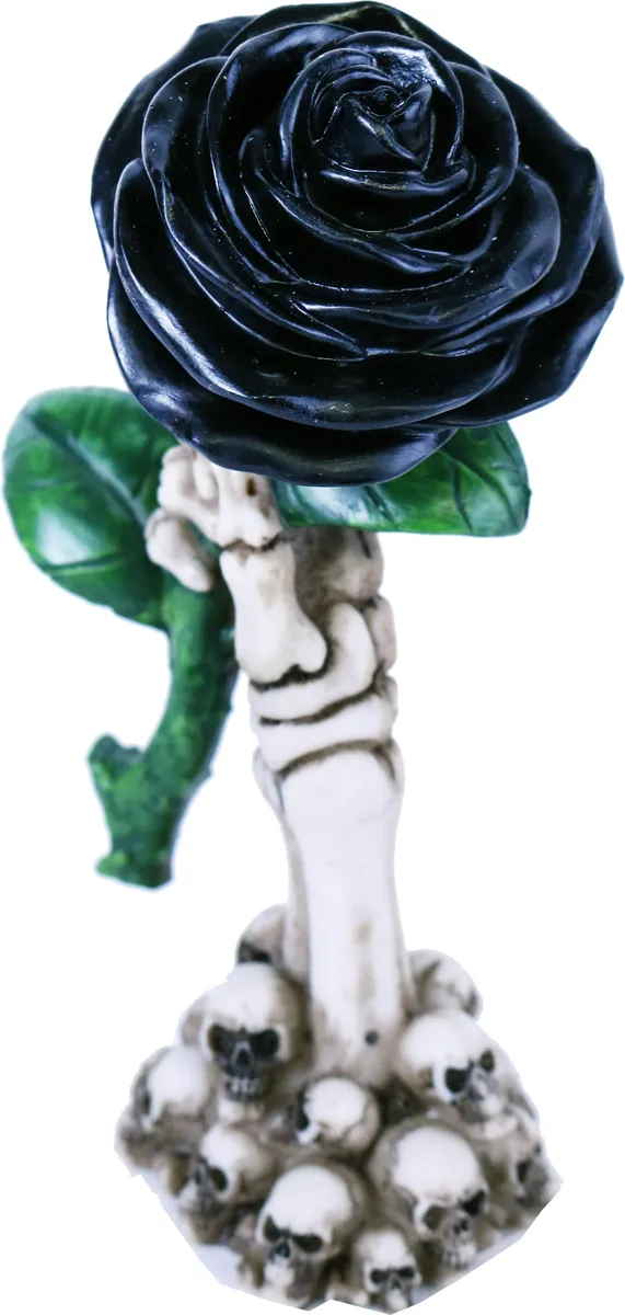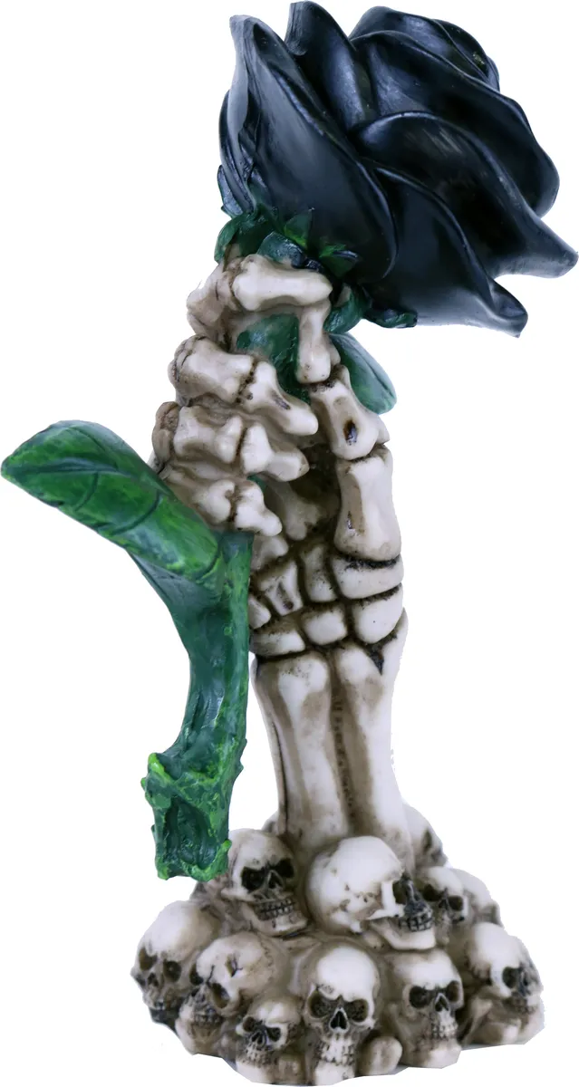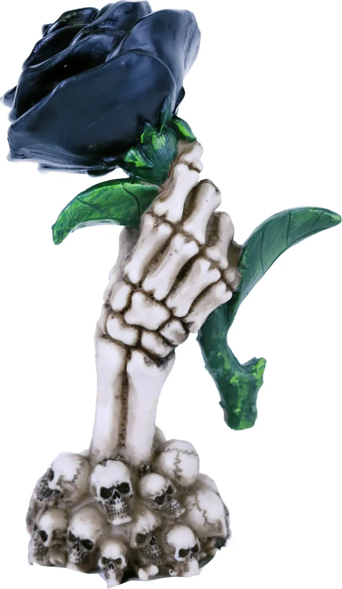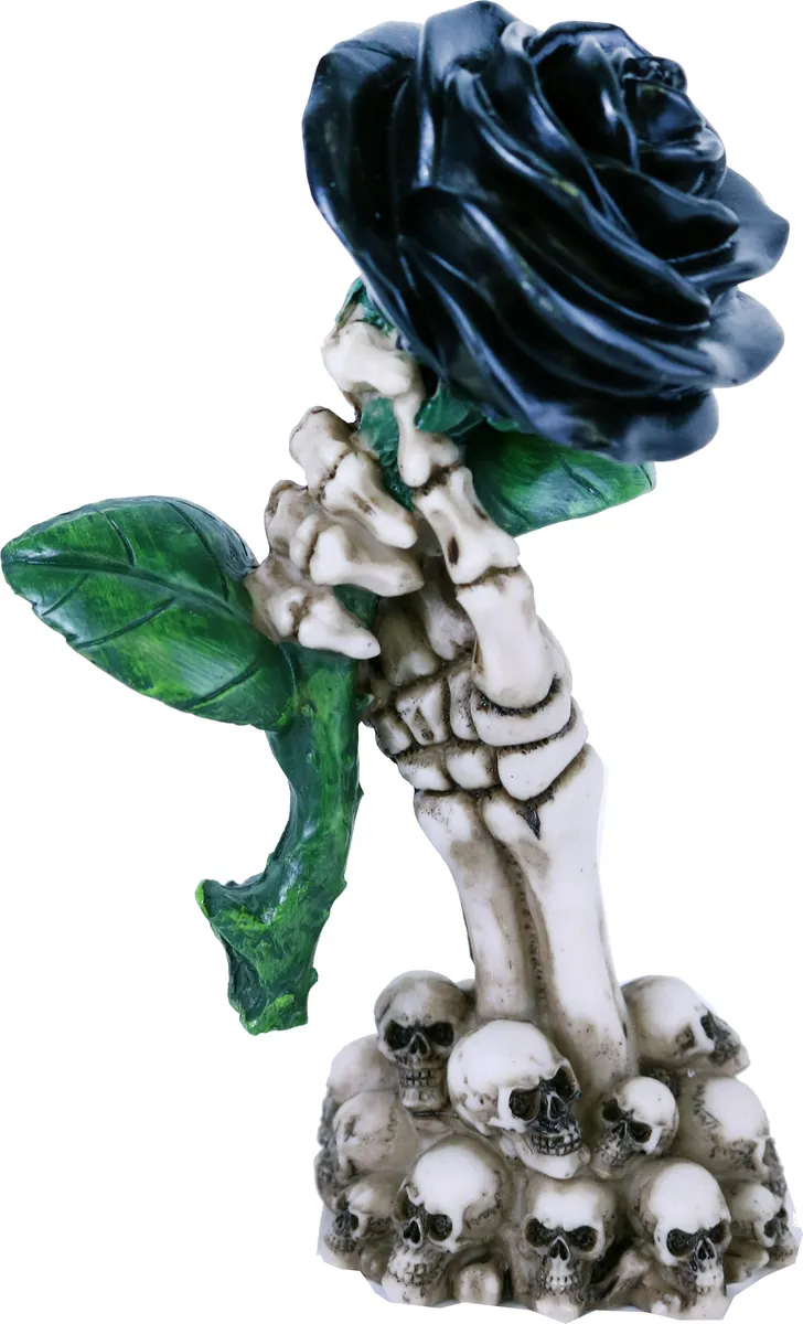 Stilig interiørdetalj. Ser ut som hodeskallen kommer ut av bakken med en svart rose i hånden. Perfekt for de som liker tøff og spesiell innredning, ulike figurer og gotisk stil.
