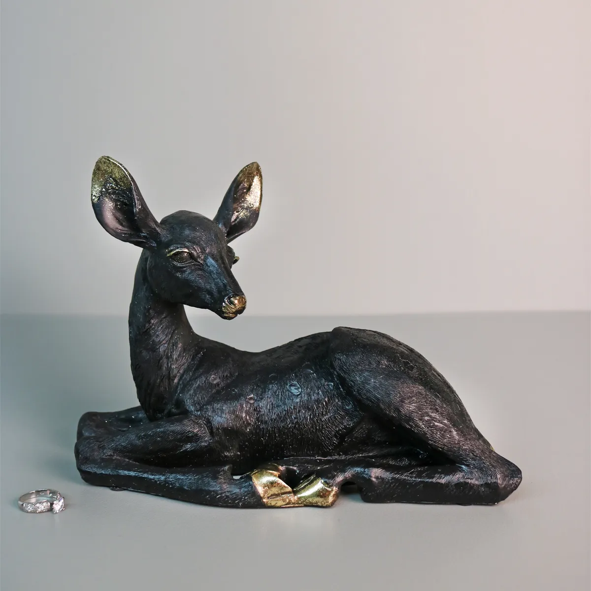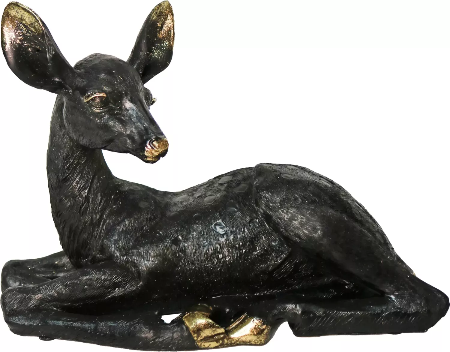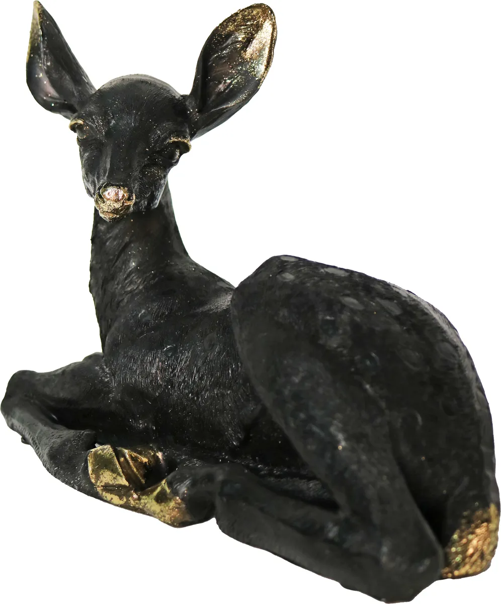 Fin svart hjortstatue med gulldetaljer. Perfekt for de som liker stilig design og annerledes interiørdesign, unike ornamenter, fine pyntegjenstander, kult interiør. Denne staselige figuren i hjemmet vil vekke oppmerksomhet.
