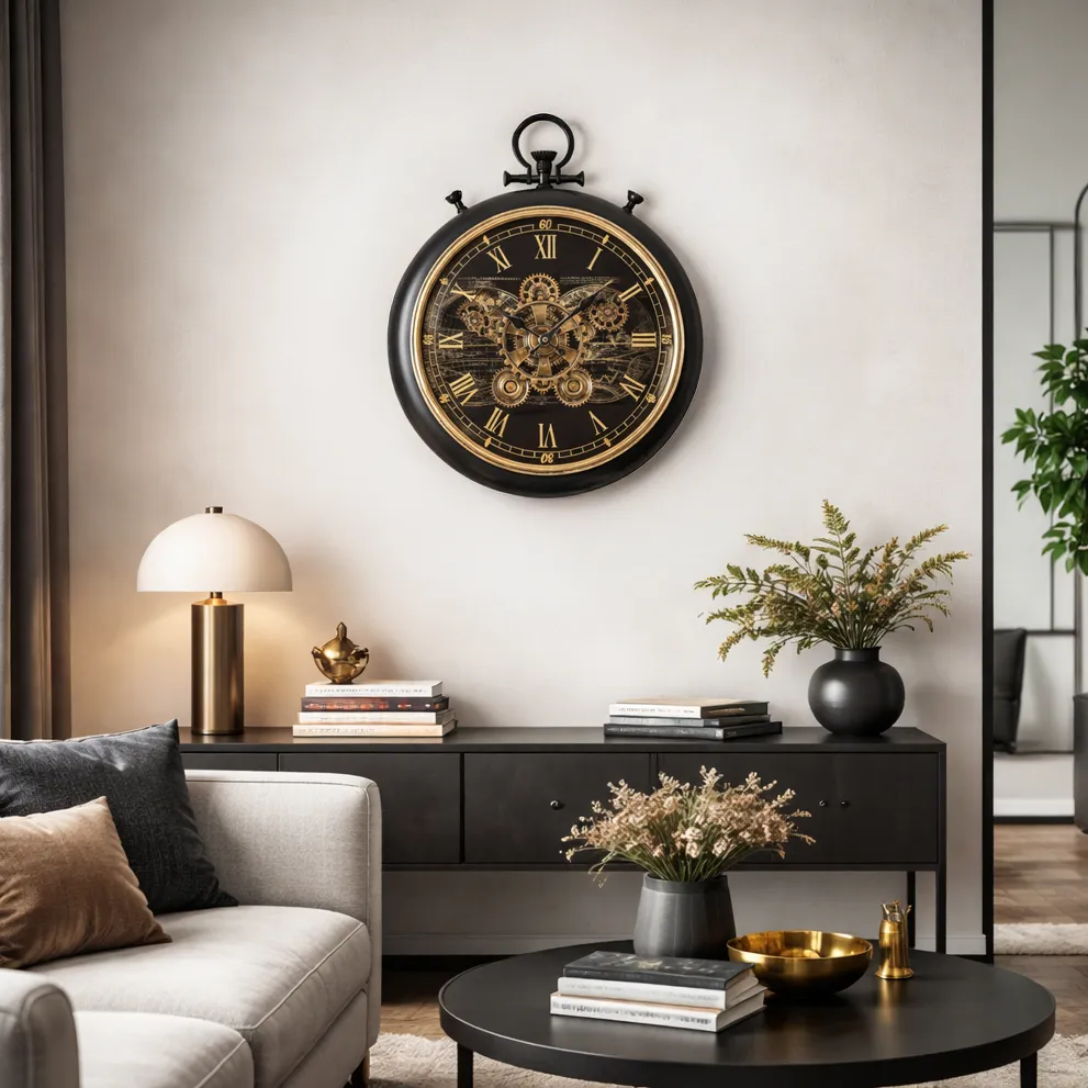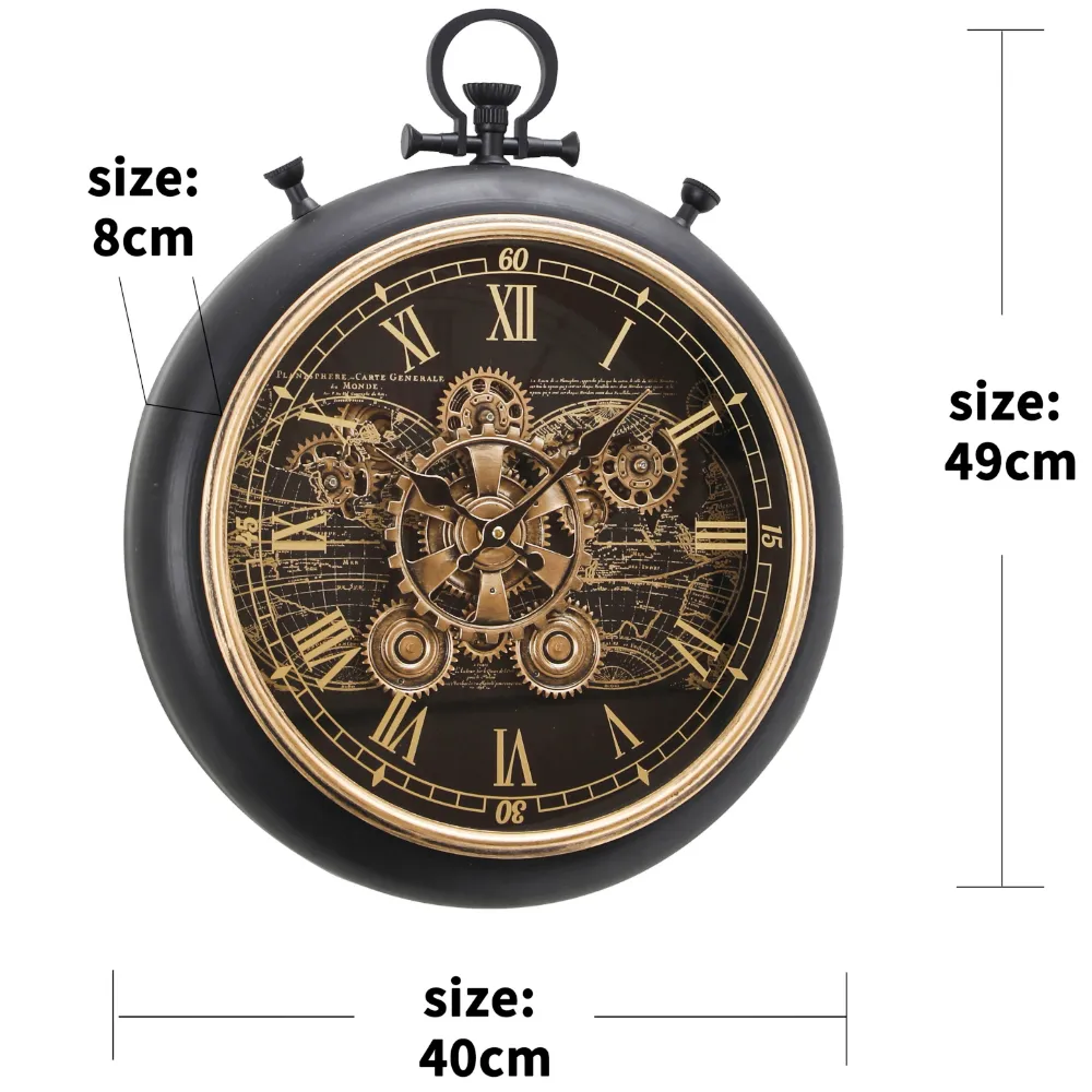 Skap et kraftfullt blikkfang i hjemmet ditt med denne eksklusive veggklokken med bevegelige tannhjul. Klokken kombinerer industriell steampunk-estetikk med moderne interiørstil, noe som gjør den til et perfekt valg for stue, kontor, gang eller lounge.