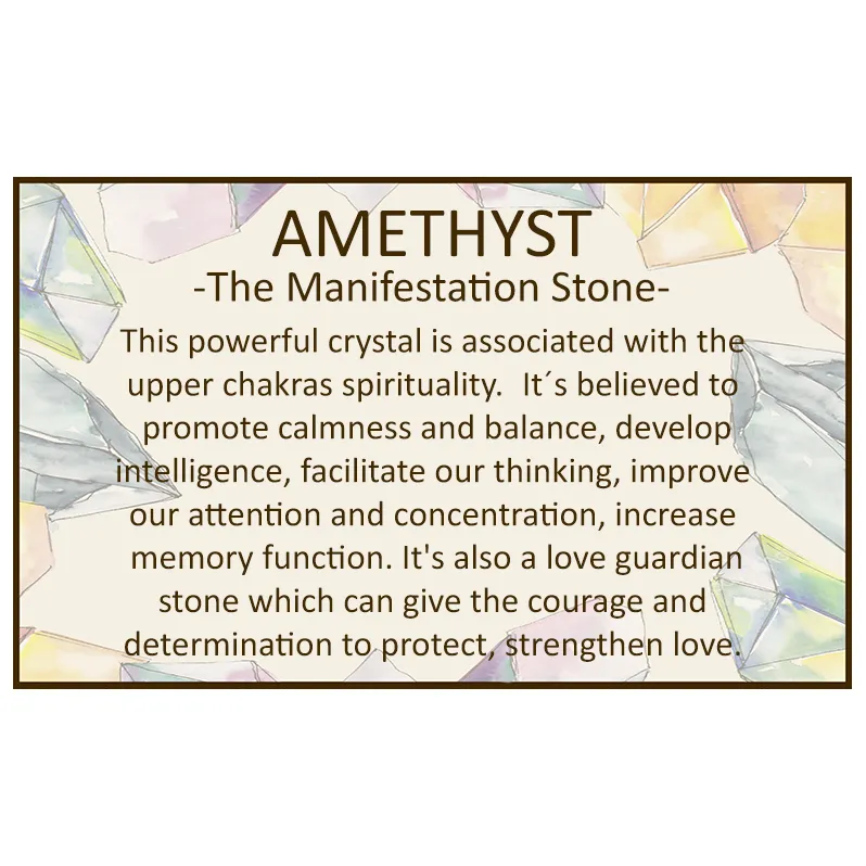 Alle krystaller og edelstener kommer fra naturen og varierer derfor i farge, form og størrelse. Små sprekker kan også være en del av krystallen, men det betyr ikke at den er ødelagt. Din krystall vil være helt unik og perfekt for akkurat deg!
