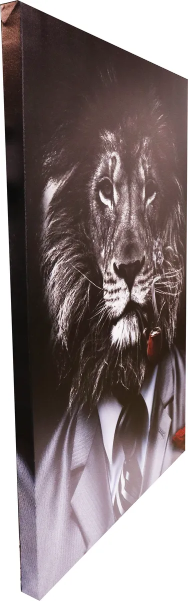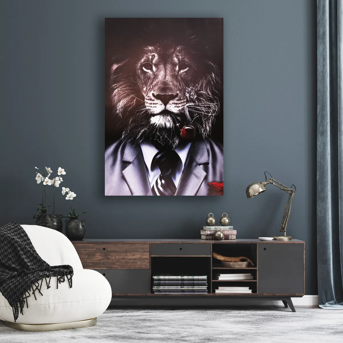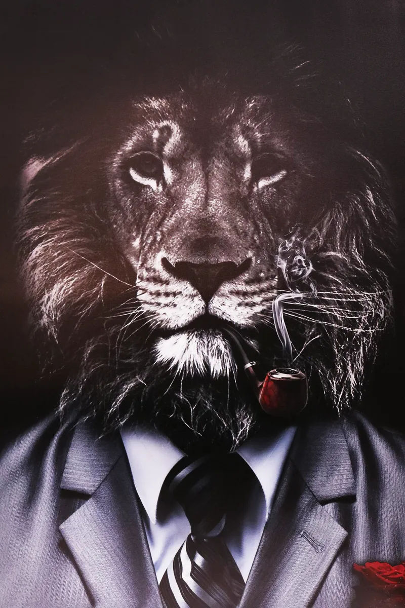 Trykt lerretsmaleri på høykvalitets lerret med et trykk av en løve med pipe i munnen og frakk. Moderne kunst. Maleriet er strukket på en 38mm kileramme, hvor lerretet går over kilerammen så det ikke er synlig, klart for oppheng. Kroker inkludert.