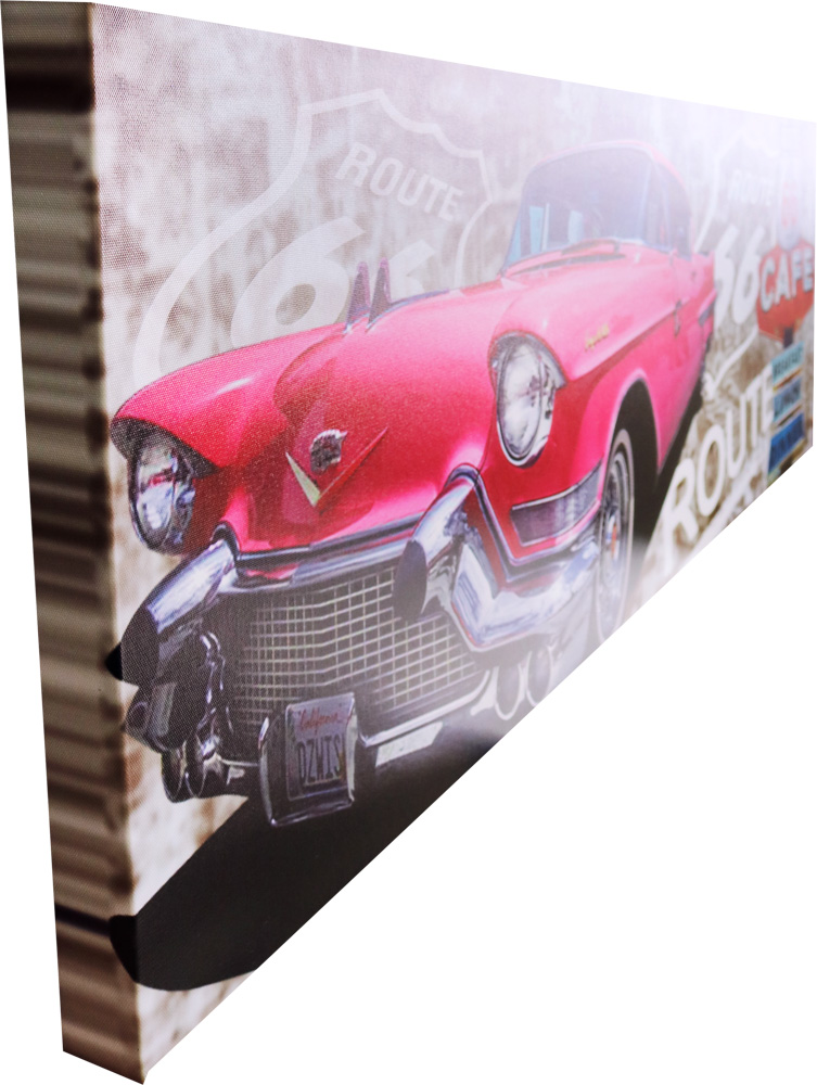 Trykt lerretsmaling på høykvalitets lerret med et trykk av en deilig rosa amerikaner sin gamle bil med rute 66-skiltet.