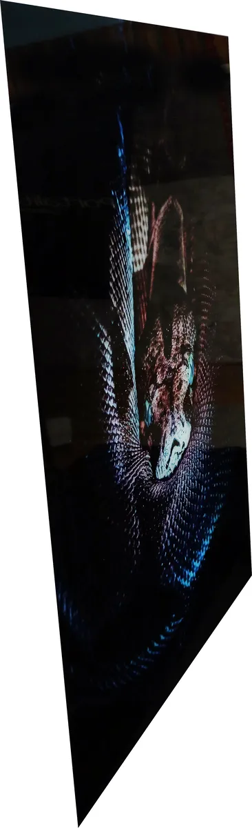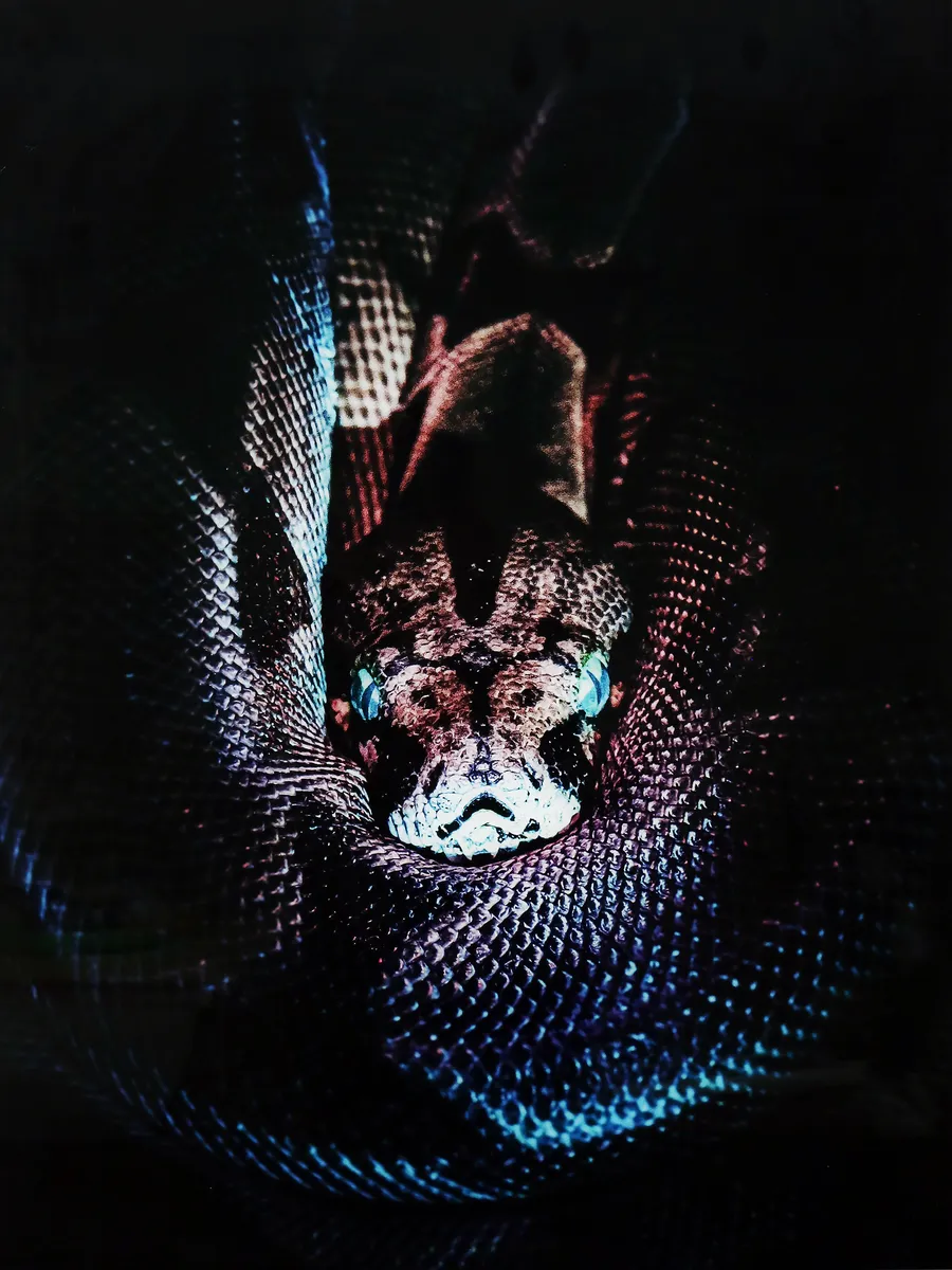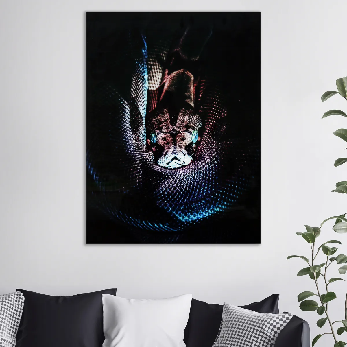 Høykvalitetstrykk på herdet glass for en mer unik og luksuriøs følelse. Fargerikt maleri med motiv av en fin boaslange i blå lilla nyanser, på svart bakgrunn. Perfekt for de som ønsker moderne kunst, dyremalerier, villdyr, lage collager, stilige malerier og interiør til hjemmet.