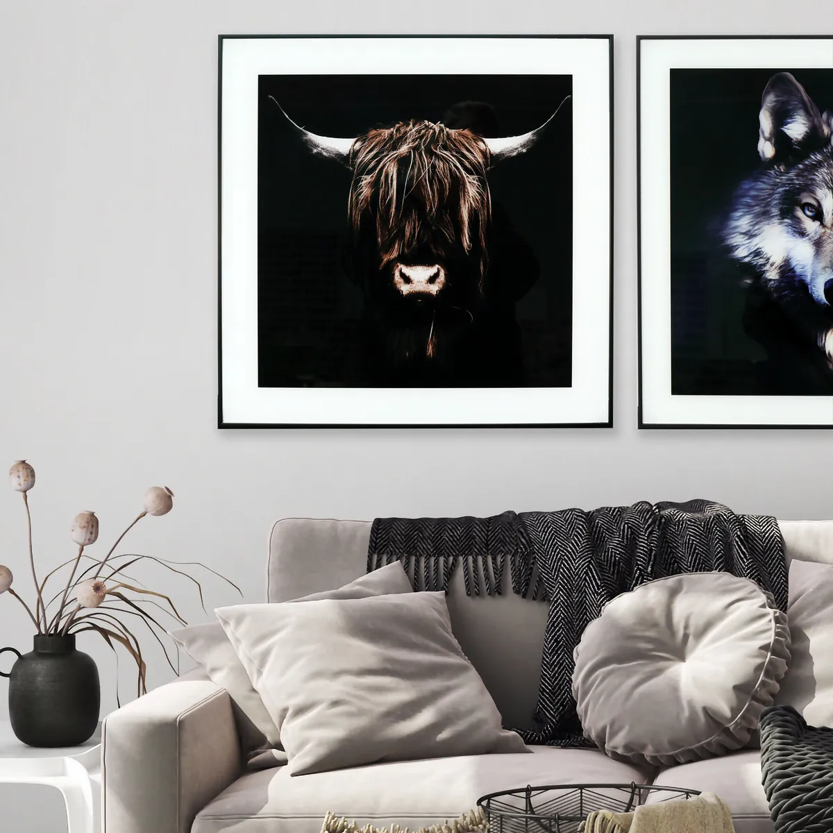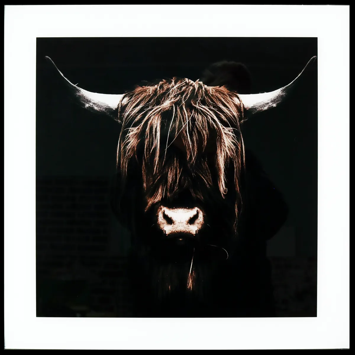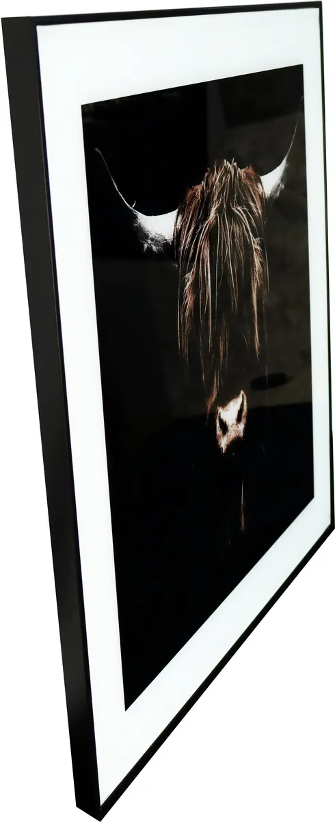 Høykvalitetstrykk på glass for en mer unik og luksuriøs følelse. Svart-hvitt maleri med motiv av en vakker langhåret ku med horn i en matt brun nyanse. Perfekt for de som liker dyremalerier, highland cattle, gårdsmalerier, lage collager, naturmalerier, vakre malerier og interiørdekorasjoner til hjemmet.