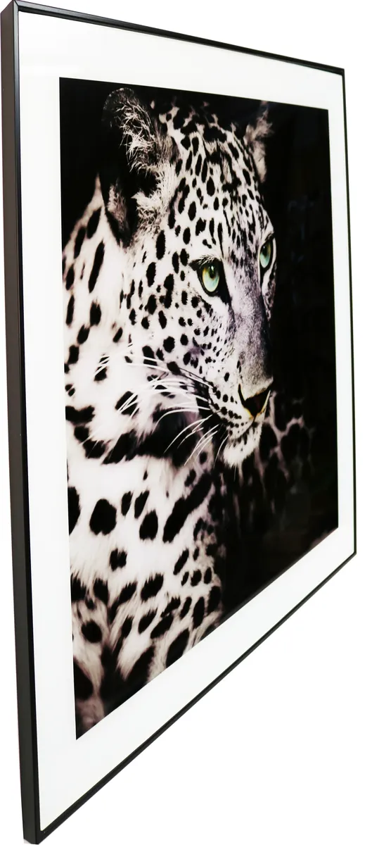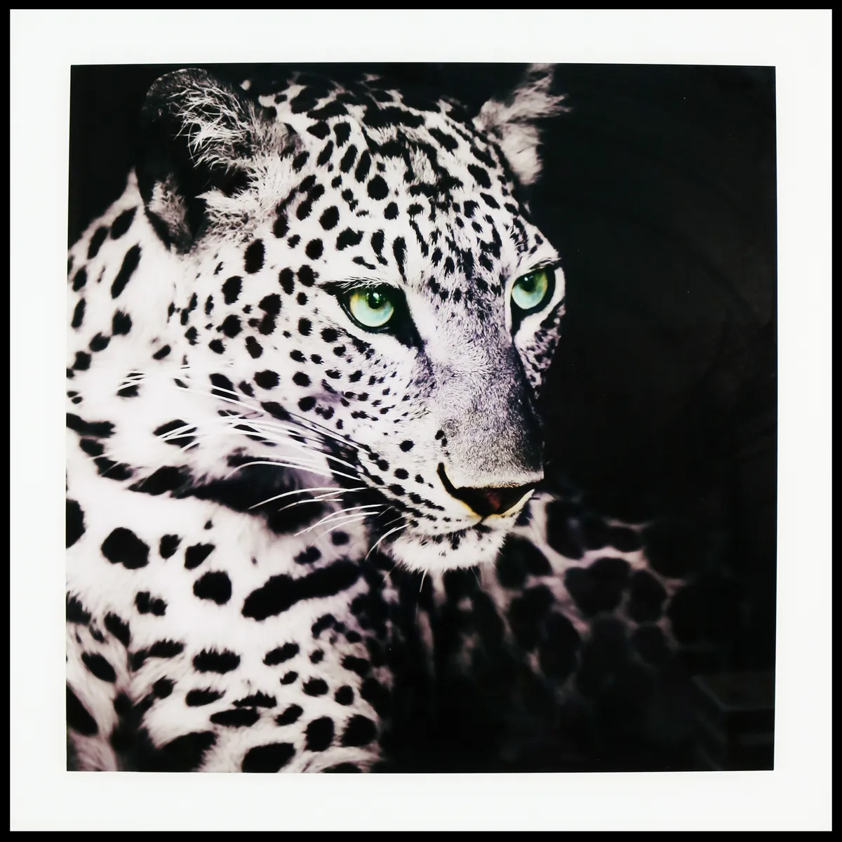 Trykk av høy kvalitet på glass for en mer unik og luksuriøs følelse. Sorthvit maleri hvor motivet er et nærbilde av en konsentrert leopard med grønne øyne som en fin detalj. Perfekt for de som liker dyremalerier, leopardmalerier, lager collager, naturmalerier, stilige malerier og interør til hjemmet.