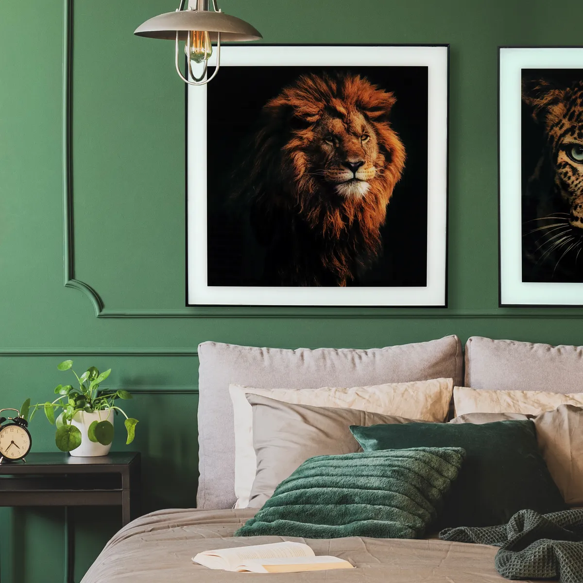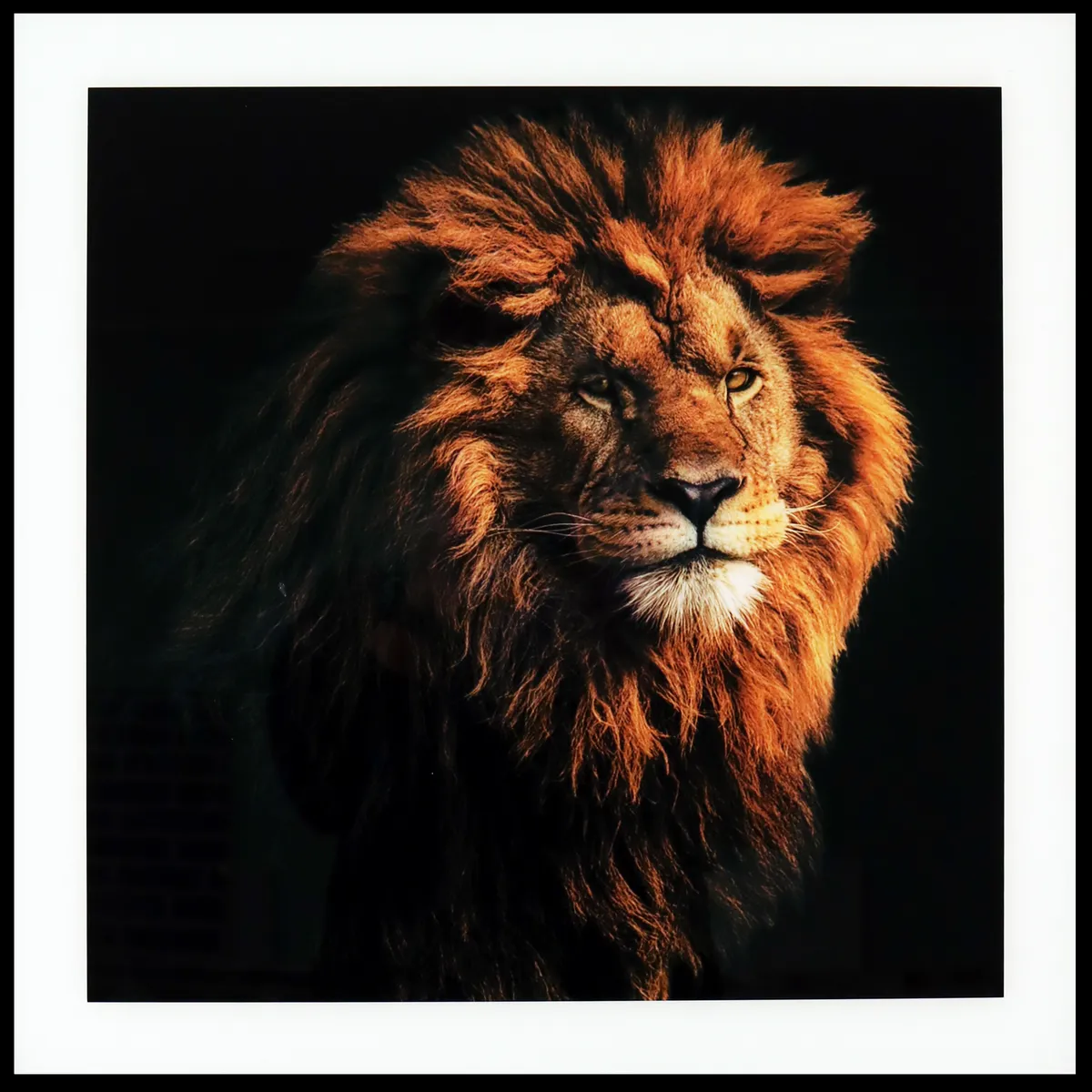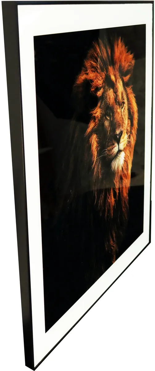 Høykvalitetstrykk på glass for en mer unik og luksuriøs følelse. Fargerikt maleri med motiv av en vakker løve på svart bakgrunn. Perfekt for de som liker dyremalerier, villdyr, afrikanske dyr, lage collager, naturmalerier, vakre malerier og interiørdekorasjoner til hjemmet.