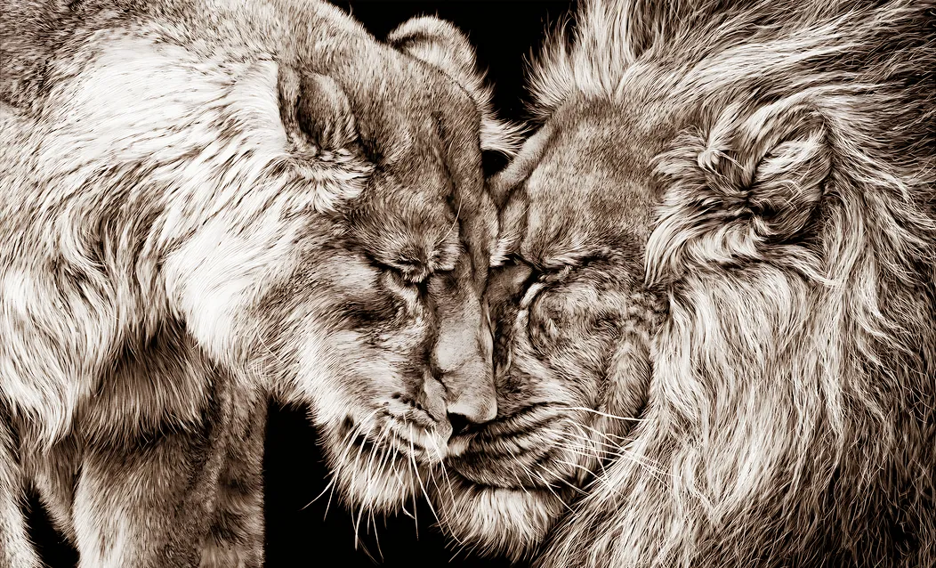 Høykvalitetstrykk på glass for en mer unik og luksuriøs følelse. Svart-hvitt maleri med motiv av to løver som koser. Perfekt for de som liker dyremalerier, ville dyr, afrikanske dyr, lage collager, naturmalerier, vakre malerier og interiørdekorasjoner til hjemmet.