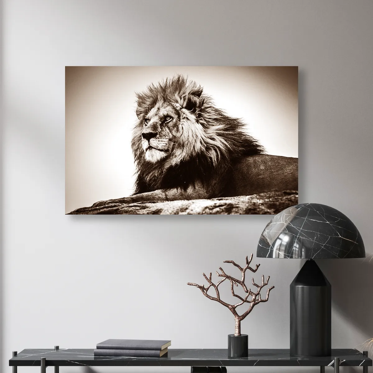 Høykvalitetstrykk på glass for en mer unik og luksuriøs følelse. Svart-hvitt maleri med motiv av en gammel hannløve. Perfekt for de som liker dyremalerier, ville dyr, afrikanske dyr, lage collager, naturmalerier, vakre malerier og interiørdekorasjoner til hjemmet.