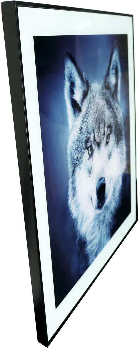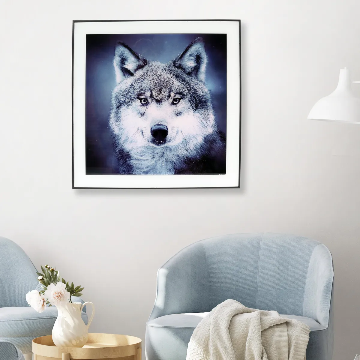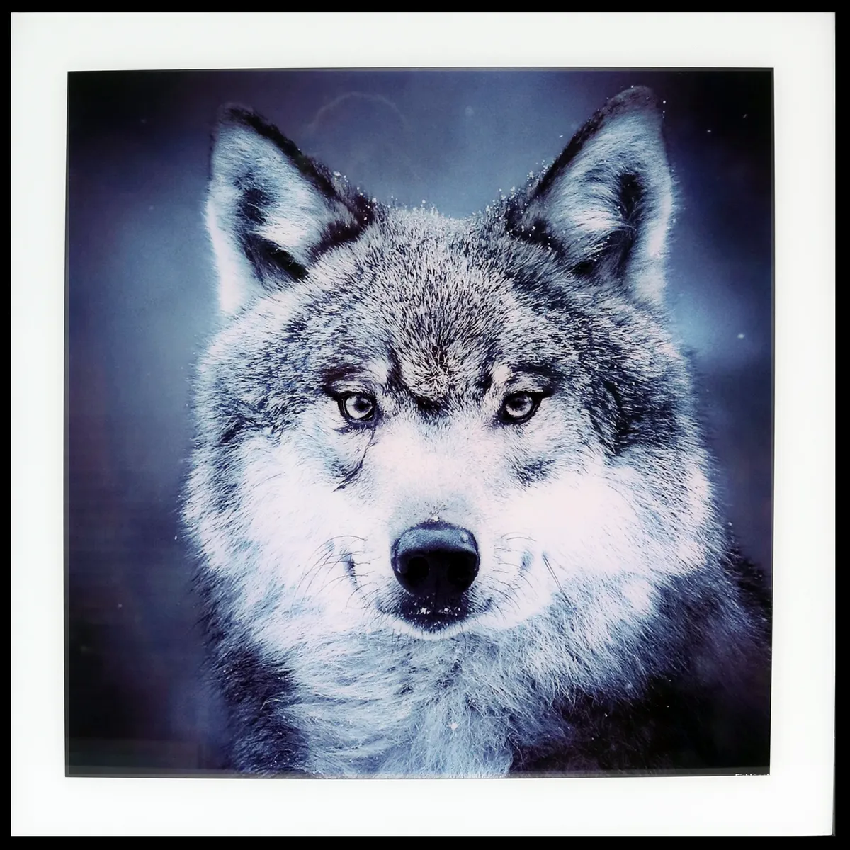 Høykvalitetstrykk på glass for en mer unik og luksuriøs følelse. Maleri med motiv av en vakker ulv i blå nyanser. Perfekt for deg som liker dyremalerier, skandinaviske dyr, villdyr, lage collager, naturmalerier, vakre malerier og interiør til hjemmet.