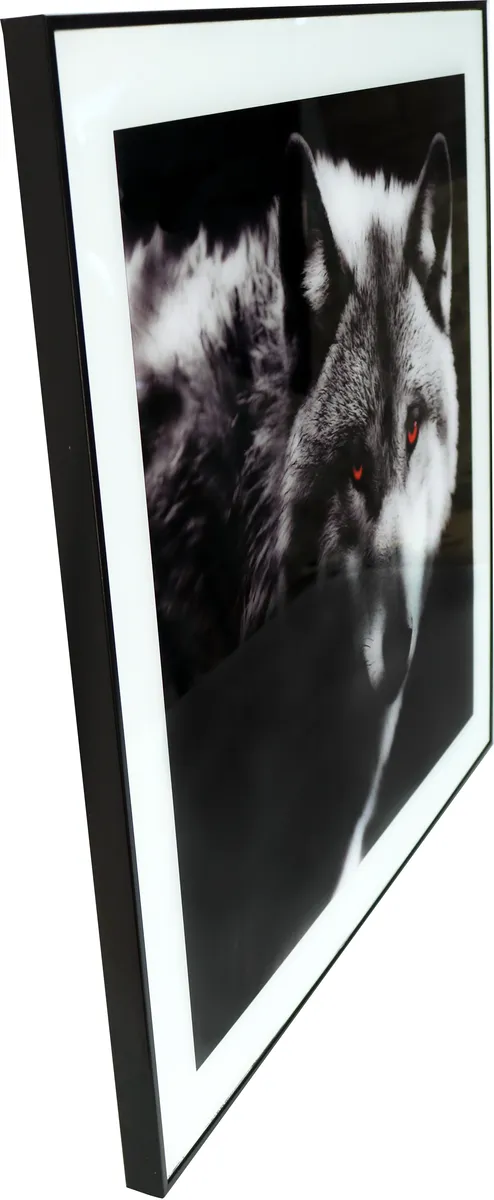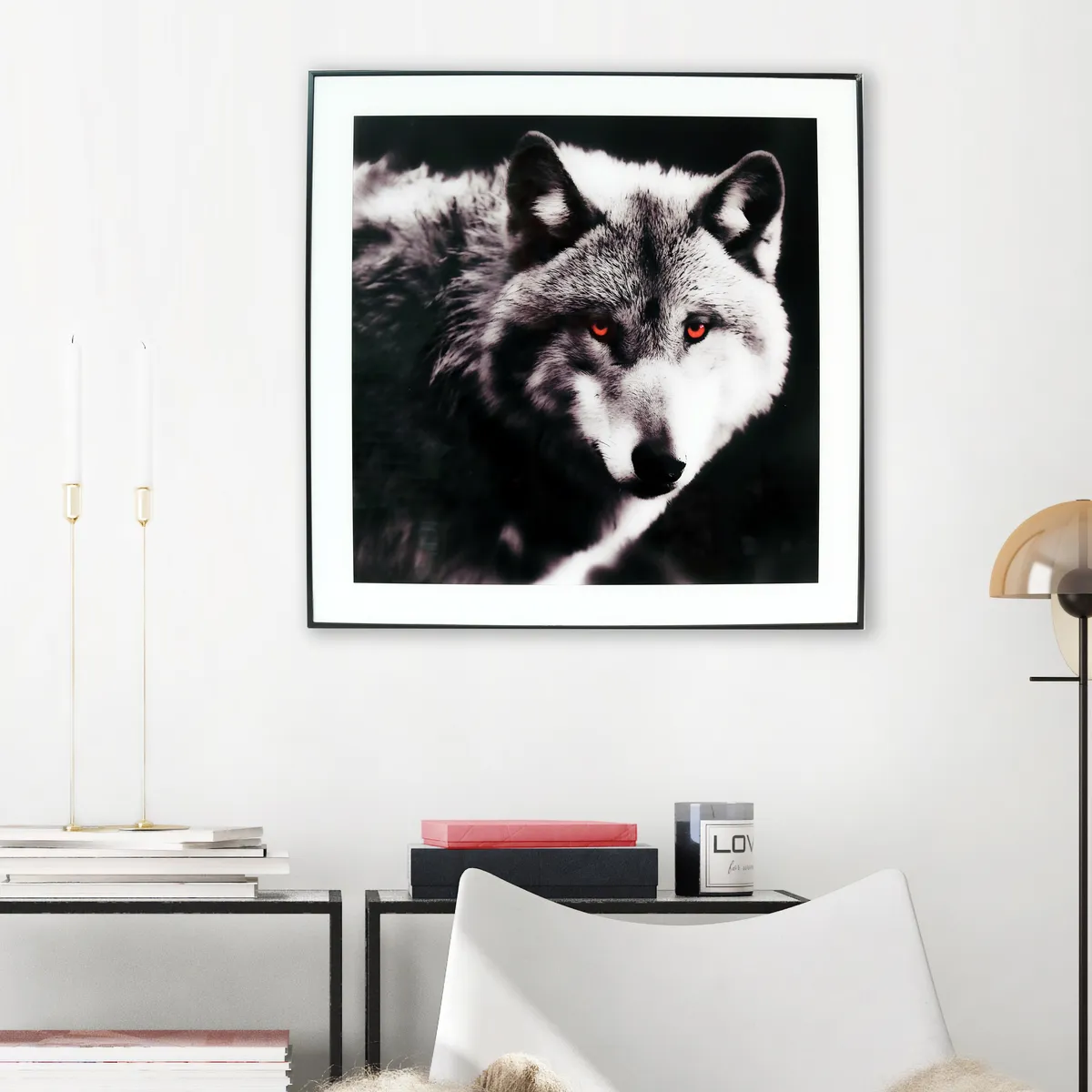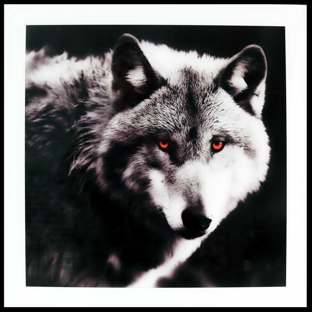 Høykvalitetstrykk på glass for en mer unik og luksuriøs følelse. Svart-hvitt maleri med motiv av en vakker ulv med røde øyne som en fin detalj. Perfekt for deg som liker dyremalerier, skandinaviske dyr, villdyr, lage collager, naturmalerier, vakre malerier og interiør til hjemmet.
