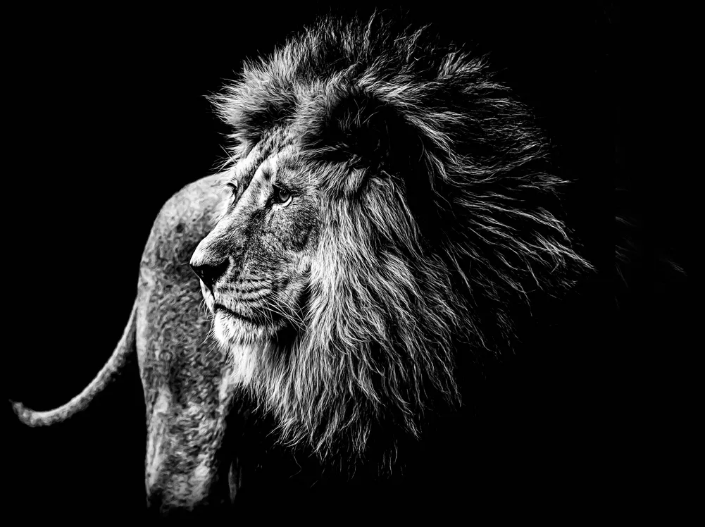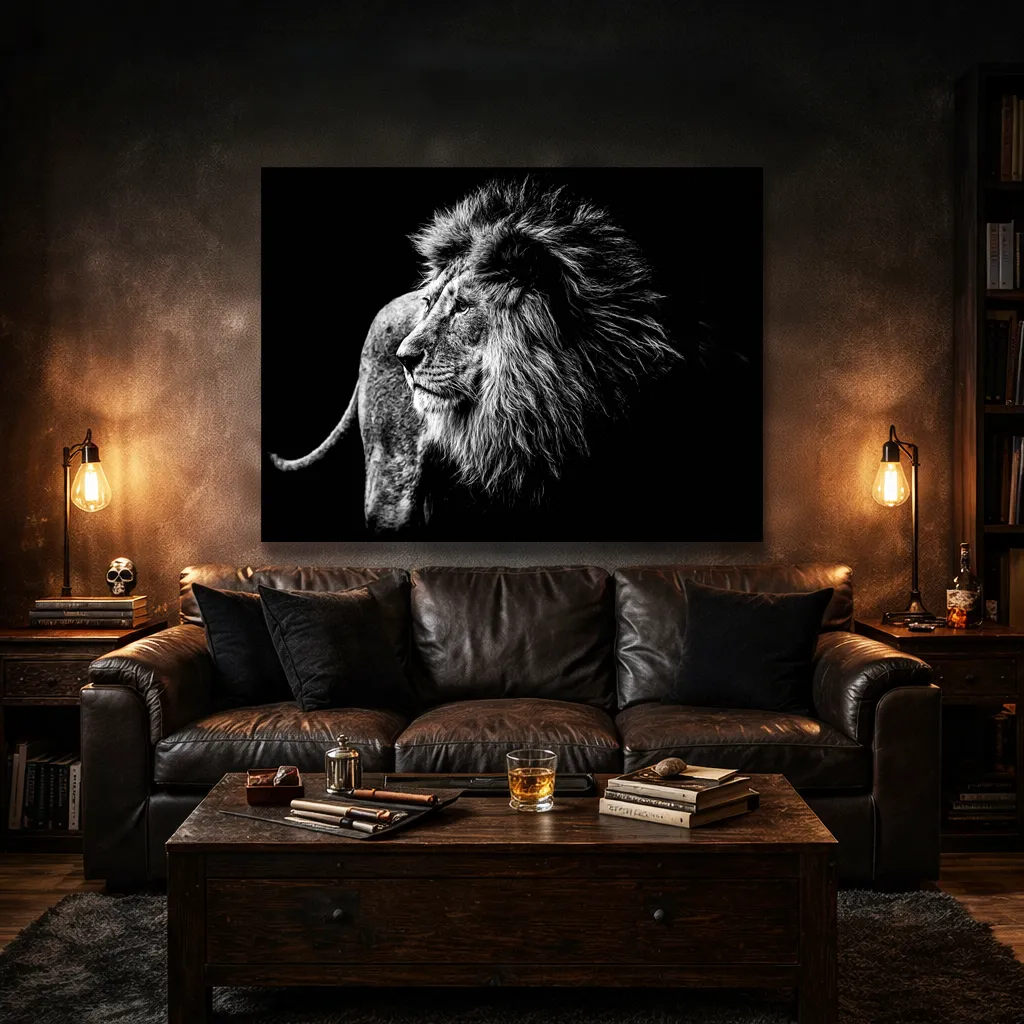 Høykvalitetstrykk på herdet glass for en mer unik og luksuriøs følelse. Svart-hvitt maleri med en vakker løve. Perfekt for de som liker dyremalerier, ville dyr, afrikanske dyr, lage collager, naturmalerier, vakre malerier og interiørdekorasjoner til hjemmet.