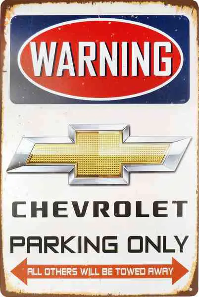 Chevrolet, symbolet på amerikansk styrke, kraft og klassisk bilkultur. Dette metallbildet med teksten ”Warning Chevrolet Parking Only” er laget for alle som med stolthet kjører en bil med den ikoniske gullfargede logoen på fronten. En tydelig måte å vise hvem som bestemmer på din parkeringsplass, samtidig som den sprer sjarm og humor.