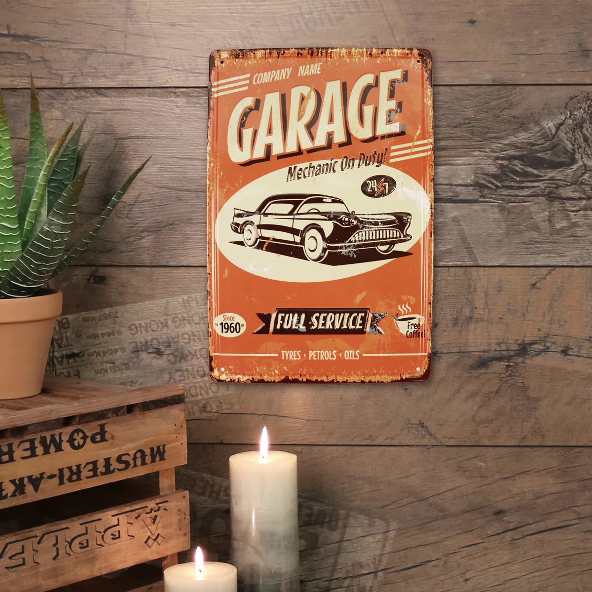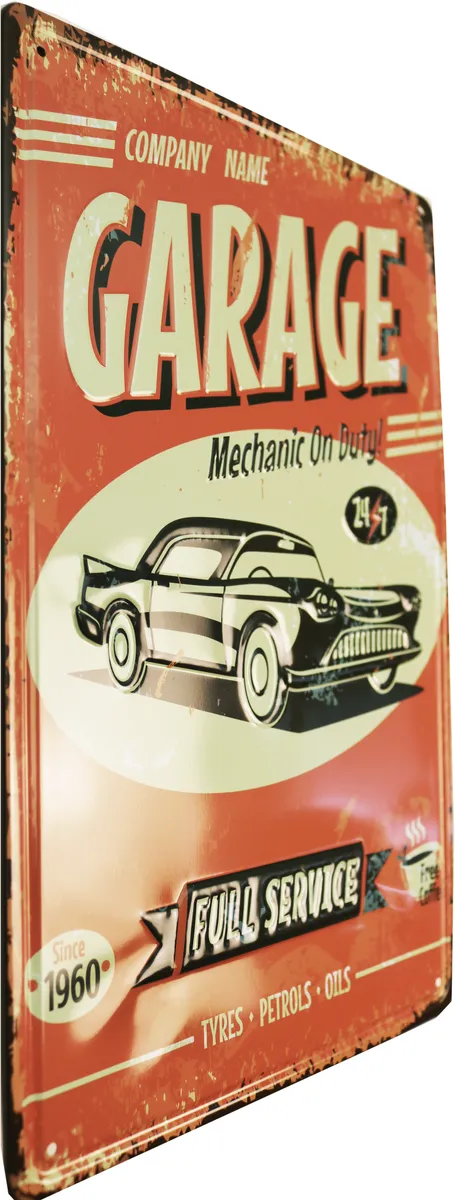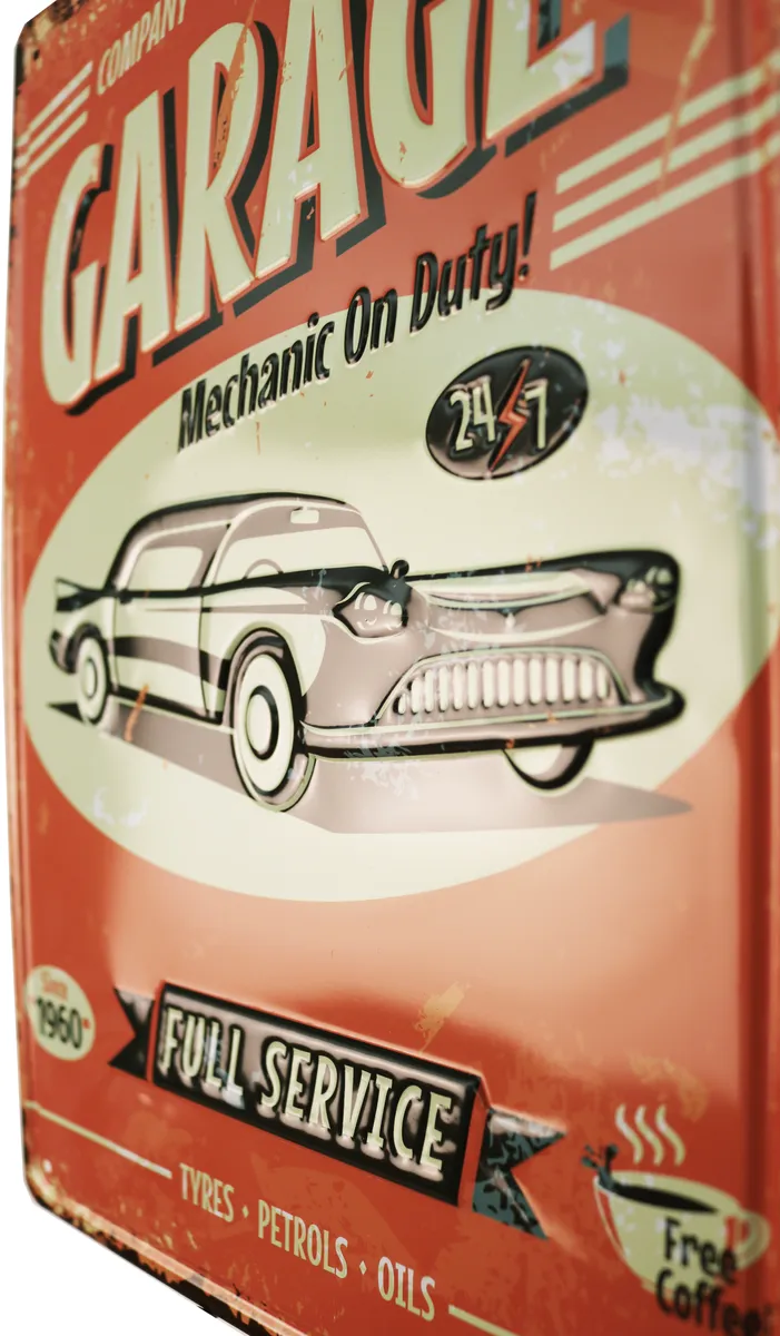 Metallbilde 3D Garage. Perfekt for de som liker motorsykler, MC-er, oldies, dekor til garasjen, baren eller for de som liker gamle retroreklameskilt.