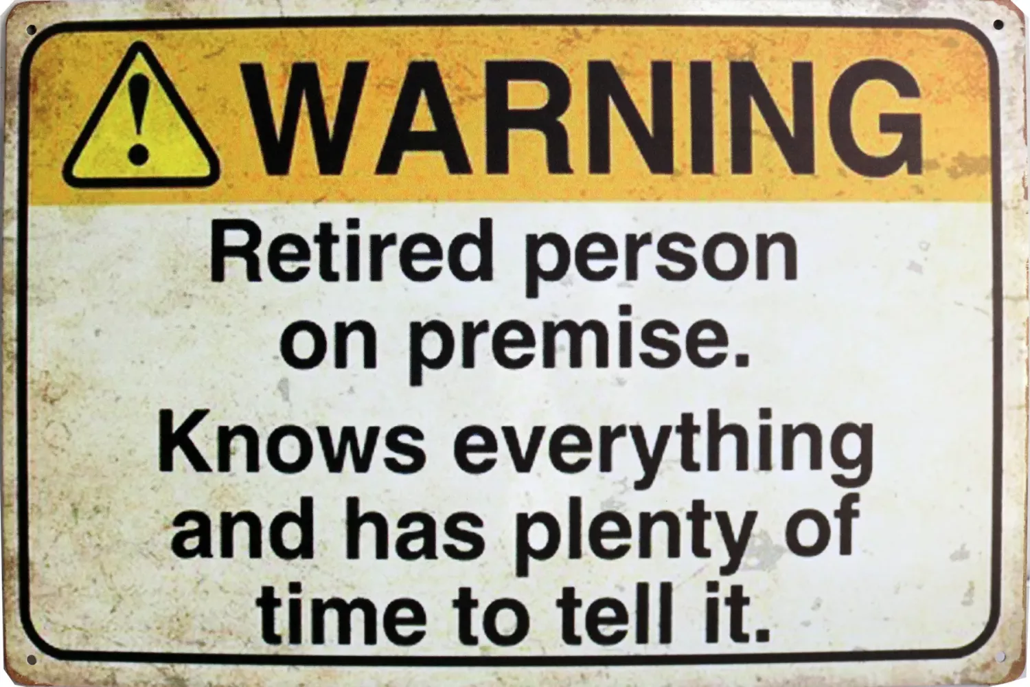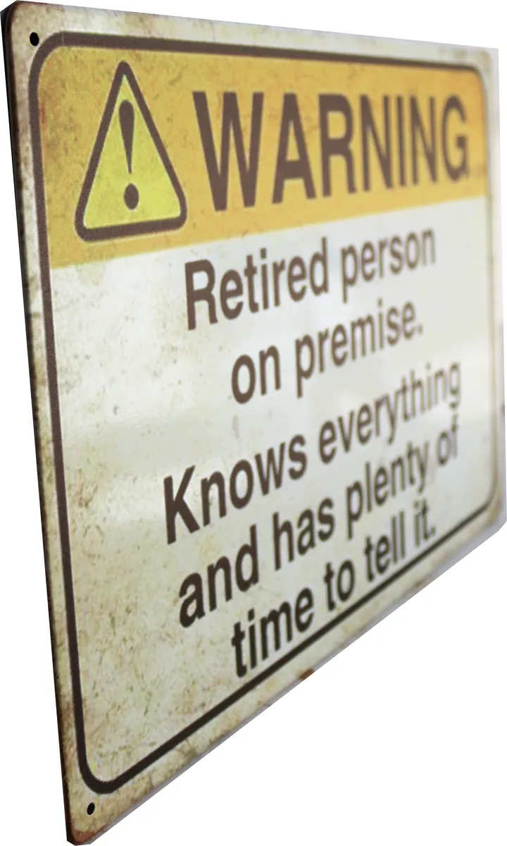 Man ser det på avstand og begynner automatisk å smile. Teksten advarer mot noe langt hyggeligere enn fare: en pensjonist som både vet alt og har god tid til å fortelle om det. Denne metalltavlen fanger den perfekte balansen mellom humor og hverdagsklokskap, og minner om alle de gode historiene som starter med “da jeg var yngre…”.
