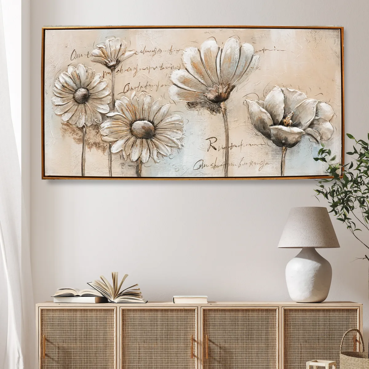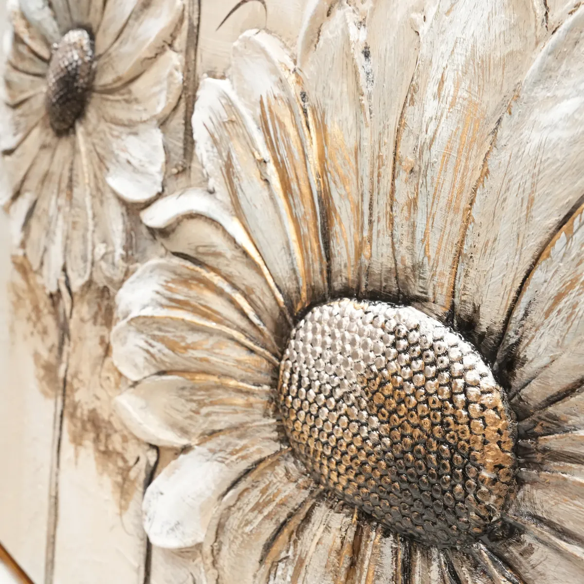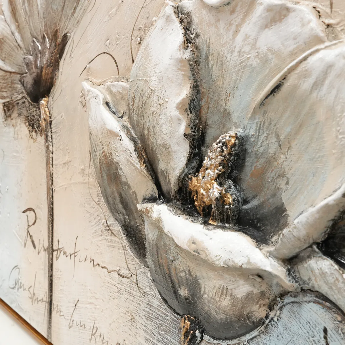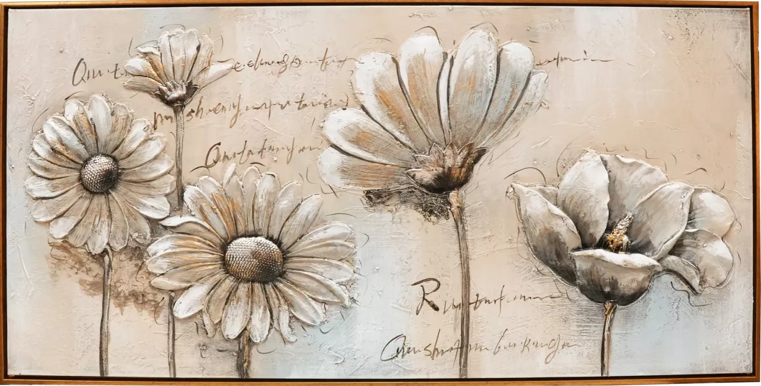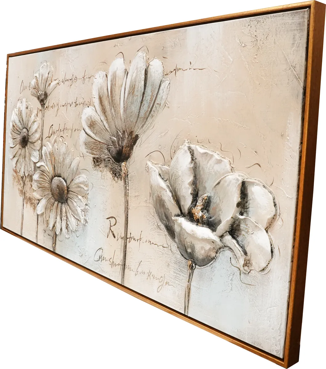 Vakkert oljemaleri av blomster i fine varme lyse nyanser med gulldetaljer. Blomstene er støpt i noe akryllignende materiale for å få en mer dyp og levende følelse, 3D.