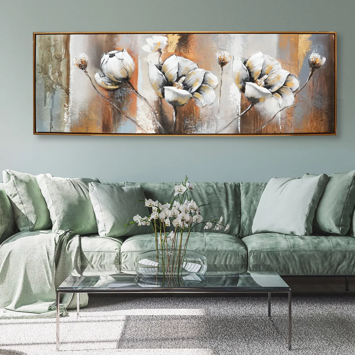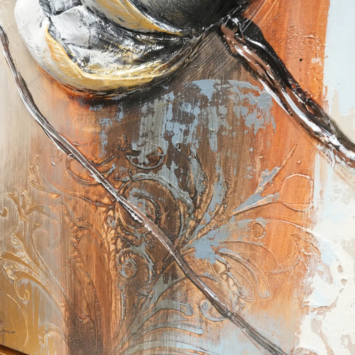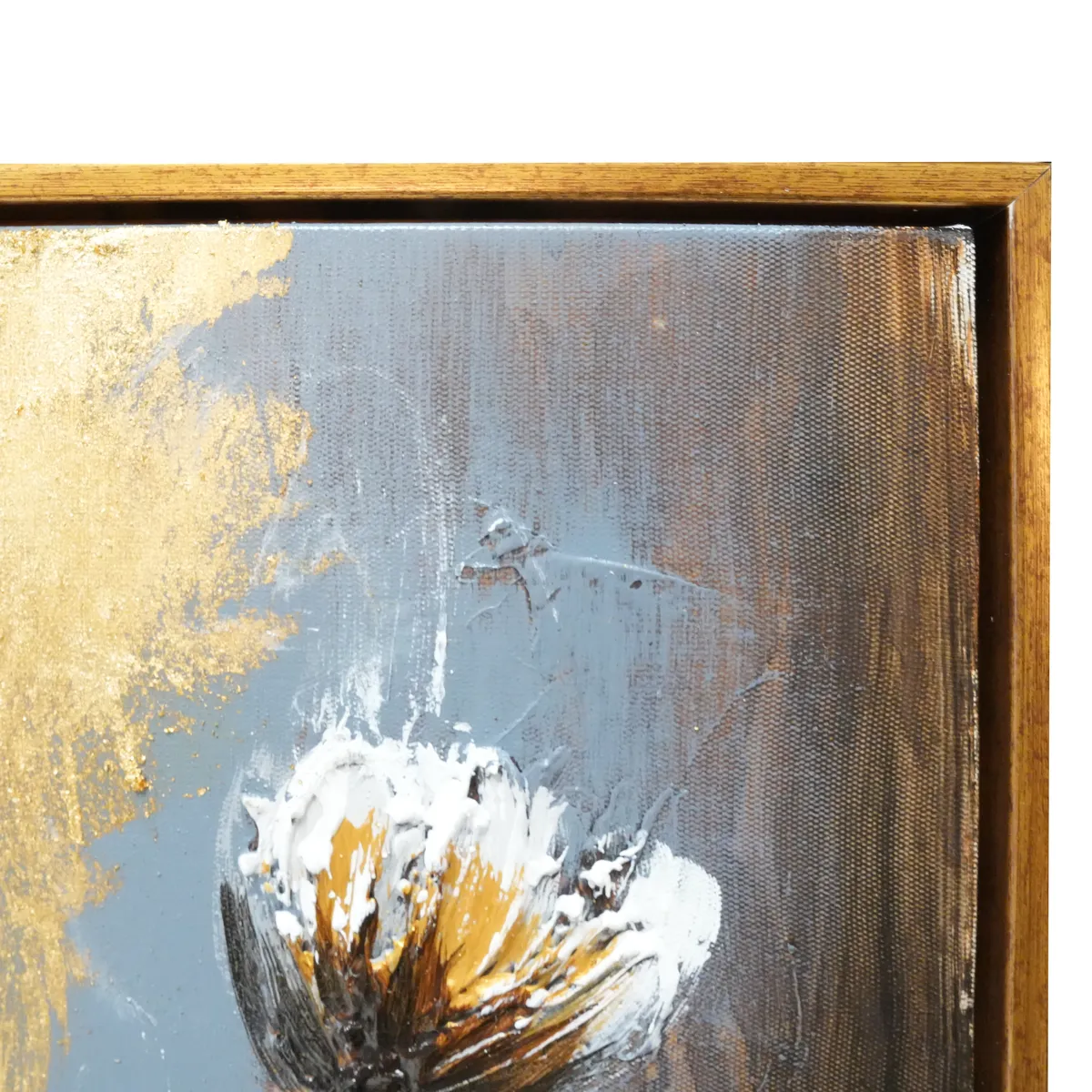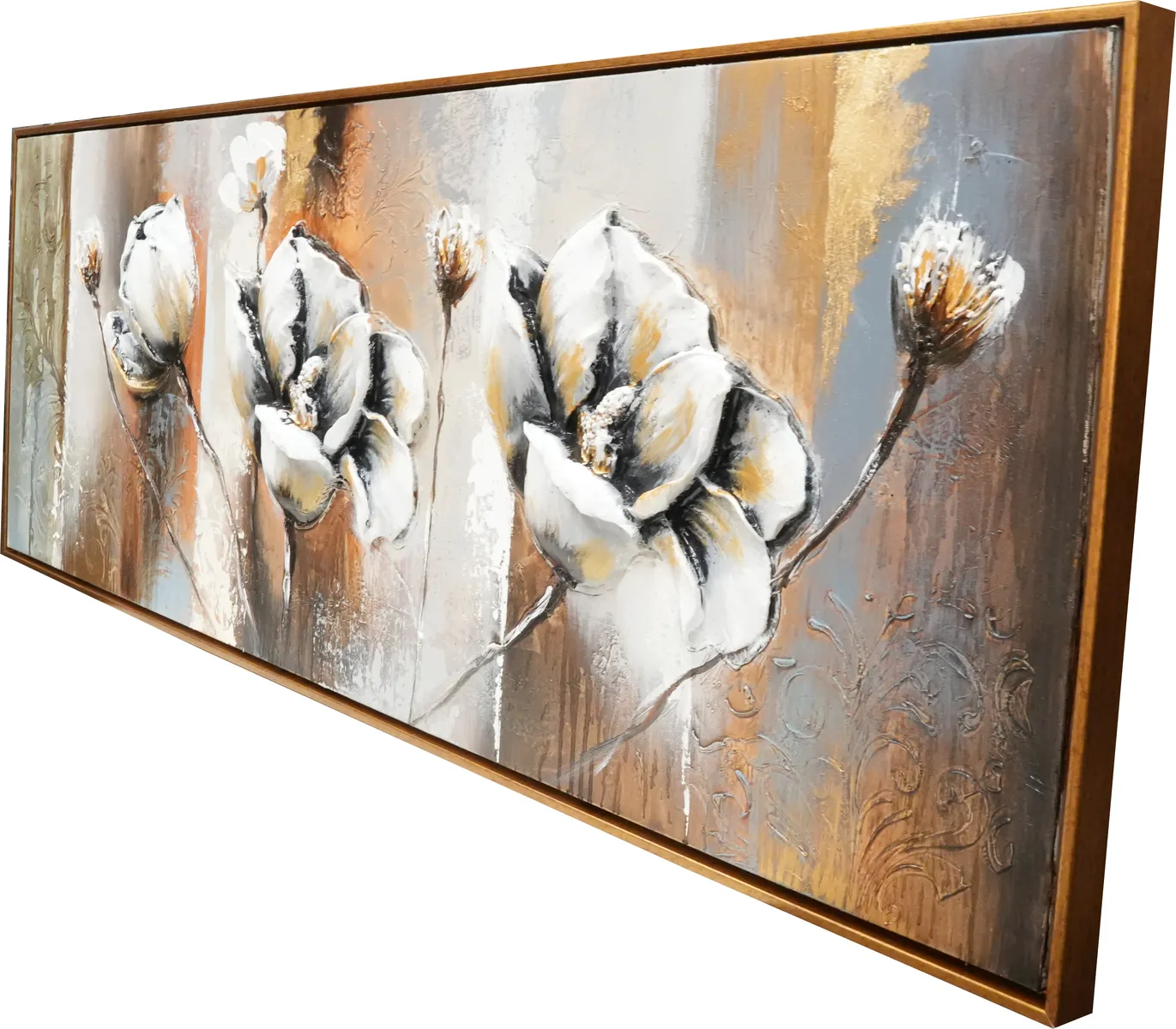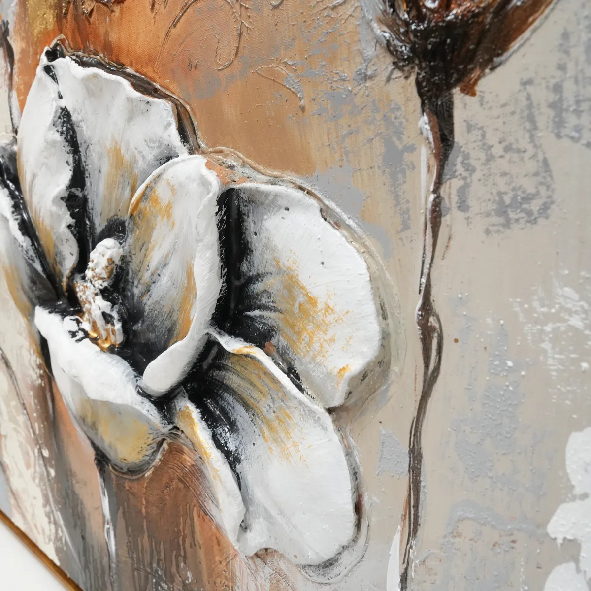 Oljemaleri med motivet av vakre lyse blomster på en fantastisk varm bakgrunn med både grønne, oransje toner og gullblader. Blomstene er støpt i noe akryl lignende materiale for å få en dypere og mer livlig følelse, 3D. Deretter håndmalt, et utrolig vakkert verk.