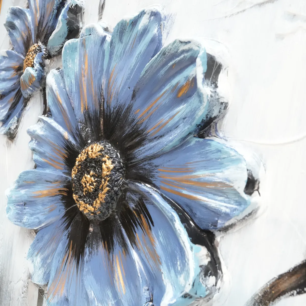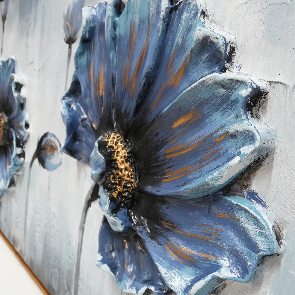 Vakkert oljemaleri av blomster i fine blå nyanser med gulldetaljer. Blomstene er støpt i noe akryllignende materiale for å få en mer dyp og levende følelse, 3D.