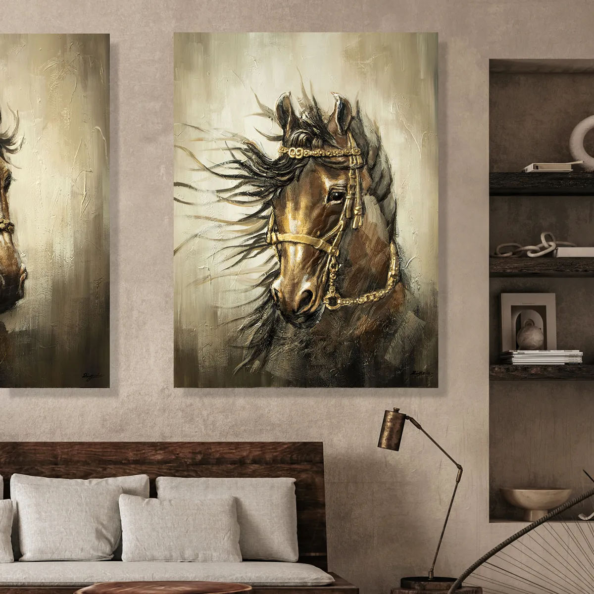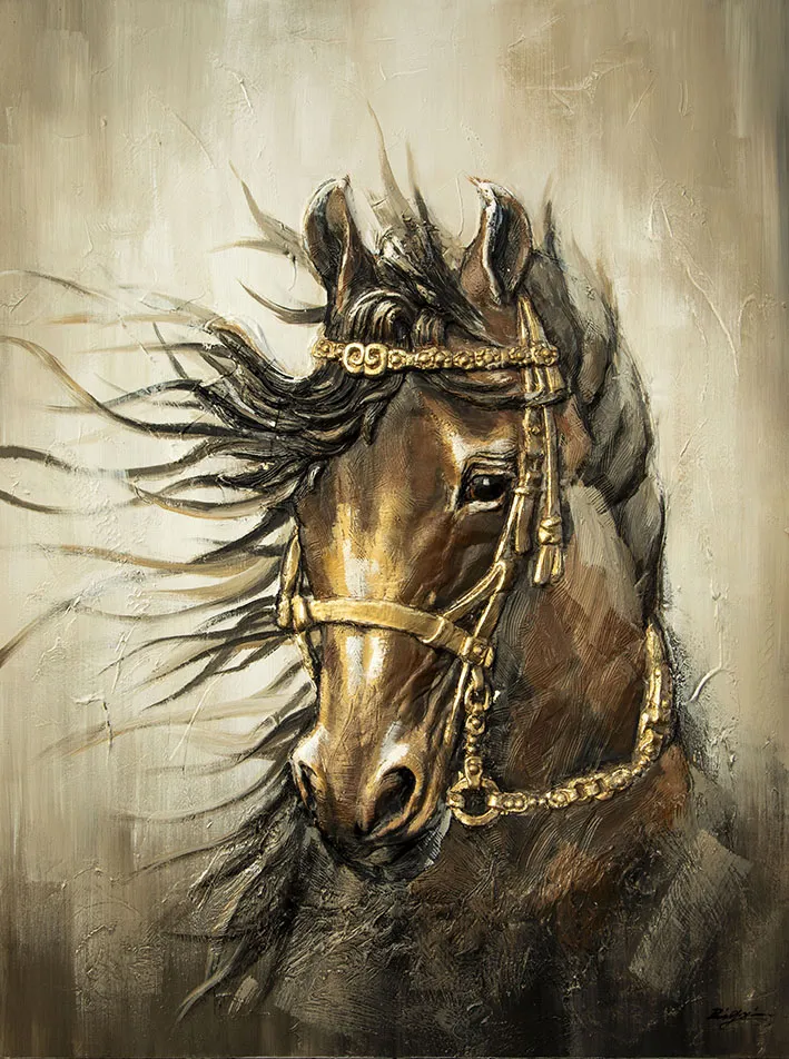 Fint oljemaleri av en vakker hest hvor manken beveger seg i vinden. Hesten er støpt i noe akryllignende materiale for å få en mer dyp og levende følelse, 3D.