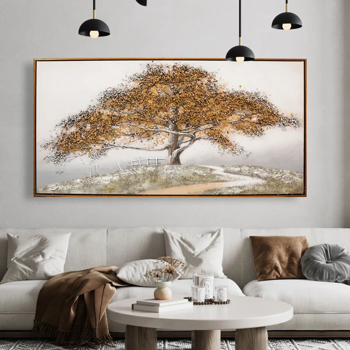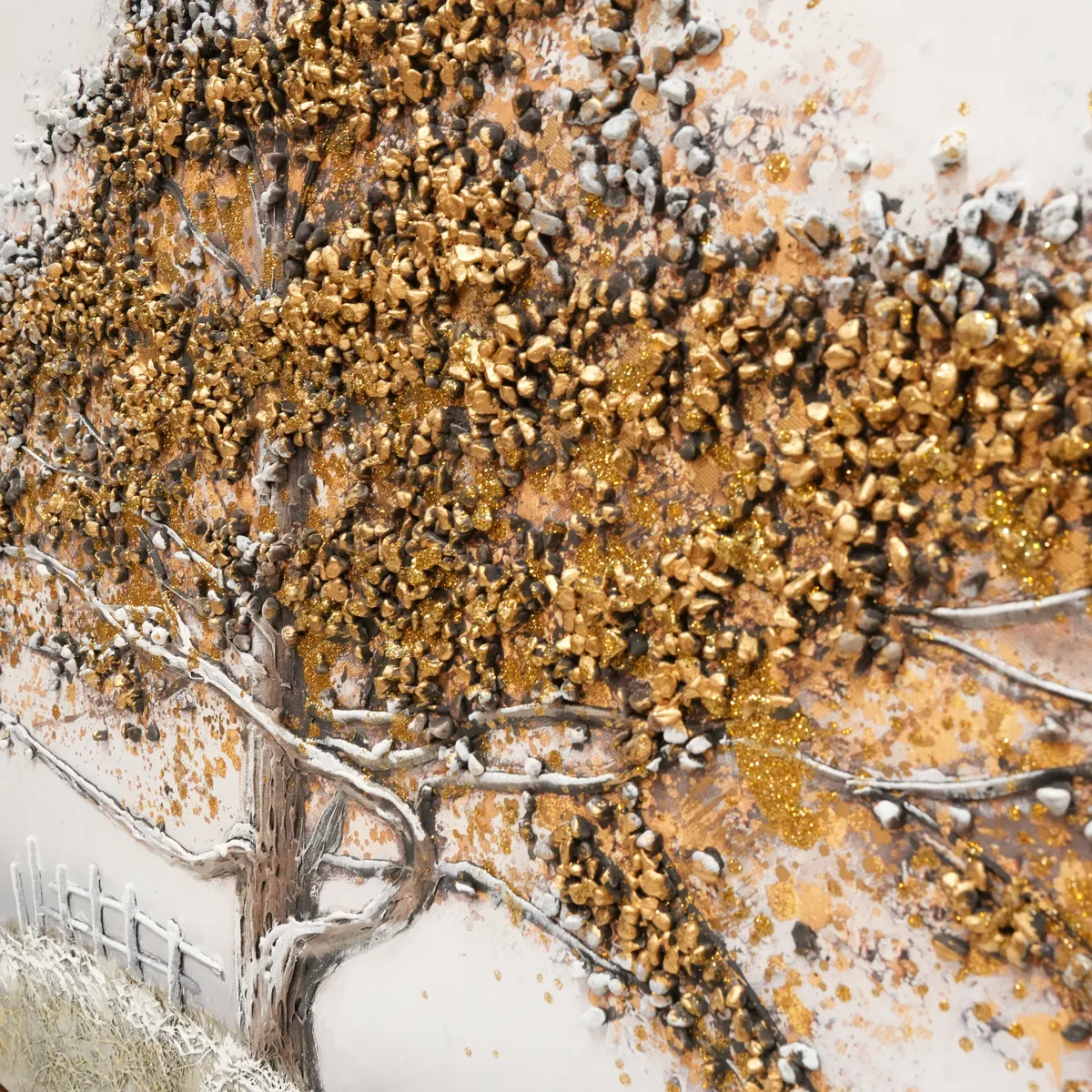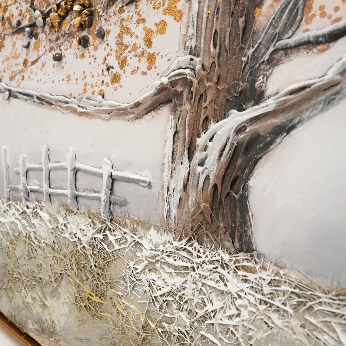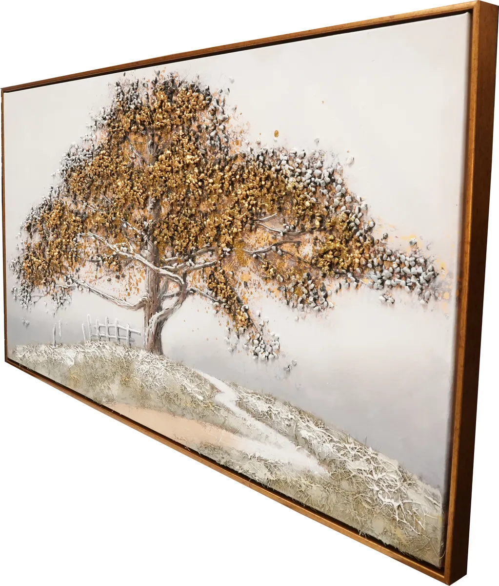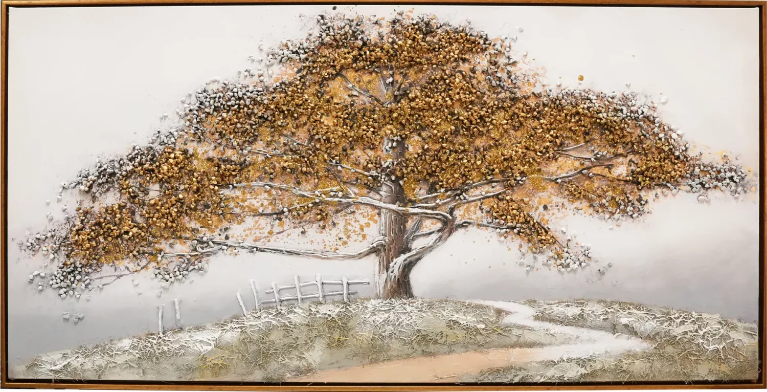 Vakkert oljemaleri av en sti opp en bakke mot et stort gammelt eiketre. Med ekte kjegler limes steiner og perler i kronen på treet for å få en mer dyp og levende følelse, 3D.