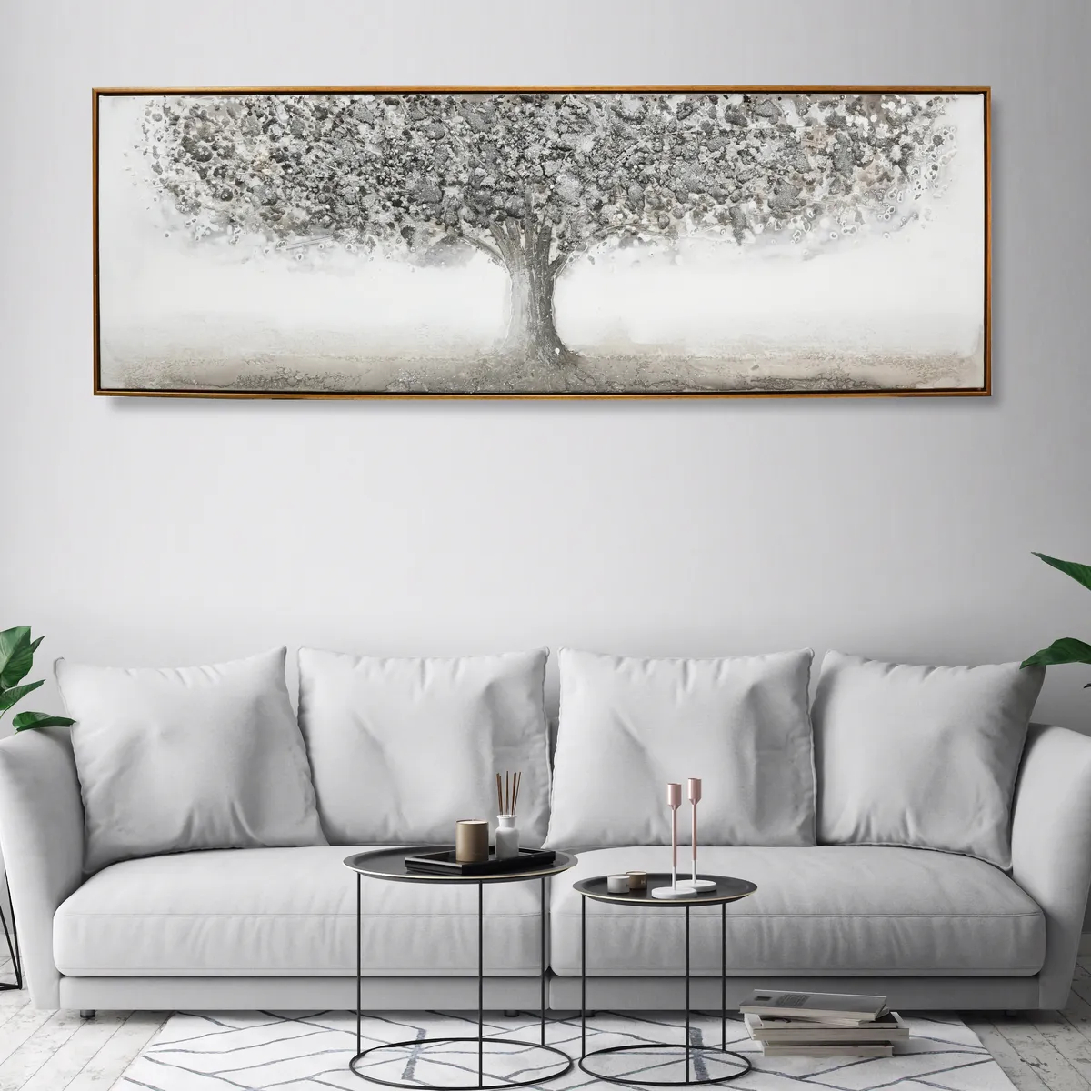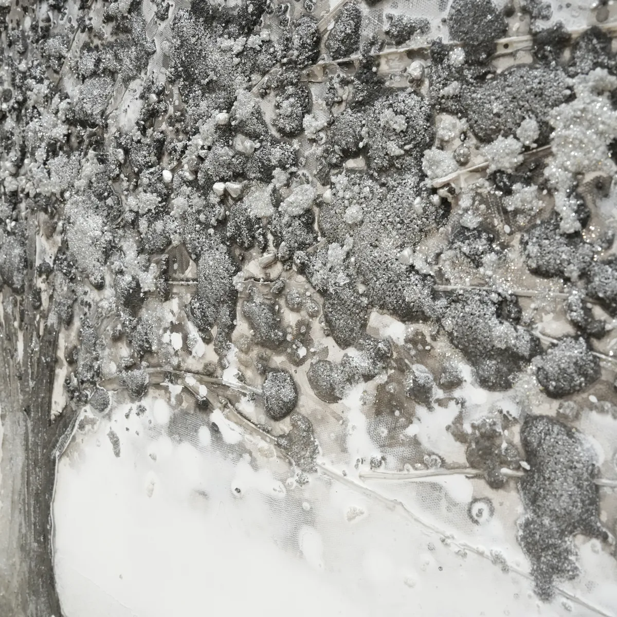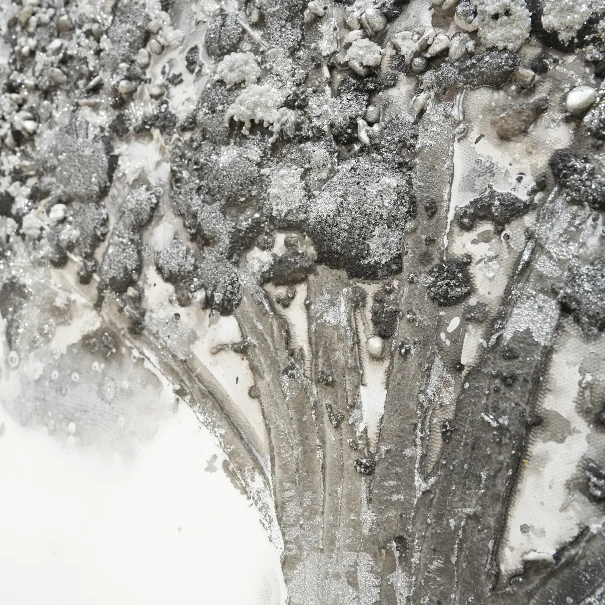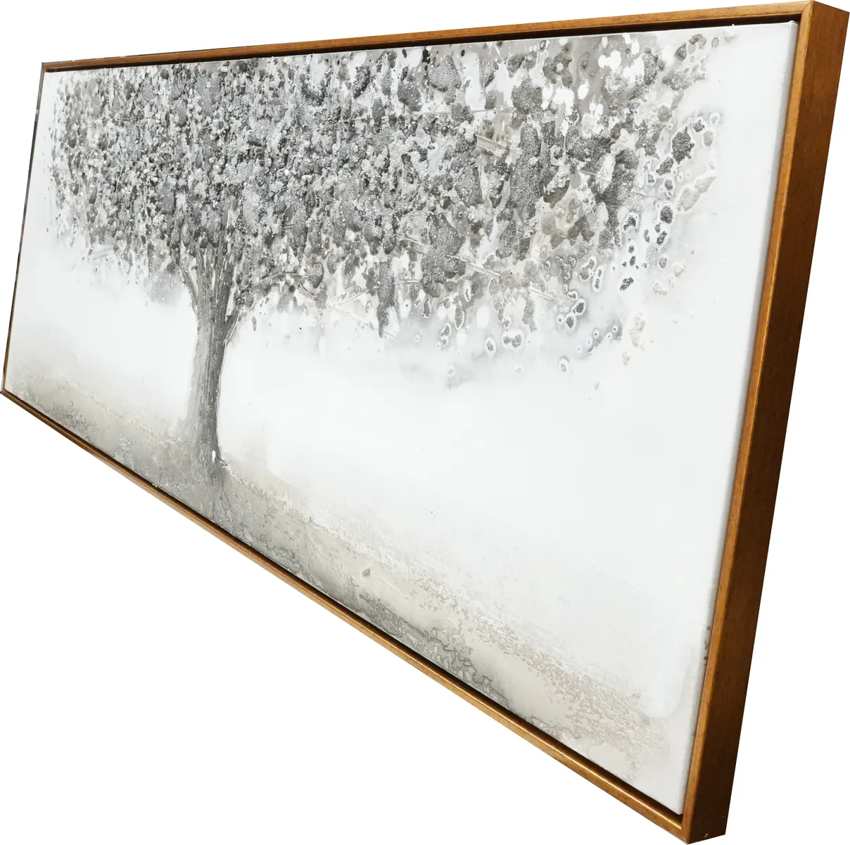 Utrolig vakkert oljemaleri. Stilig med et tre i sølv og grå nyanser og detaljer med glitter. Mange små steiner og kuler i trekronen for å få mer dybde og en mer levende følelse, 3D.