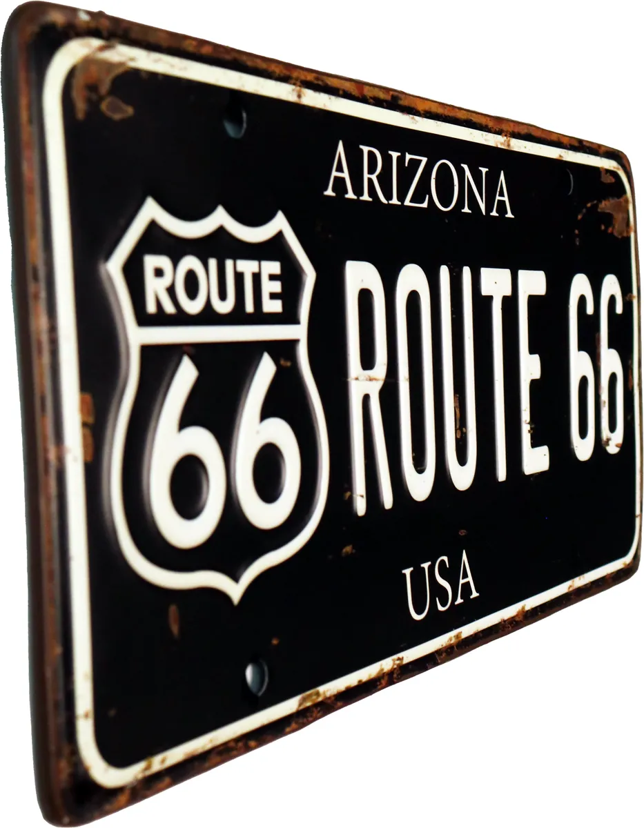 Metallbilde som ser ut som en gammel lisensplate med teksten 'Arizona, Route 66 USA”. Perfekt for samlingen av retro skilter, de som liker skrue i garasjen, Amerika, USA, motorsykler, MC, gamle biler, retro nummerskilt og pynt for garasjen og hjemmet, for de som liker gamle retro reklame plakater og nostalgi.