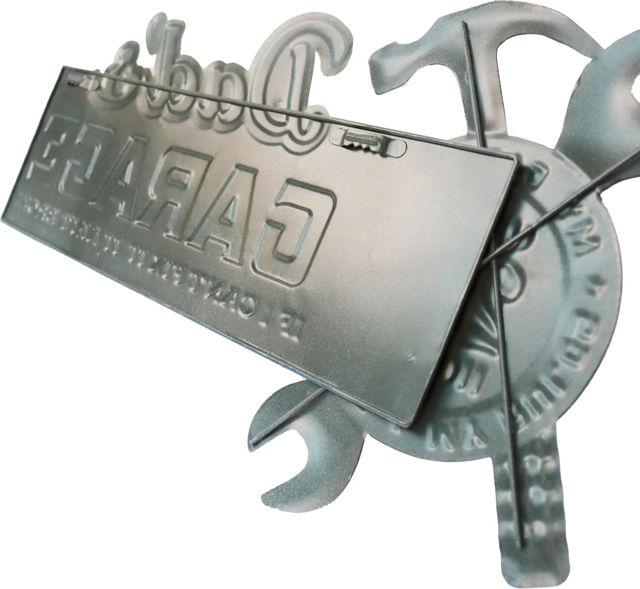 Metallbilde med teksten 'Dad´s Garage, if I can´t fix it, it ain´t broke, My garage my tools my rules'. Bilde av skiftenøkkel og hammer. Perfekt for de som liker biler, interiør i garasjen, eller for de som liker gamle retro plakater.