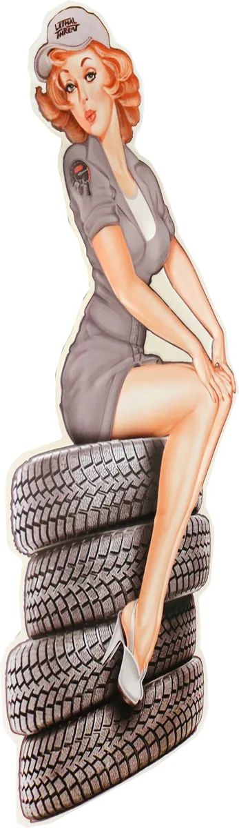 Metallbilde med en stilig Pin up dame i sexy mekanikerklær som sitter på stablet dekk. Perfekt for samlingen av retro skilter, de som liker Amerika, gamle biler, pynt for garasjen og hjemmedekorasjon hjemmet, for de som liker gamle retro reklame plakater og nostalgi.