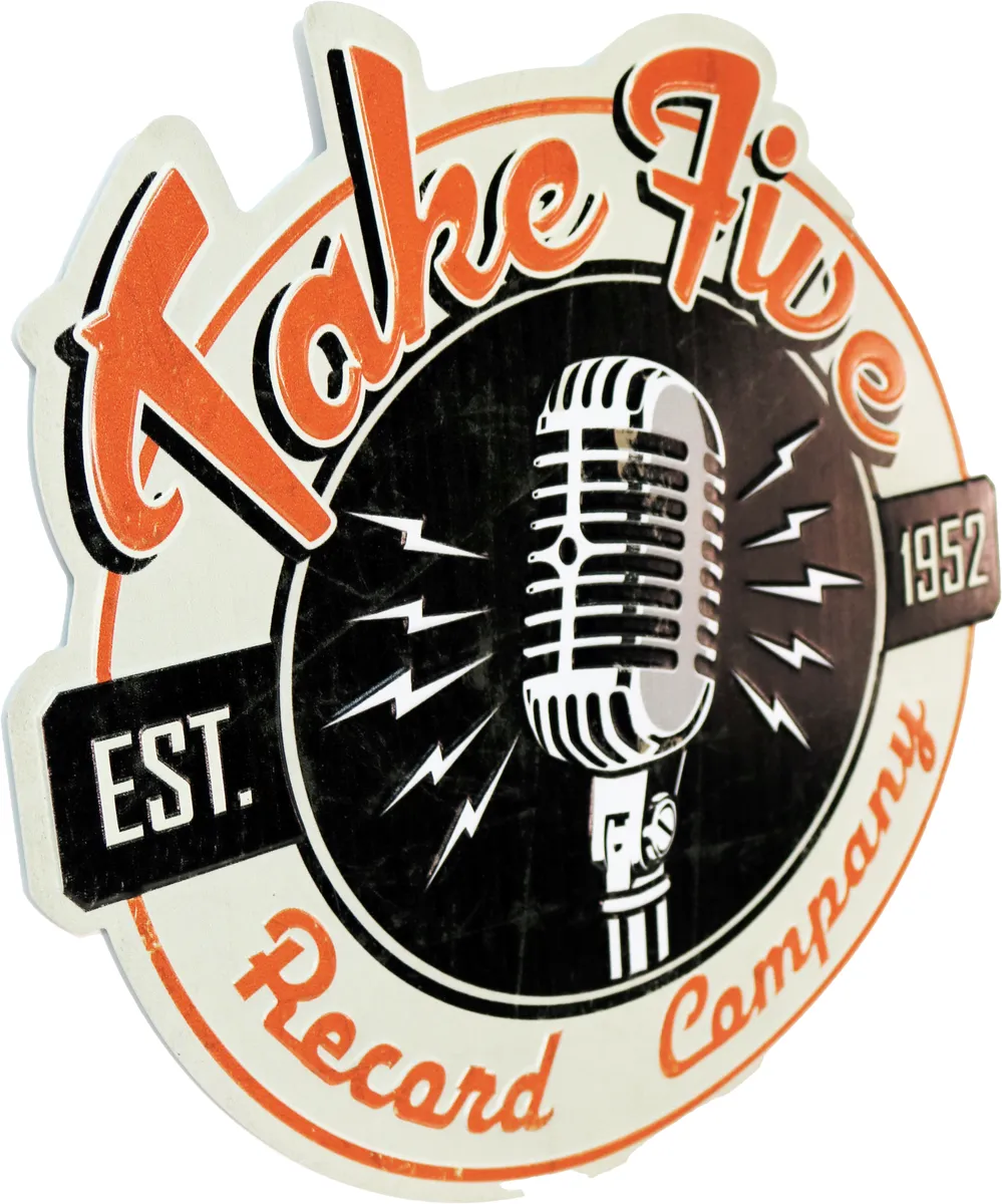 Metallbilde 3D med teksten 'TTake Five record company' og et bilde av en gammel mikrofon. Perfekt for de som liker å synge, musikk, oldies, stilige møbler til baren, garasjen eller hjemmet, eller for de som liker gamle retro plakater.